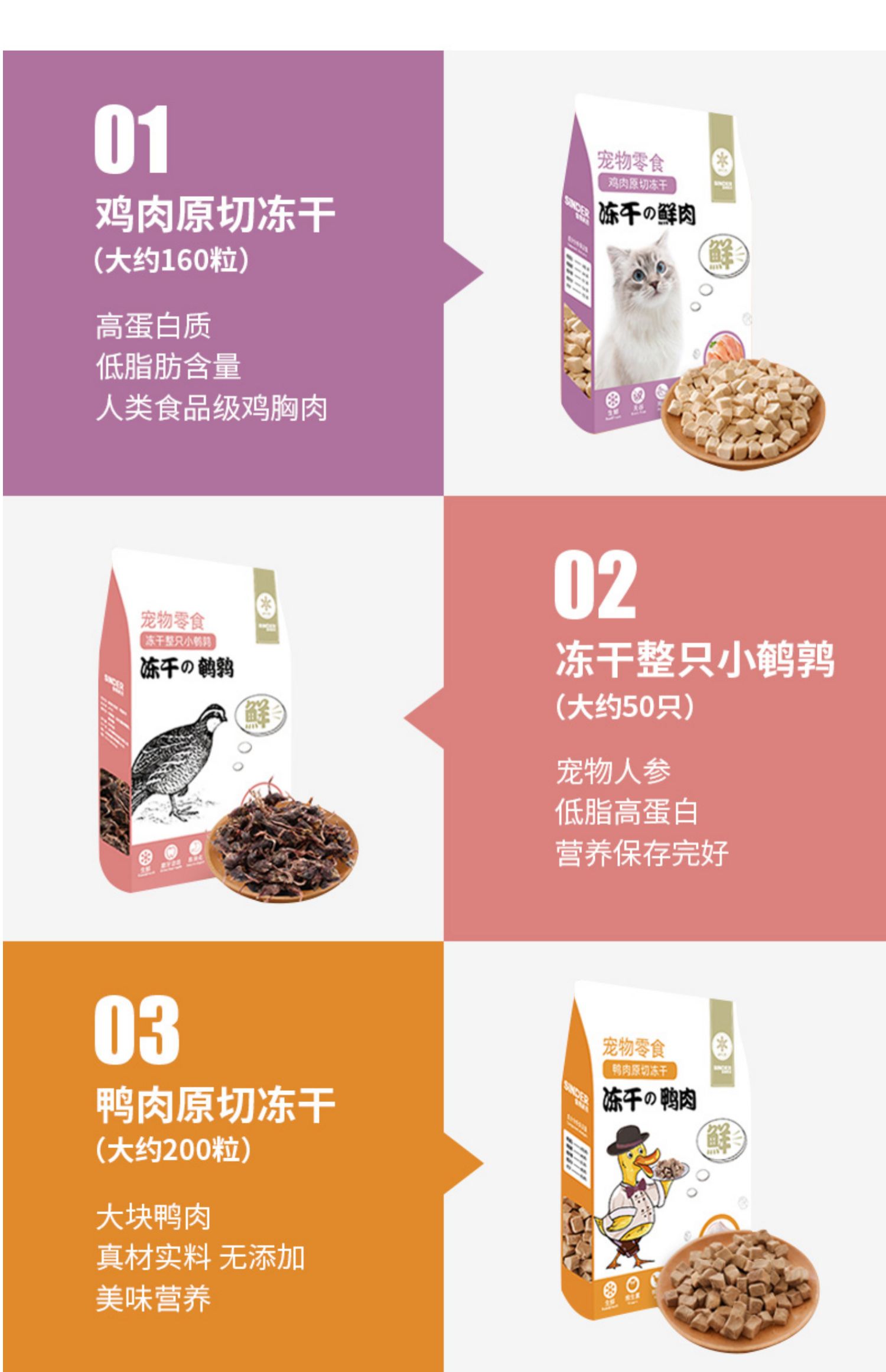 猫咪用冻干鲜肉,没有添加剂,优质原材料,食物新鲜,内质鲜美,细腻,高蛋白,包装有封条,看起来就很精致,多种口味选择,抓紧抢购!!