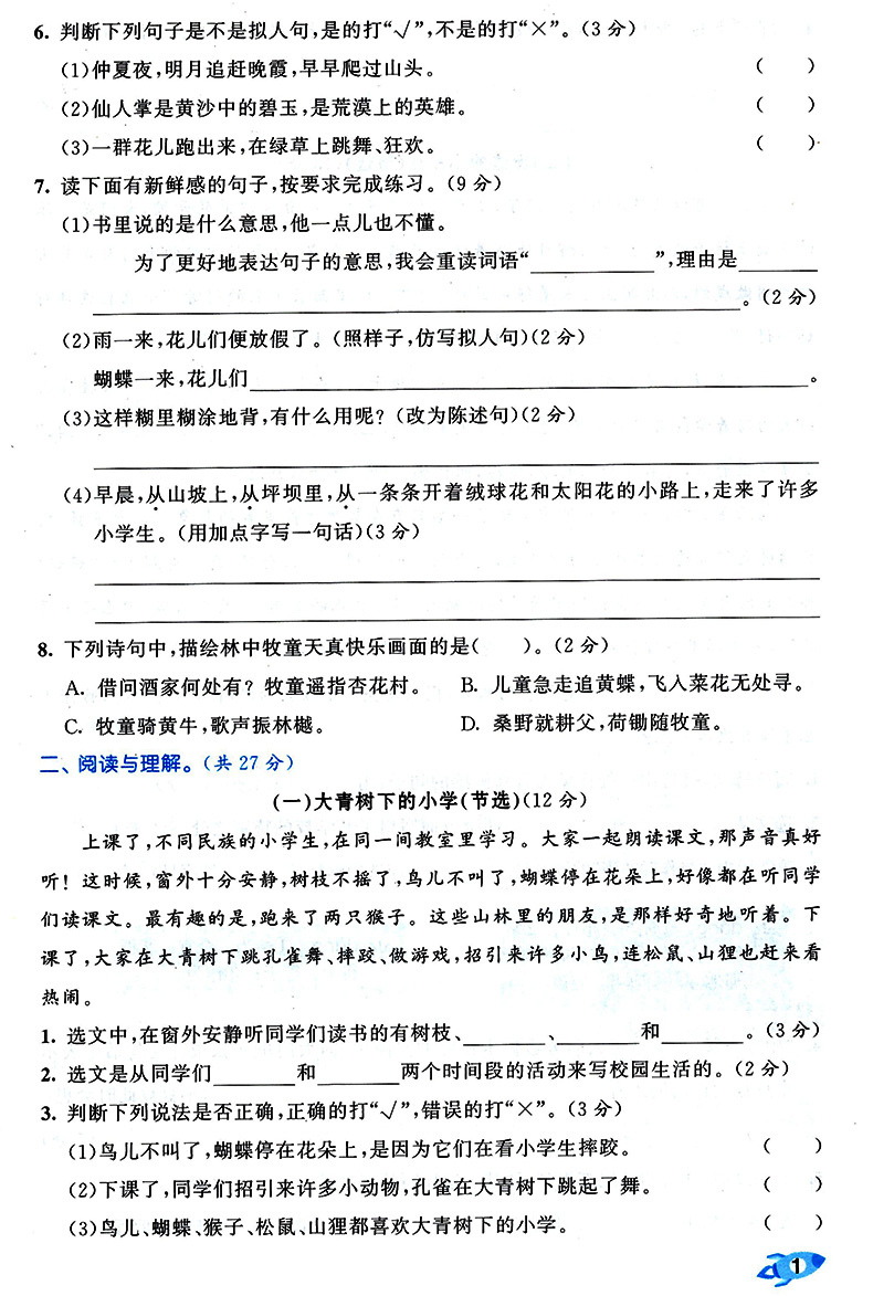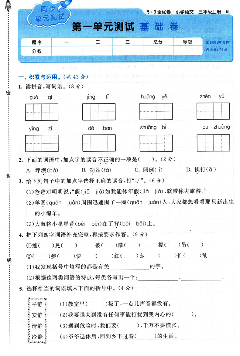 2020春53全优卷,三年级上册,语文部编人教版,小学三年级同步练习册全优全能练考卷,同步测试卷,单元期中期末测试卷练习册