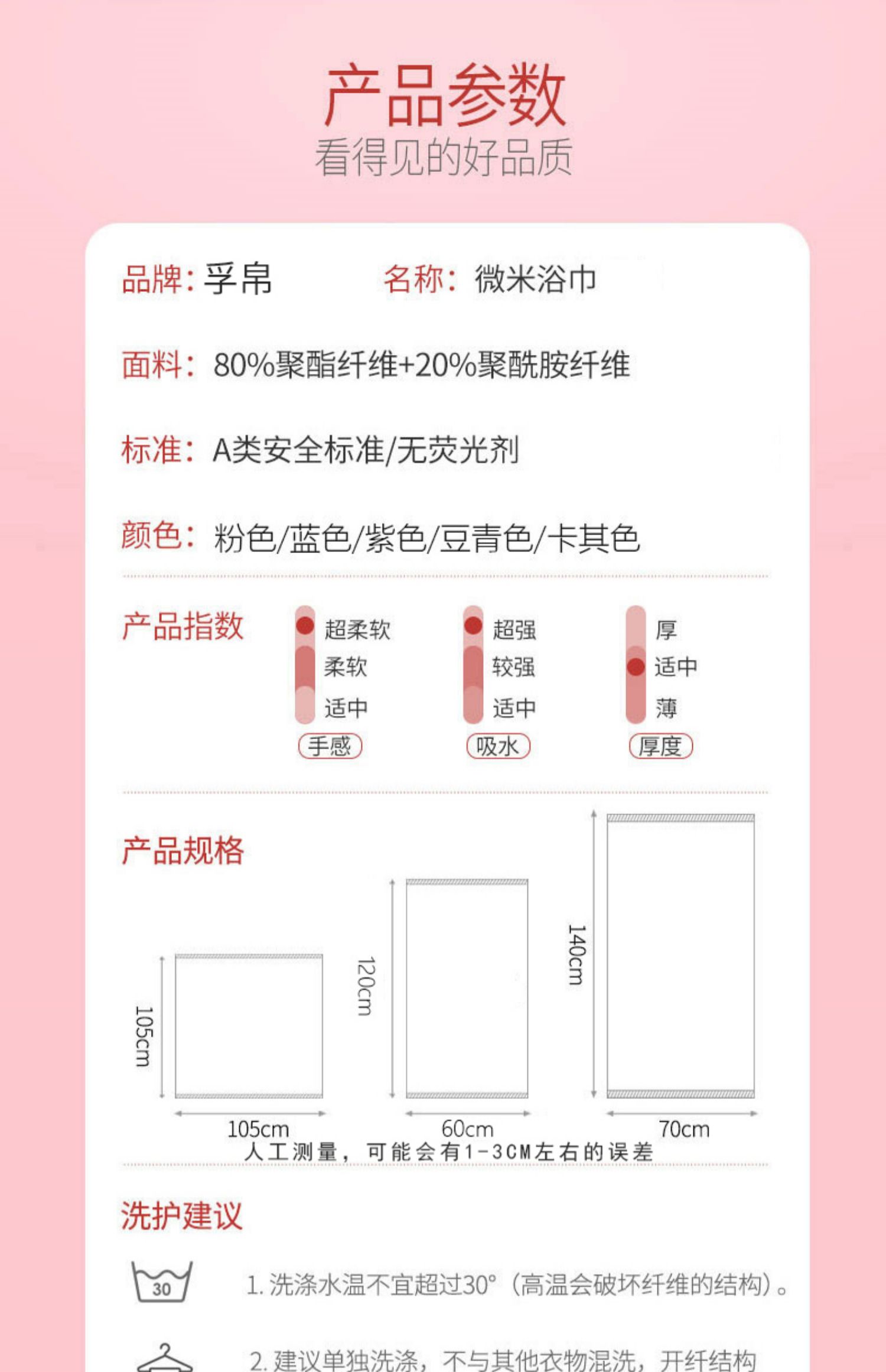 超柔微米浴巾,权威质检,品质保证,可以吃到嘴里的浴巾,7倍吸水!A类标准,成人小宝宝都可以放心使用,真的是软的不行,7倍超强吸水力,瞬吸速干,不掉色掉毛,经久耐用!