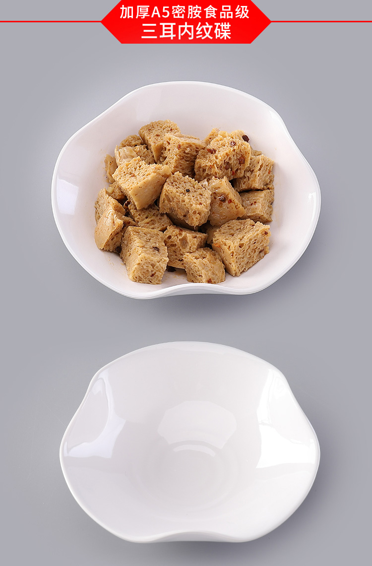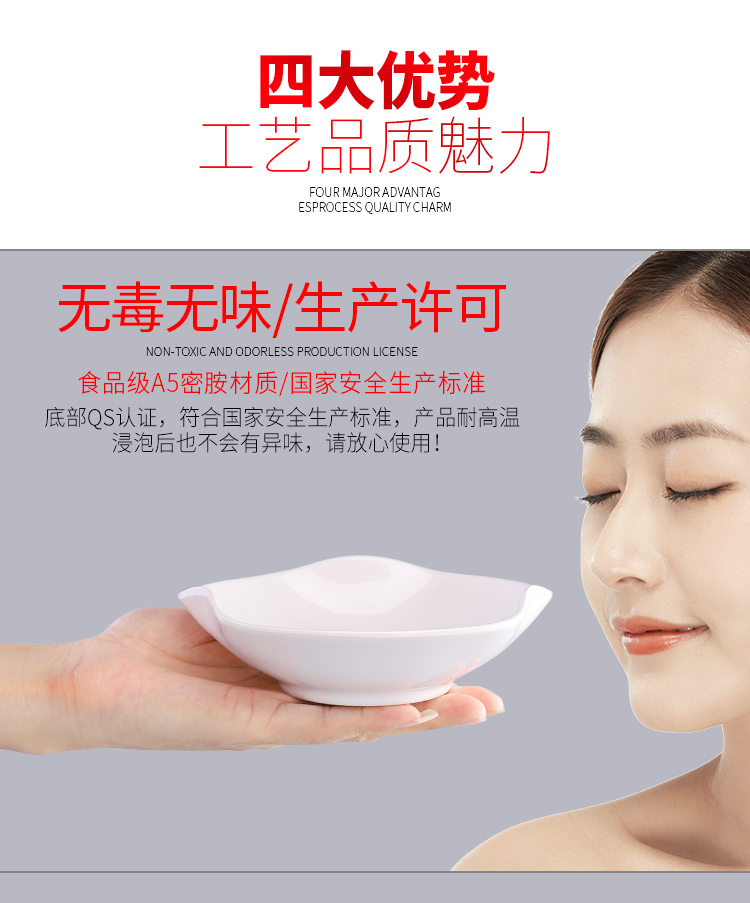 密胺小吃碟,精选密胺,匠心工艺,厚实耐摔,安全健康,无毒无味,四大优势,工艺品质魅力!