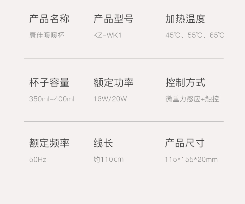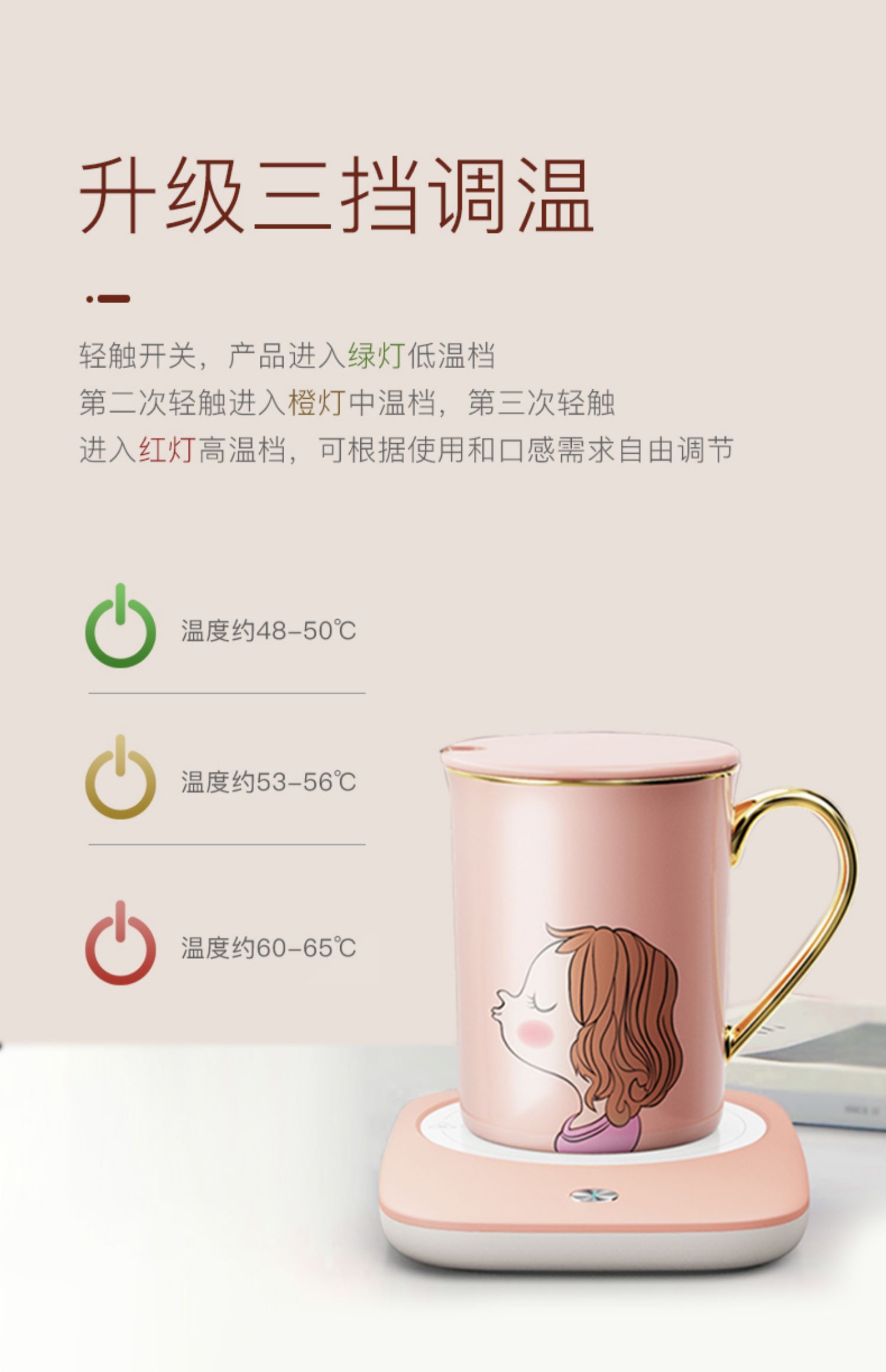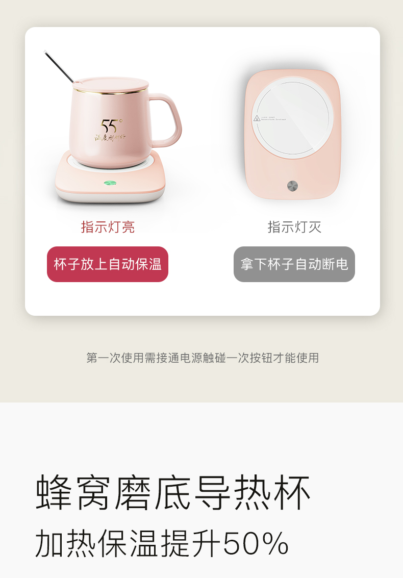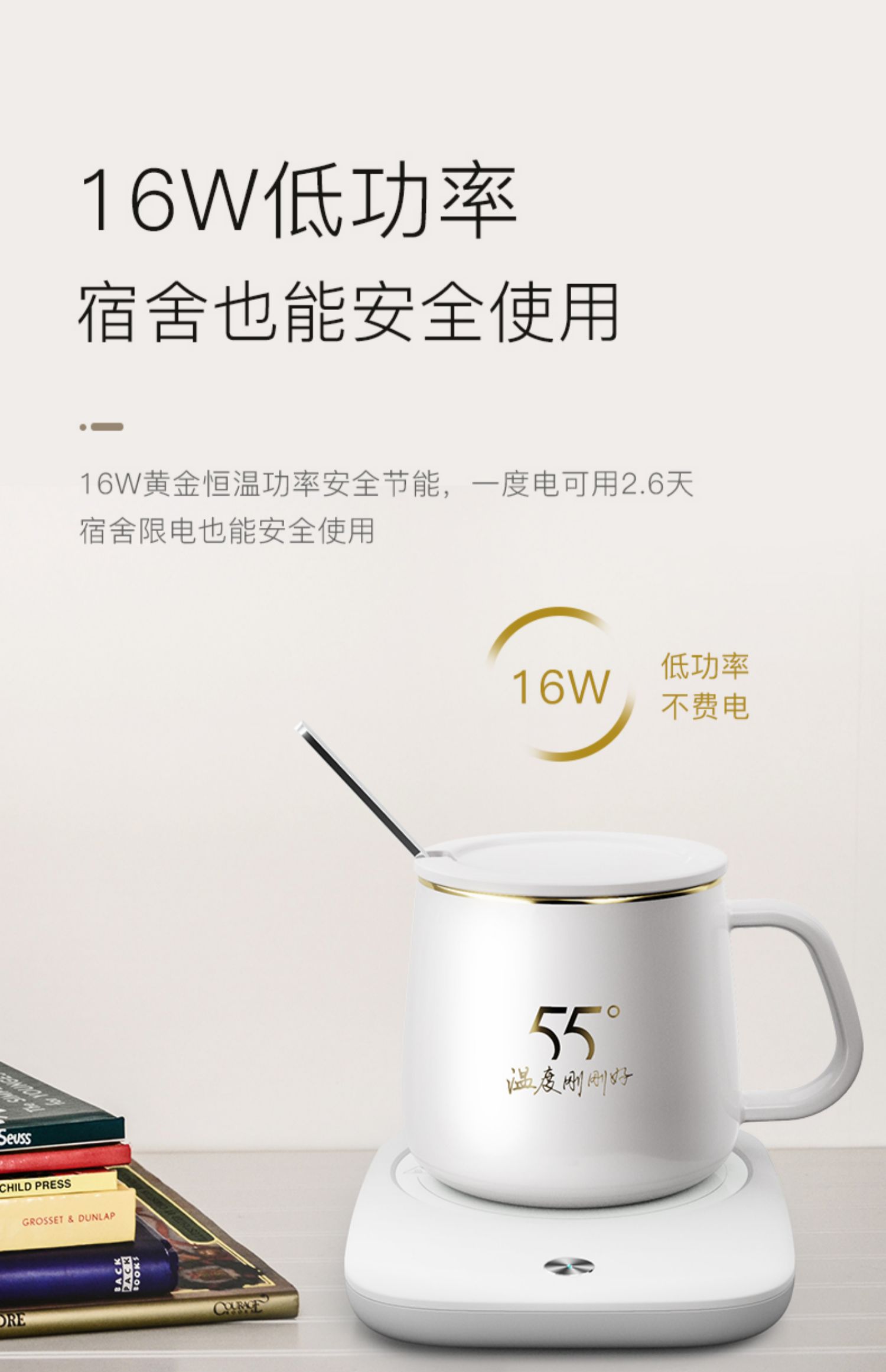 康佳品牌,自动微重力开关,触摸双操作,三种温度可调,低功率安全发热,空杯不干烧,恒温55度!泡红糖、热牛奶、泡蜂蜜,一键恒温,操作方便又省心!~