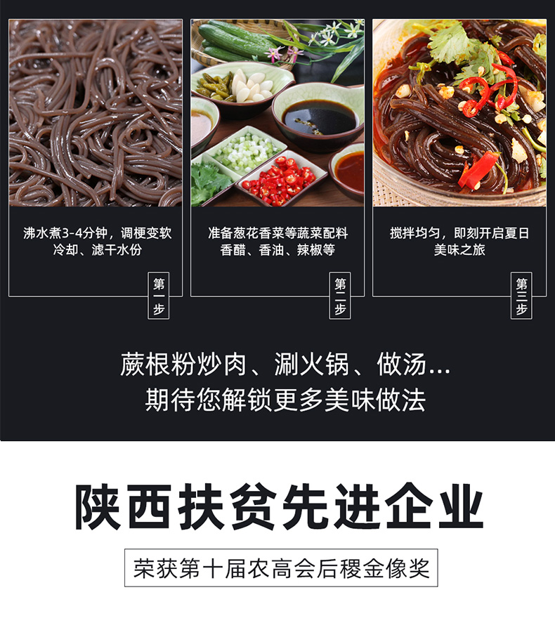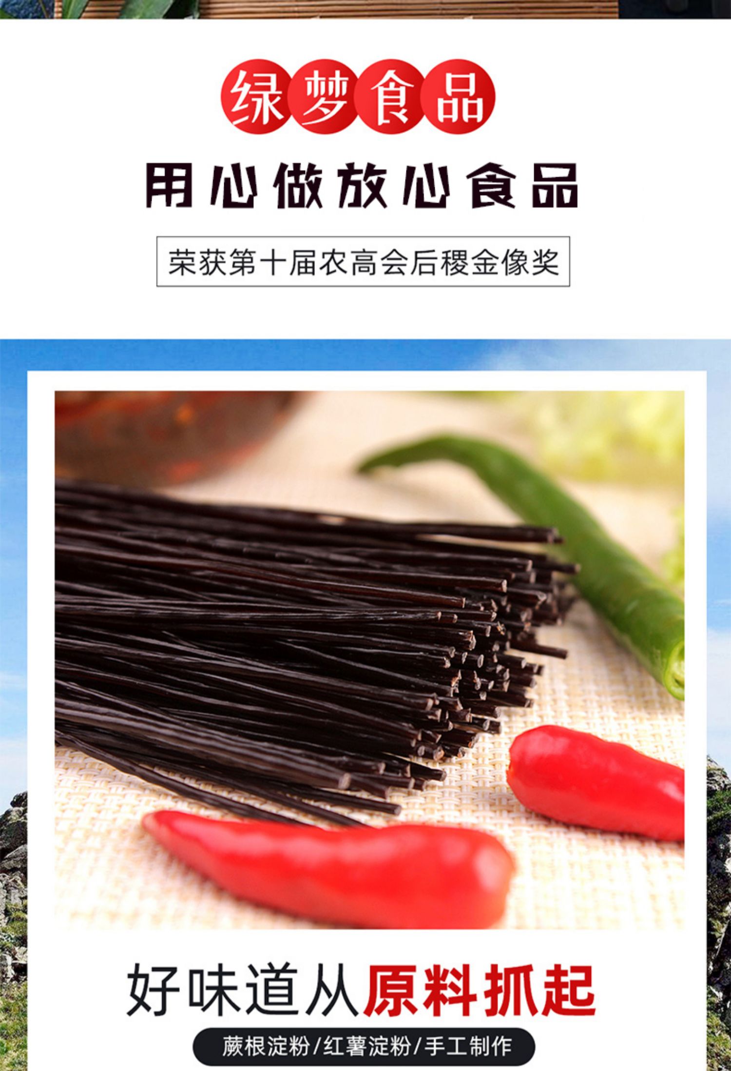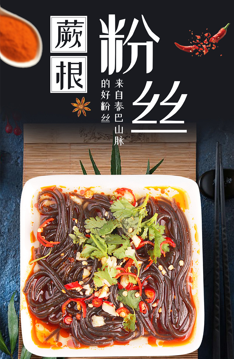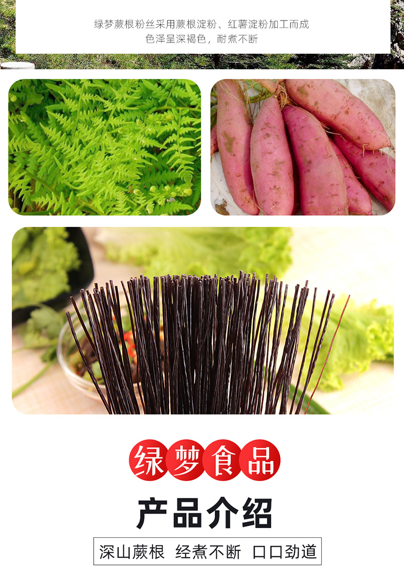 来自秦巴山脉的好粉丝,野生蕨根粉选用红薯和蕨根淀粉精致而成,纯绿色食品,呈深褐色久煮不断,柔韧Q弹,根根劲道,口感细腻,风味独特!
