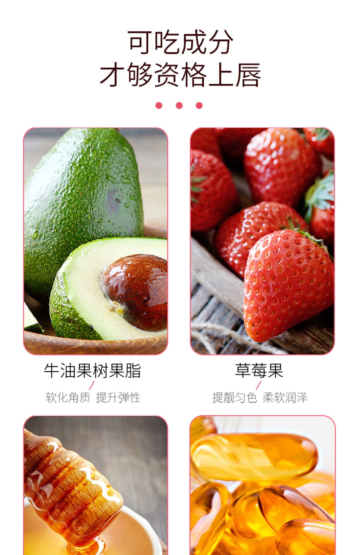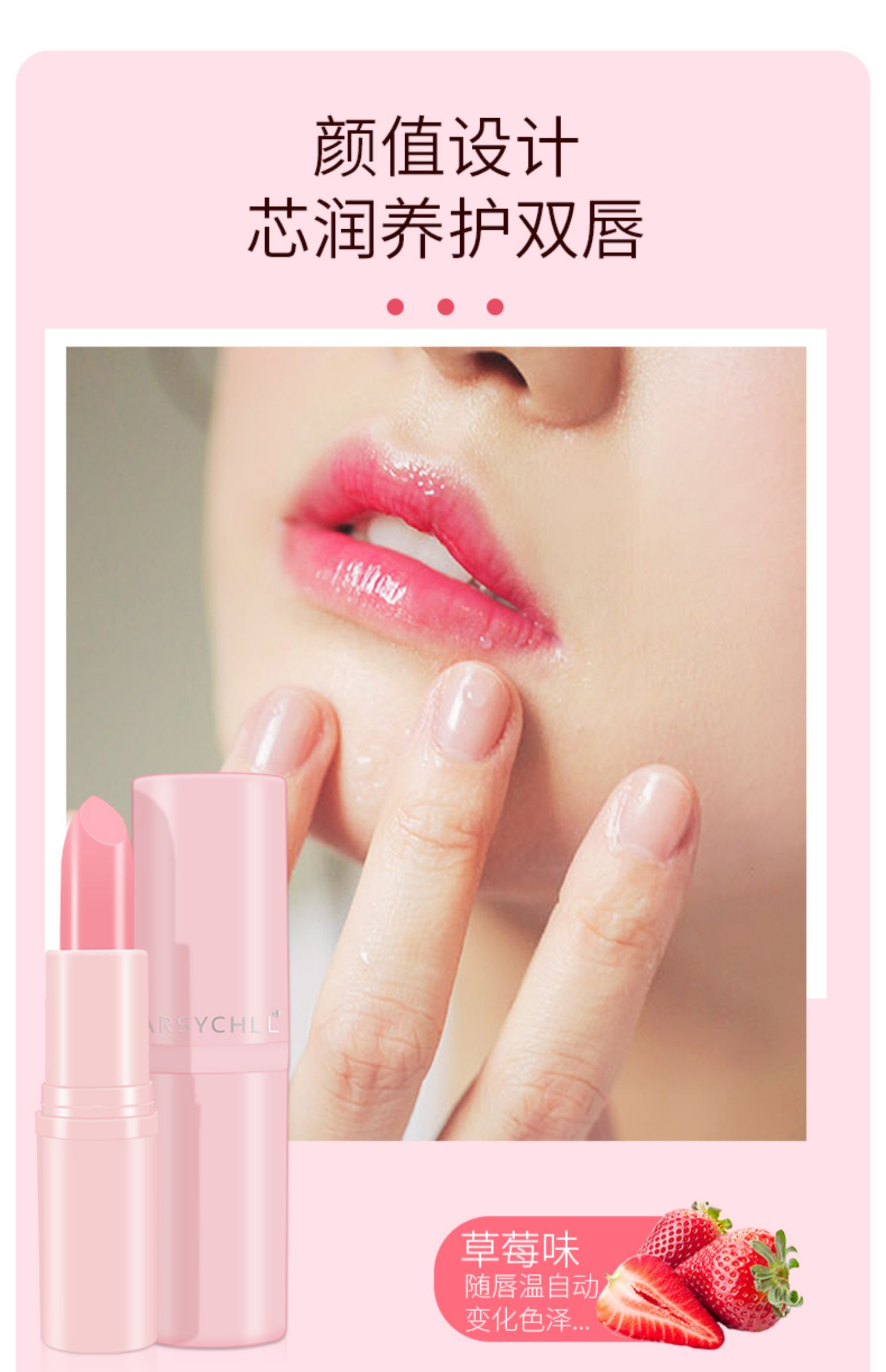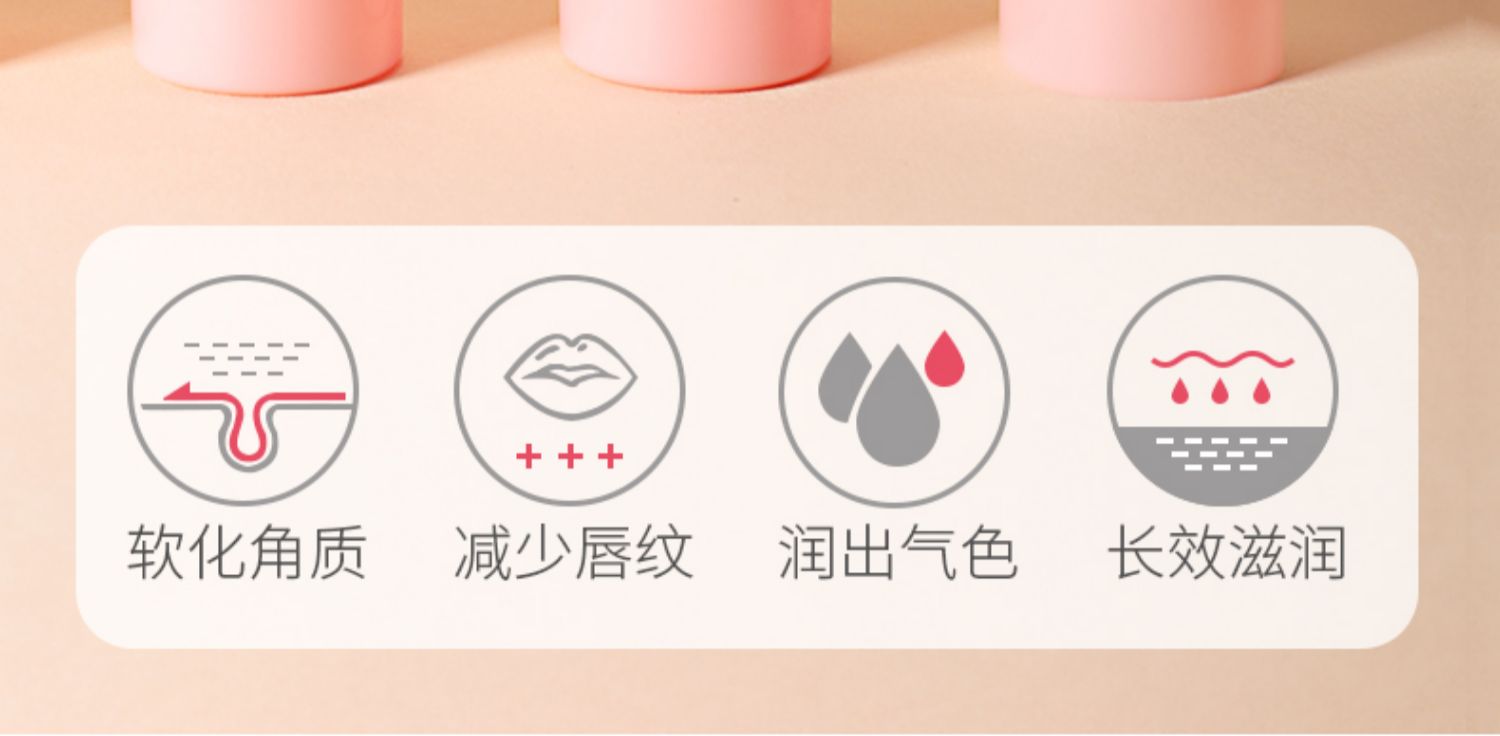 食用级安全配方,温感变色,保湿润养,软化角质,减少唇纹,提亮唇色,润而不腻,长效滋润,方便携带,国家认证,资质检测,质量放心,安心使用!