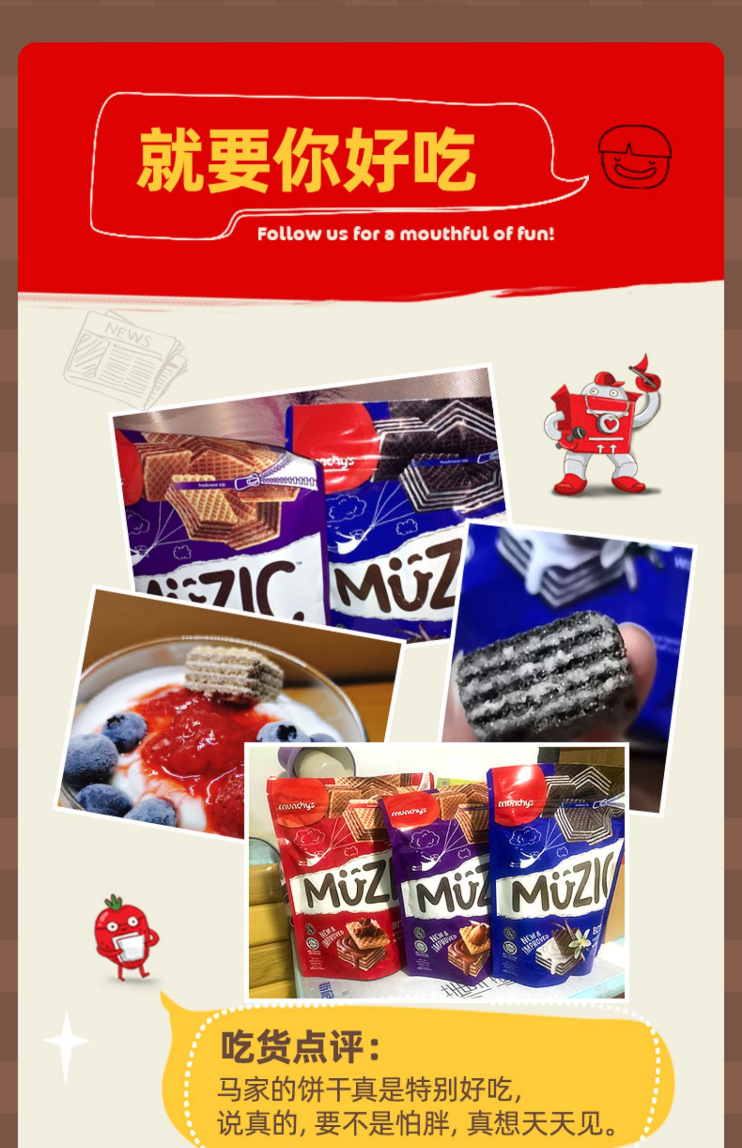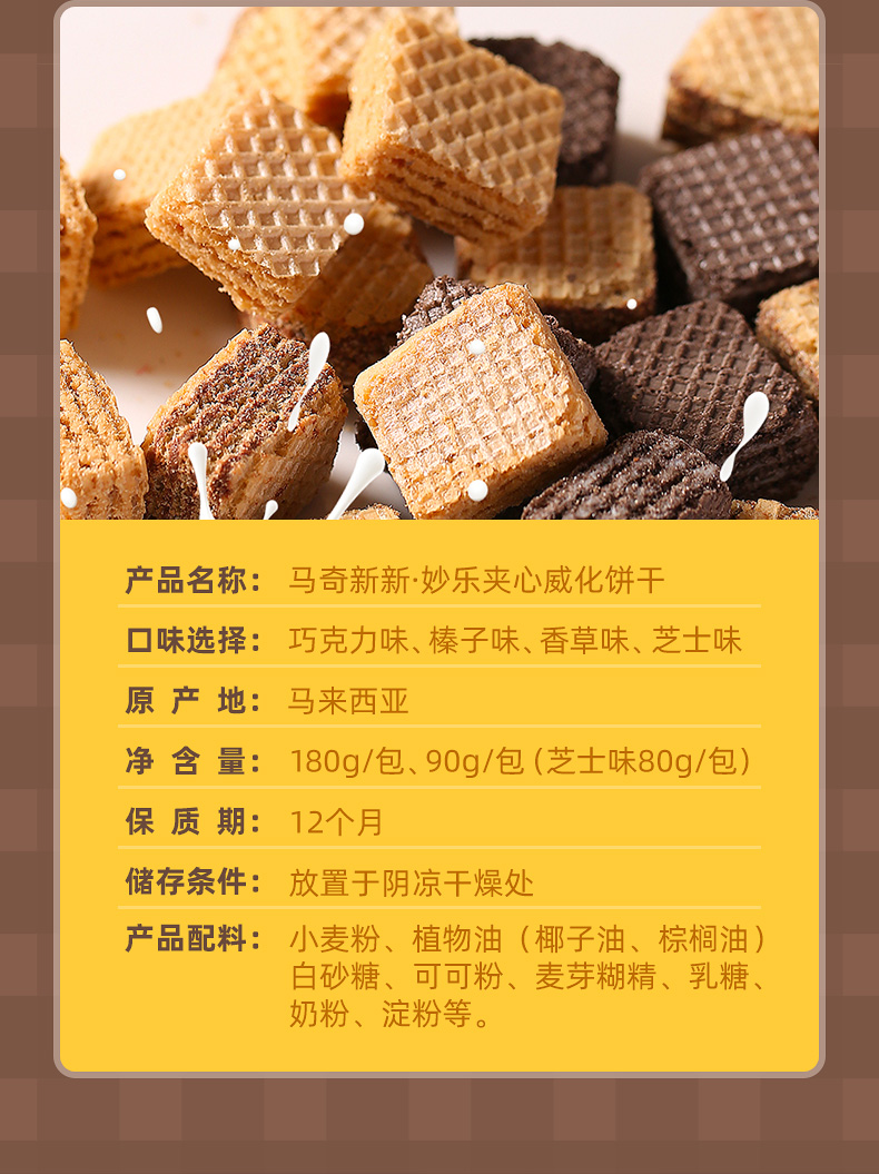 马来西亚畅销饼干品牌,麦德龙、沃尔玛等均有销售,进口威化饼,纯巧克力夹心,0反式脂肪,好吃不怕胖,味道超级好,宅家追剧必囤美食,一口你就爱上Ta~