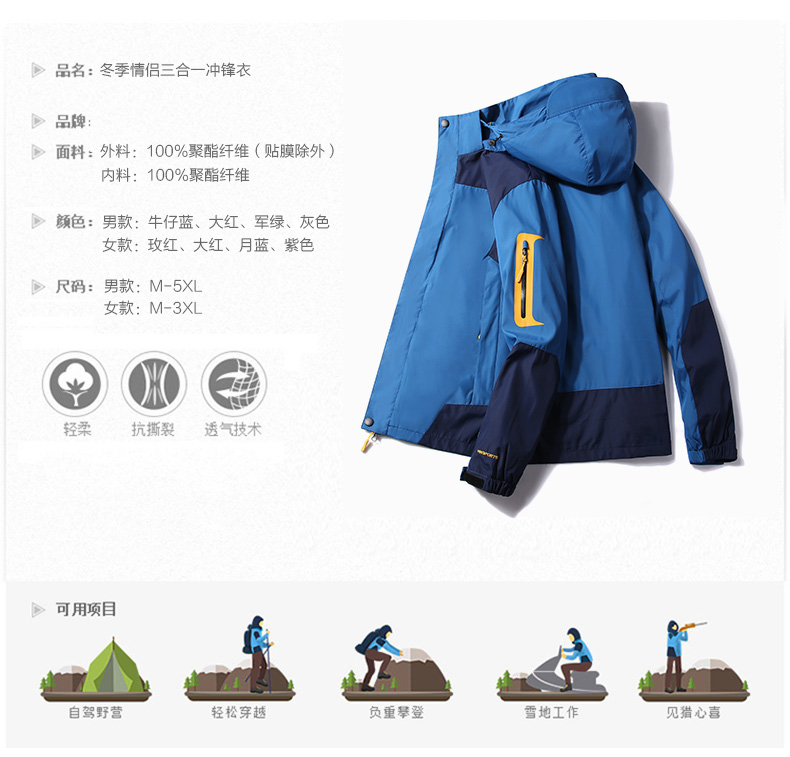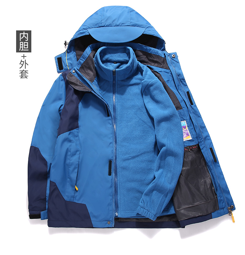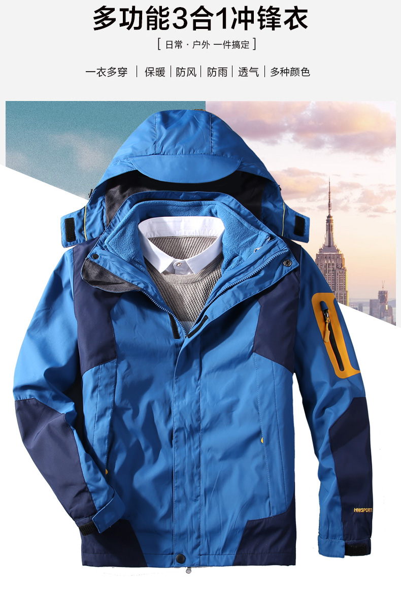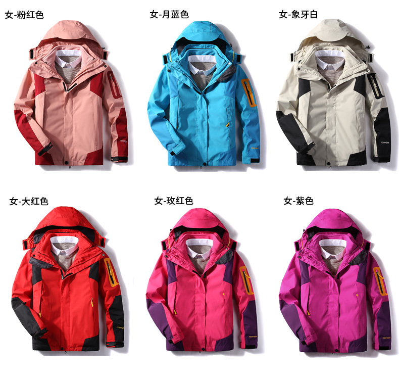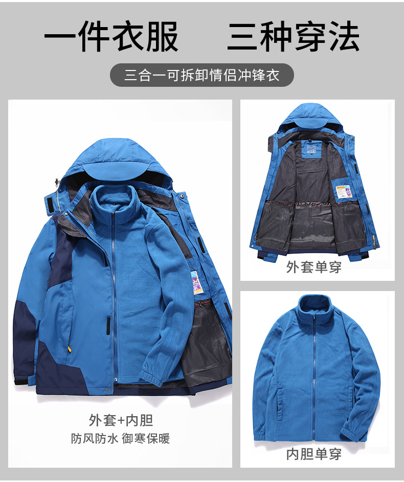 三合一冲锋衣,可拆卸单穿组合装,多变魅力个性释放,防水面料透气排湿,多款颜色可以选择。