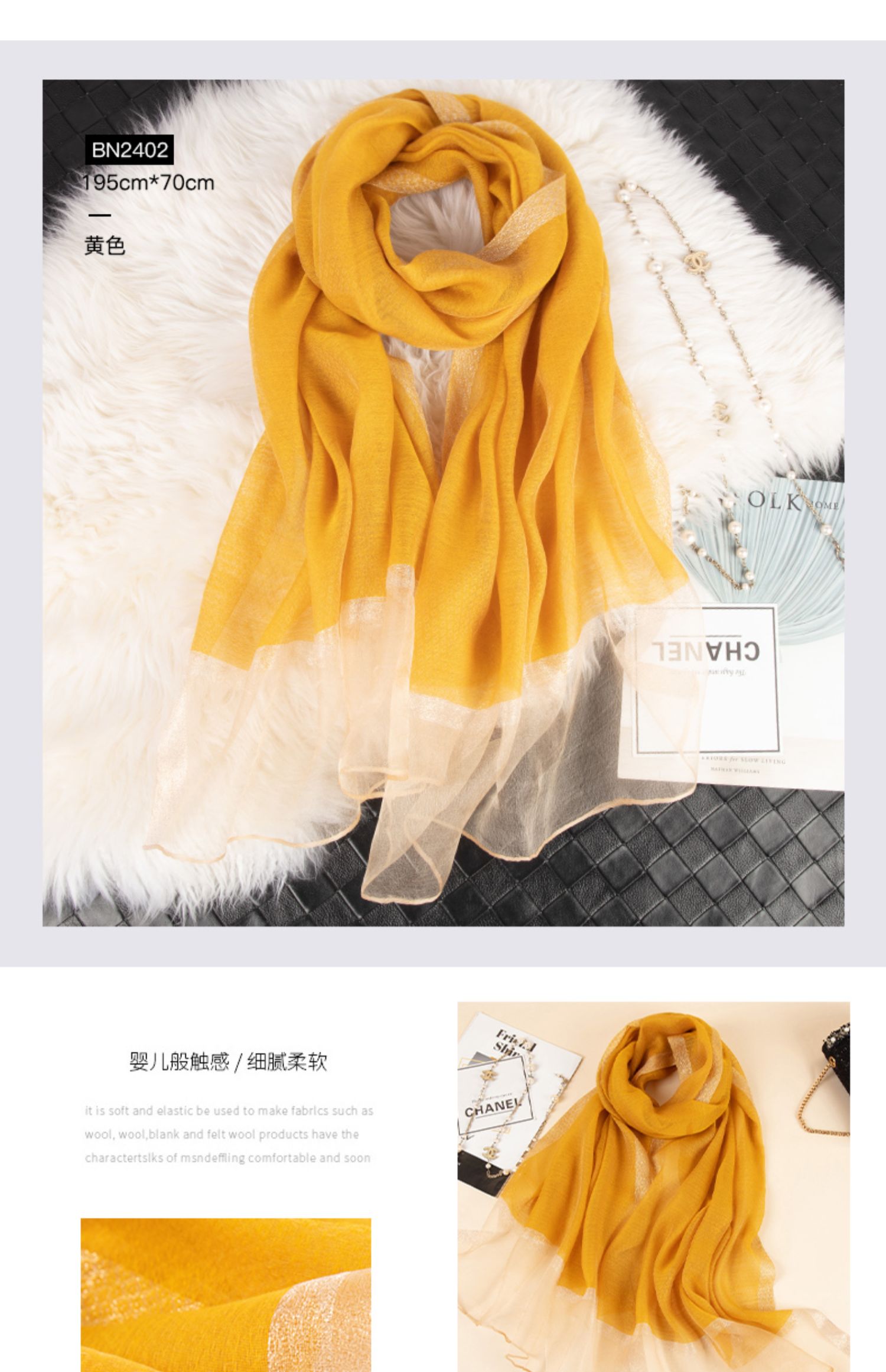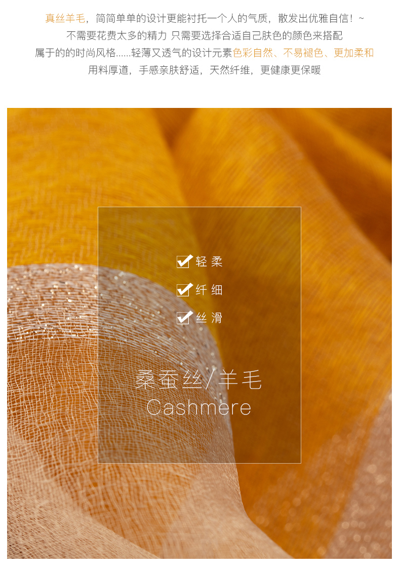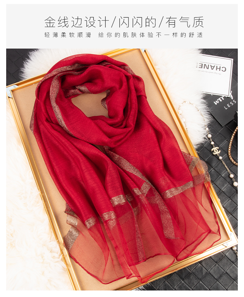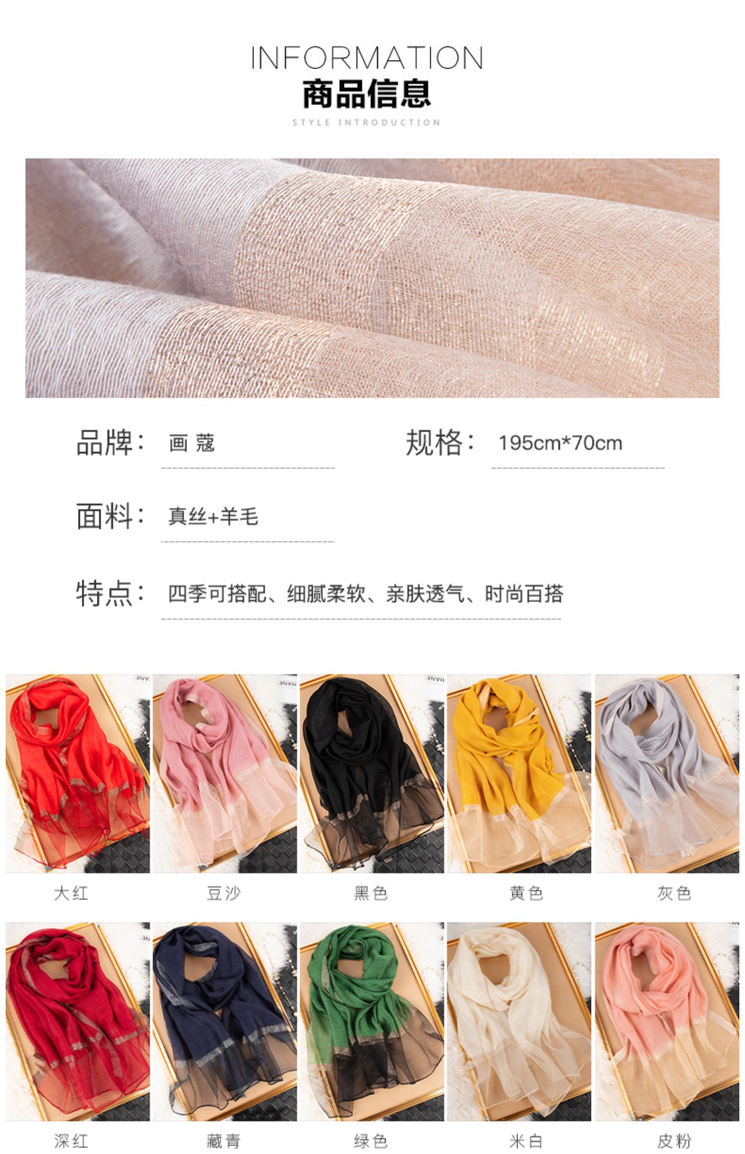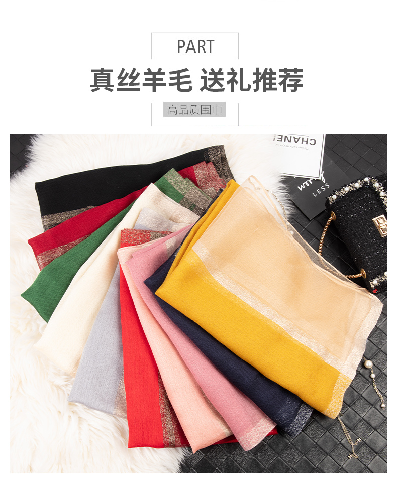 真丝羊毛混纺,天然亲肤舒适,金线边设计,闪闪的,有气质,10色可选,简简单单的设计更能衬托一个人的气质,散发出优雅自信!