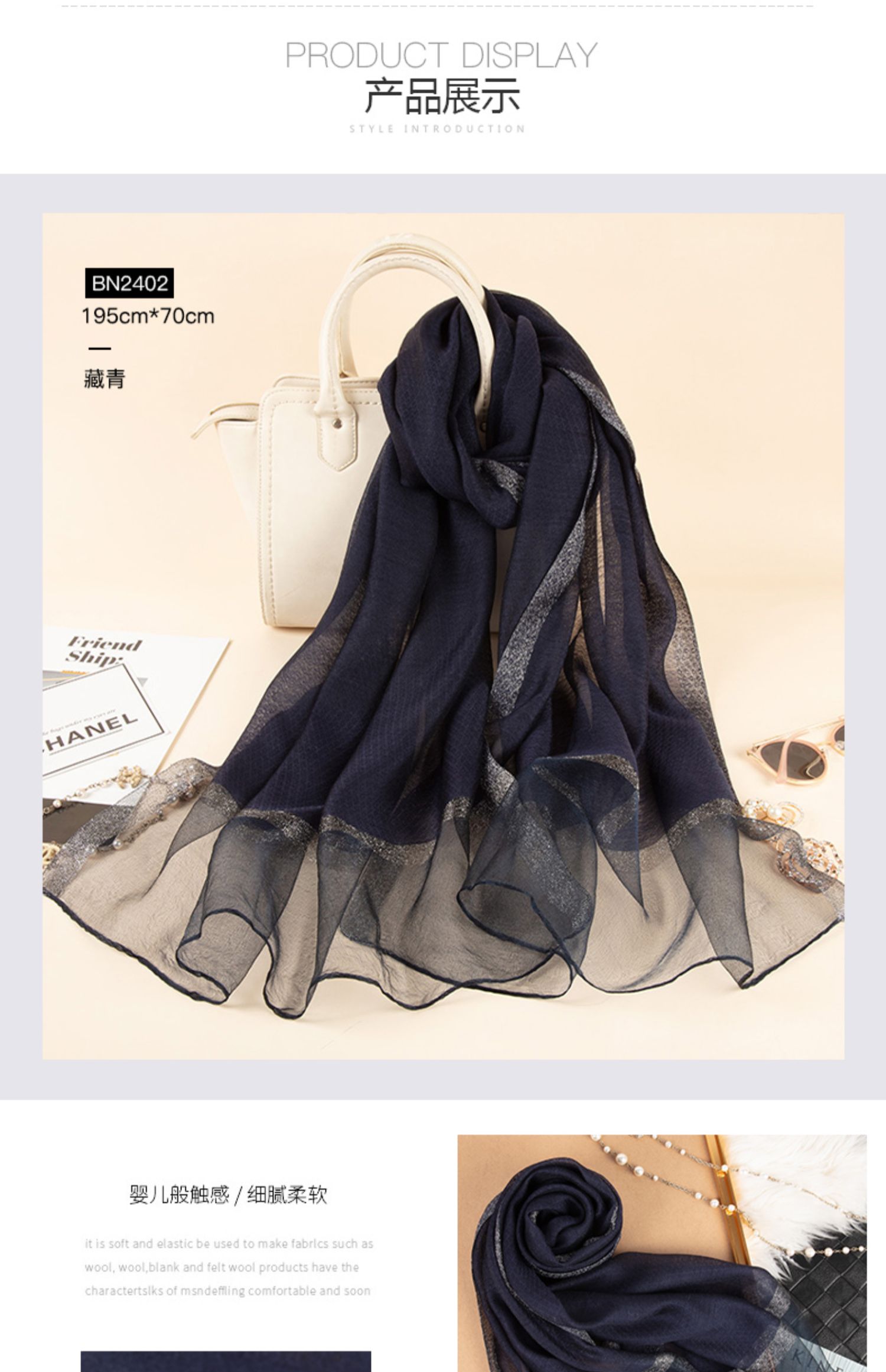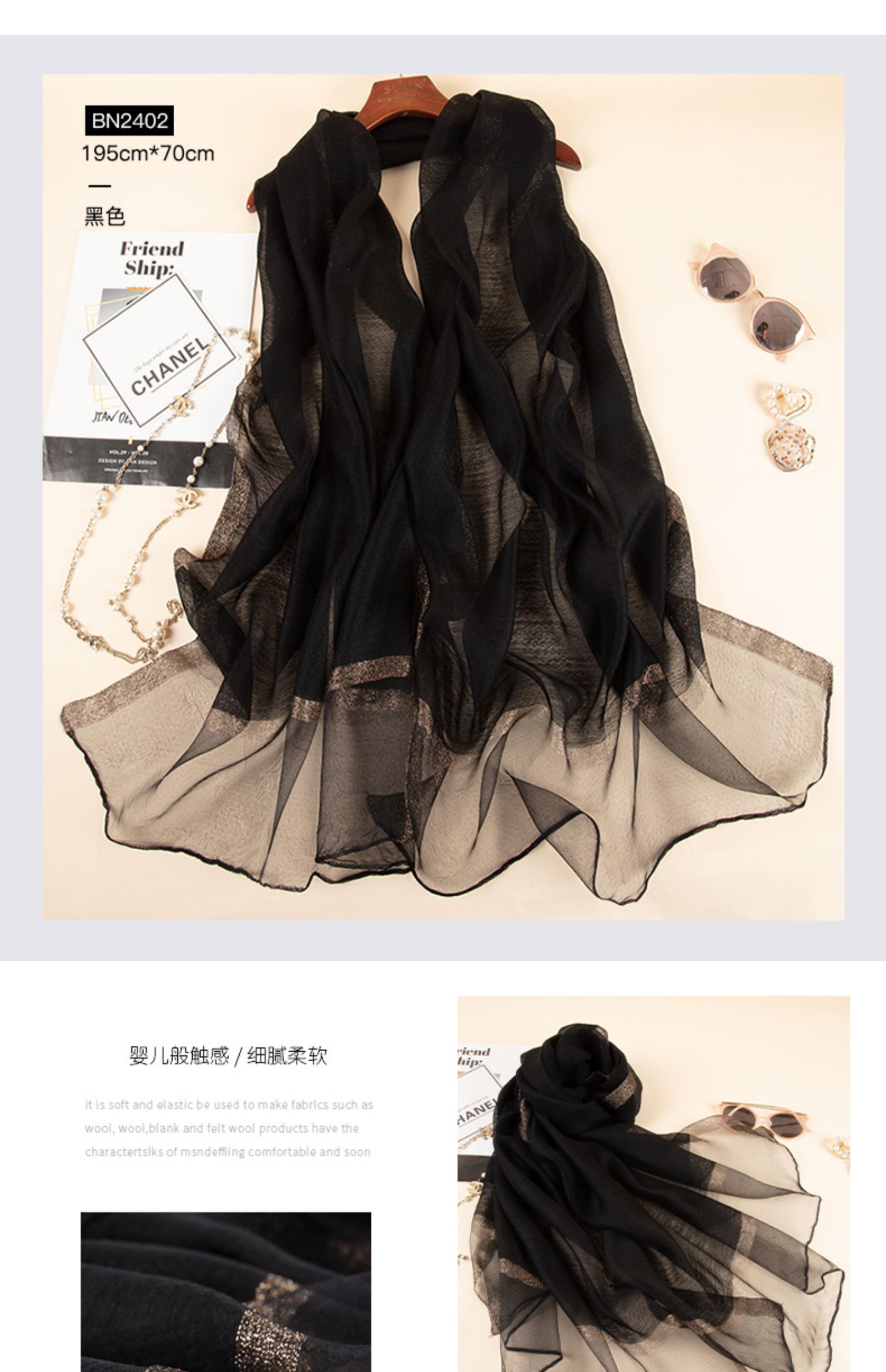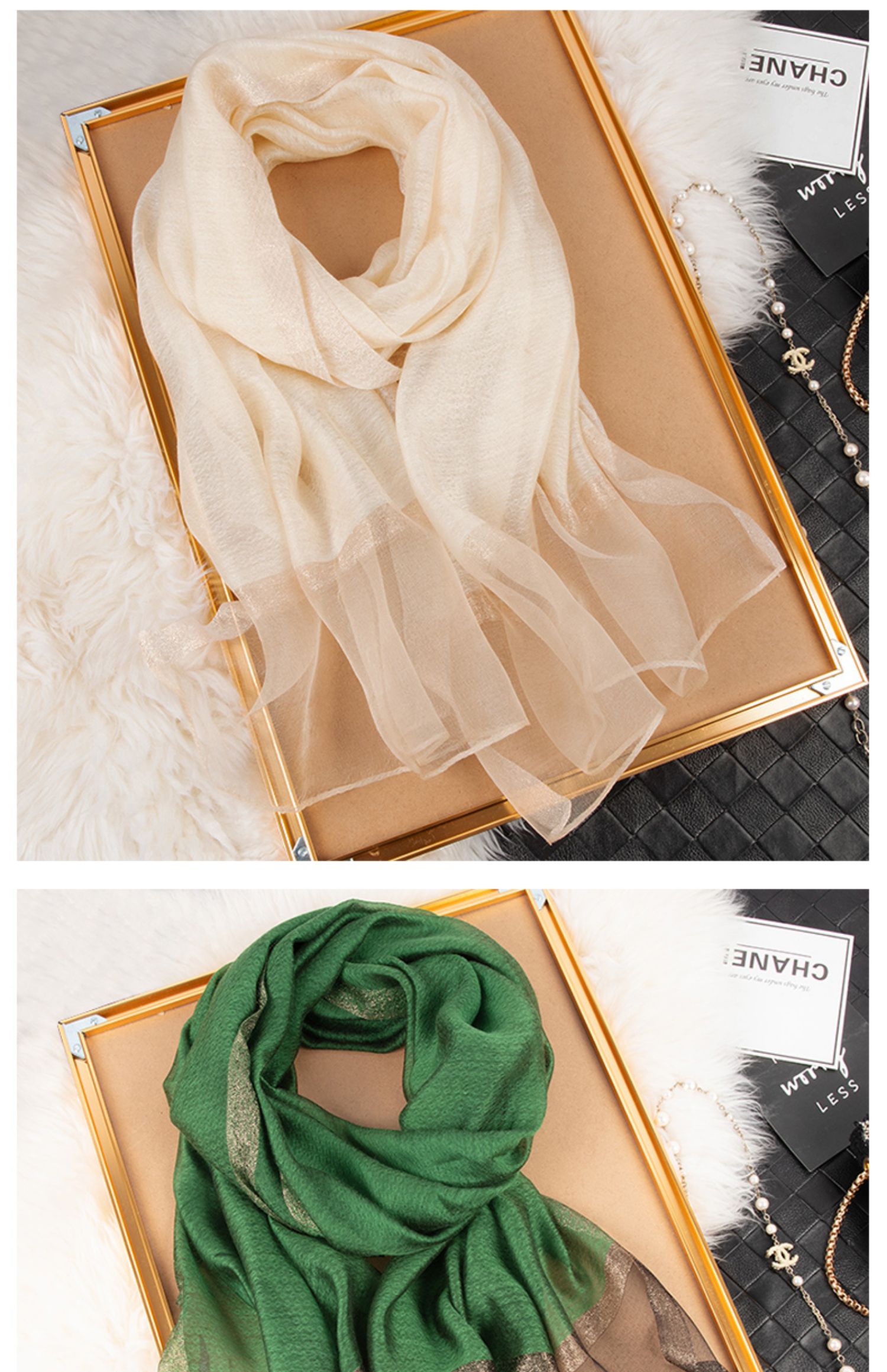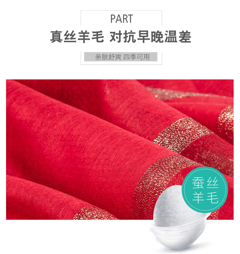 真丝羊毛混纺,天然亲肤舒适,金线边设计,闪闪的,有气质,10色可选,简简单单的设计更能衬托一个人的气质,散发出优雅自信!