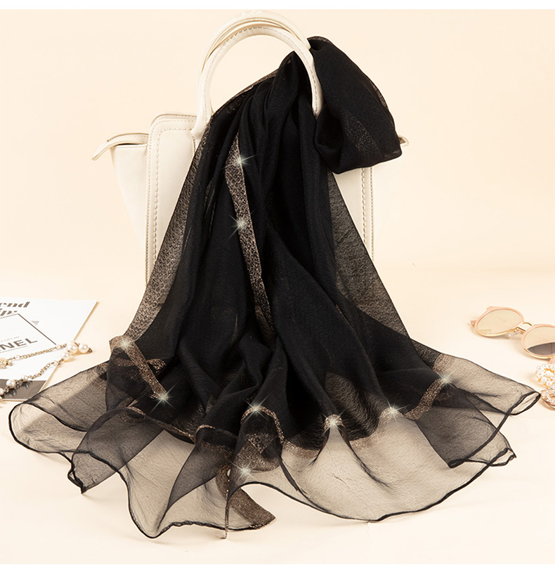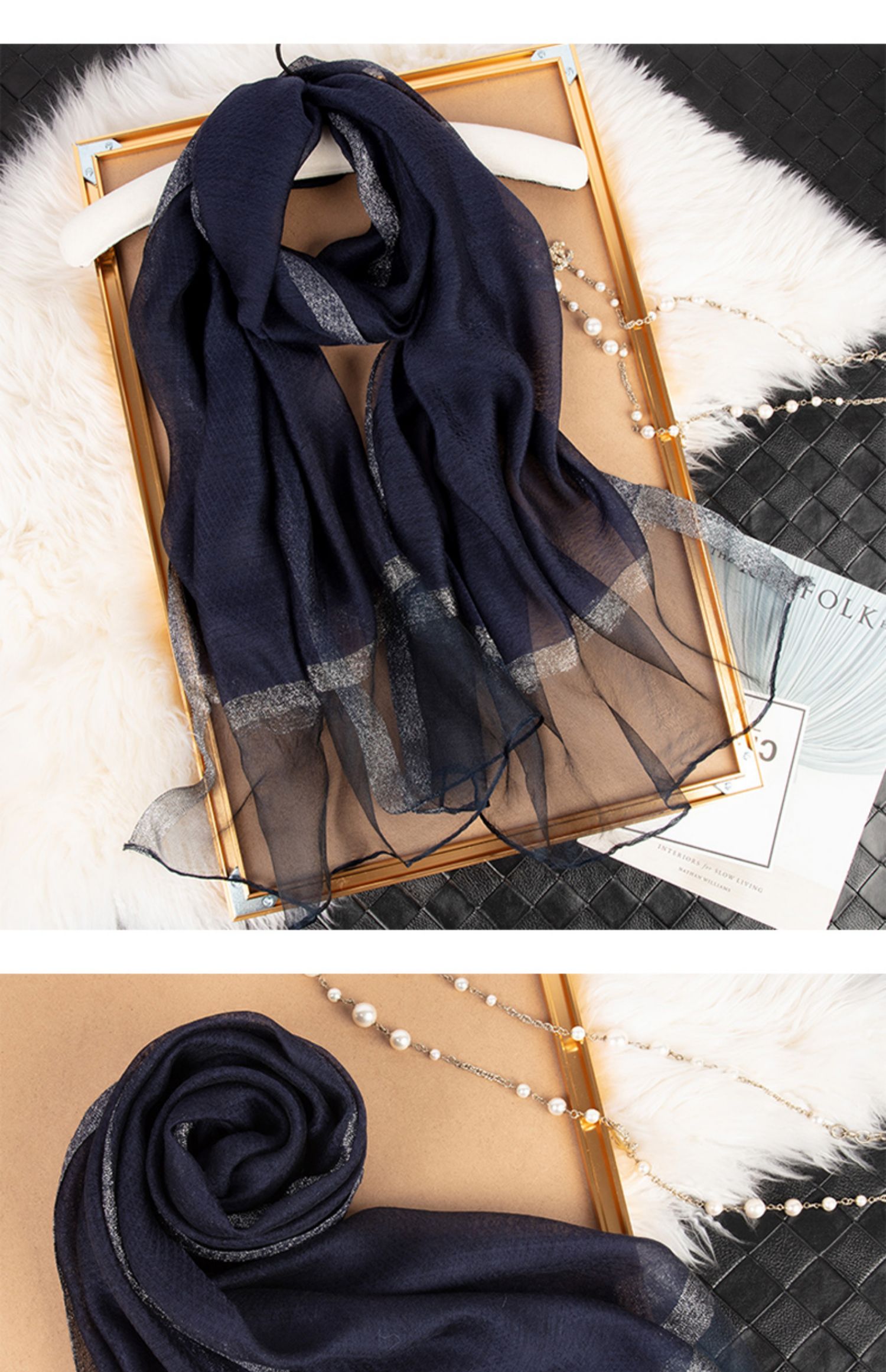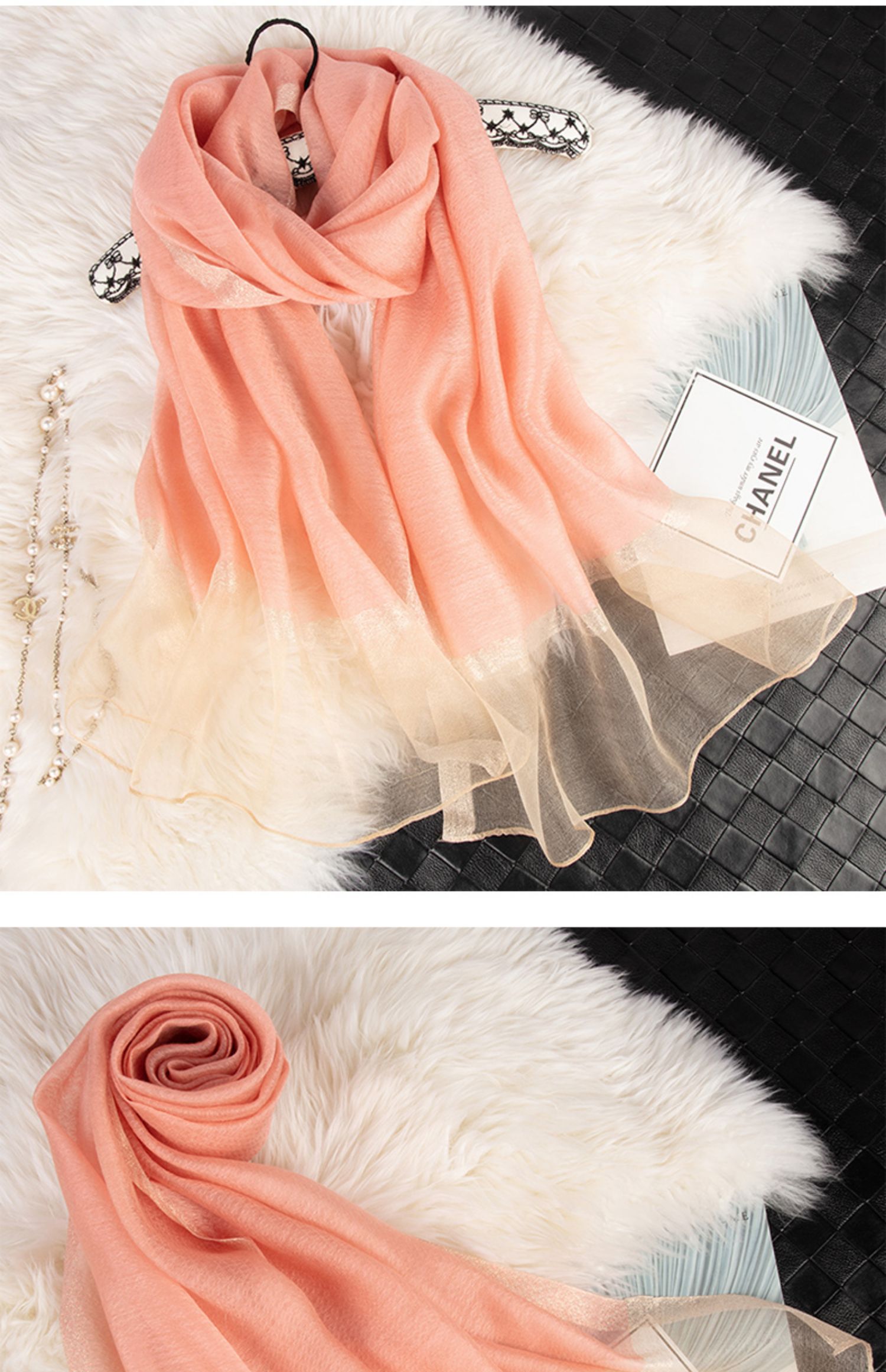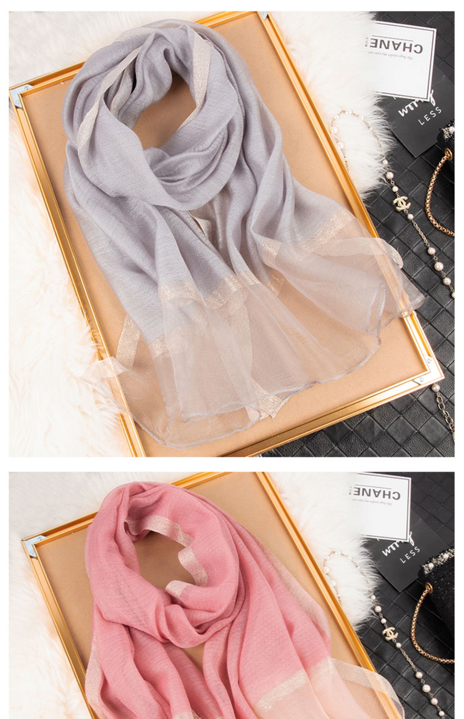 真丝羊毛混纺,天然亲肤舒适,金线边设计,闪闪的,有气质,10色可选,简简单单的设计更能衬托一个人的气质,散发出优雅自信!