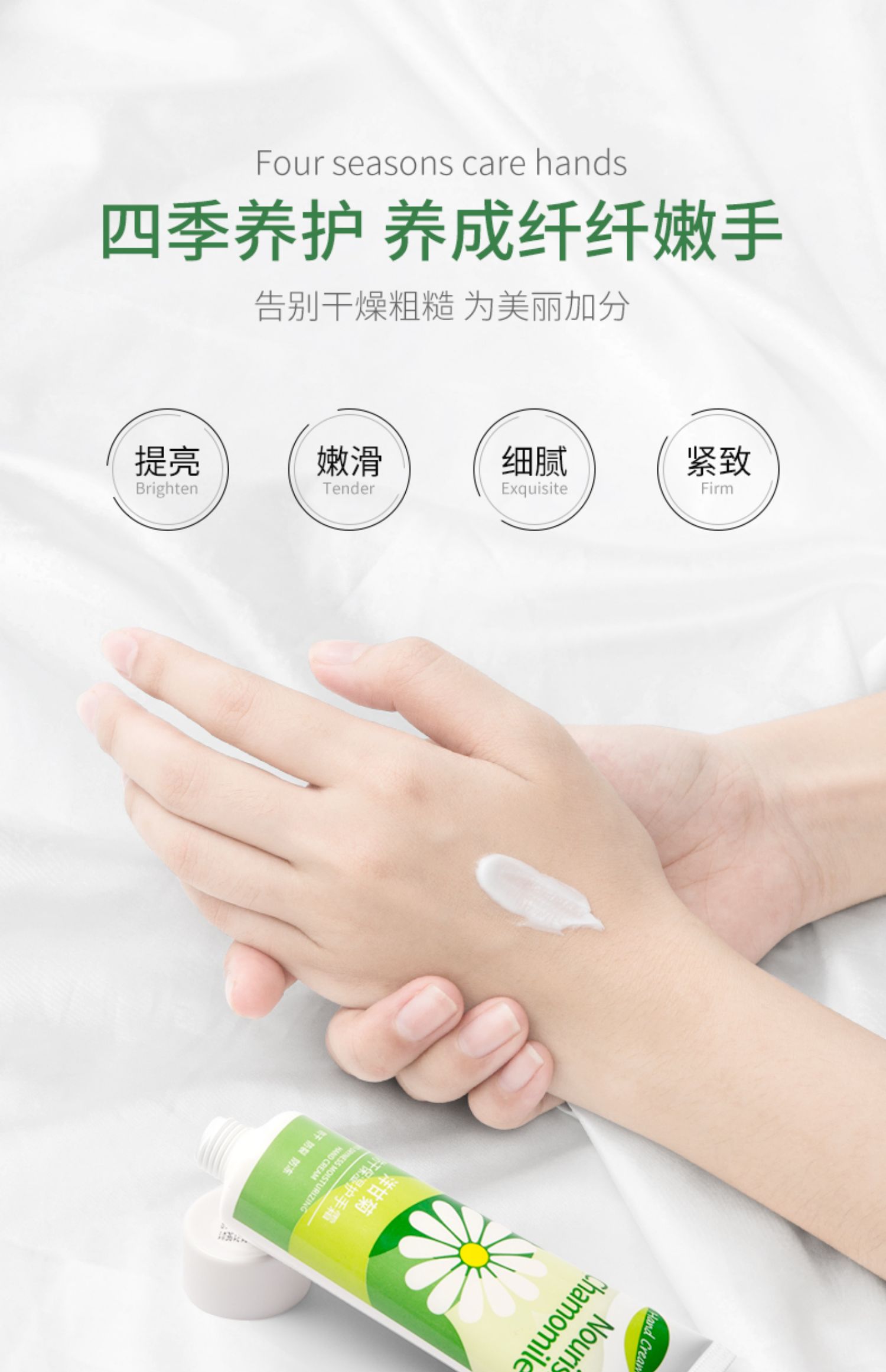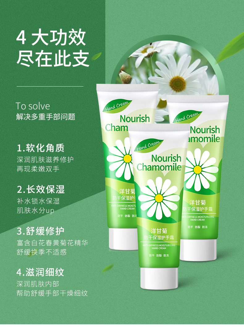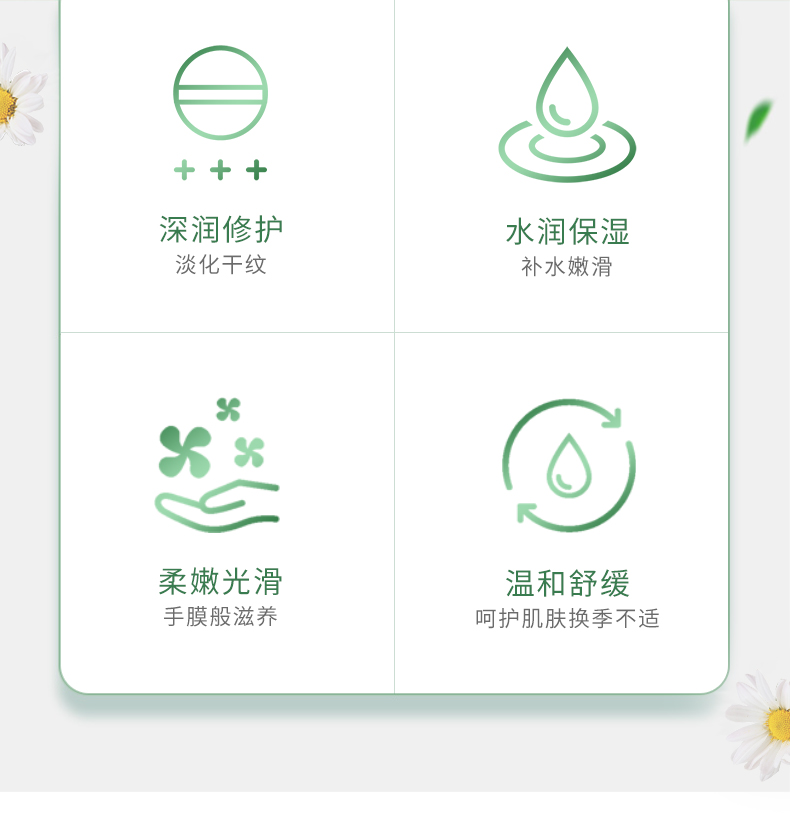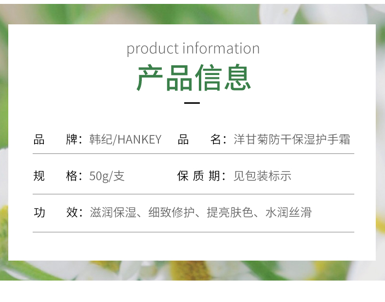 韩纪洋甘菊补水嫩肤美手霜,润泽保湿、细嫩柔滑,防裂修护,用心呵护娇嫩双手;涂完后双手水润感仿佛要溢出来~