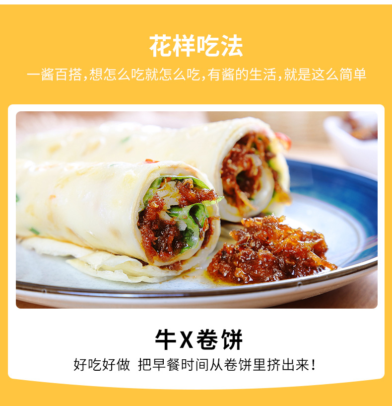 酱香醇厚,大粒牛肉,鲜香爽口,新鲜食材饱满更有味,煮、拌、焖、蘸皆可,一酱多用,花样搭配!价格优惠呀!