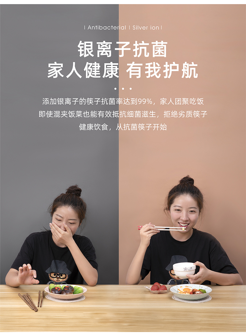 采用日本技术,添加抗菌银离子,家人团聚吃饭,即使是混夹饭菜也可以抵抗细菌滋生,拒绝劣质筷子健康饮食,从抗菌筷子开始!