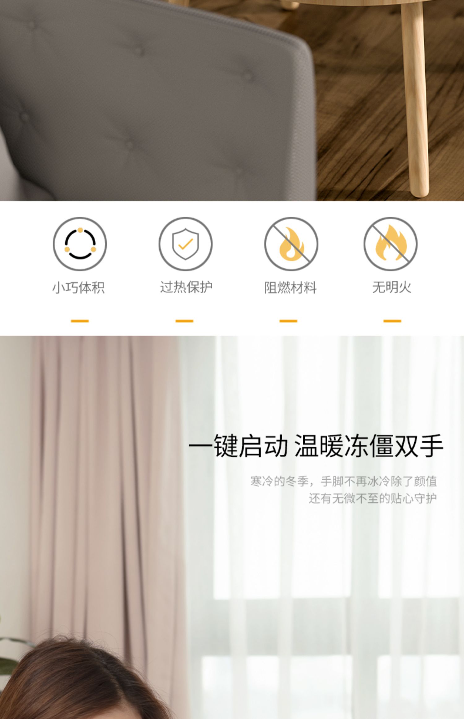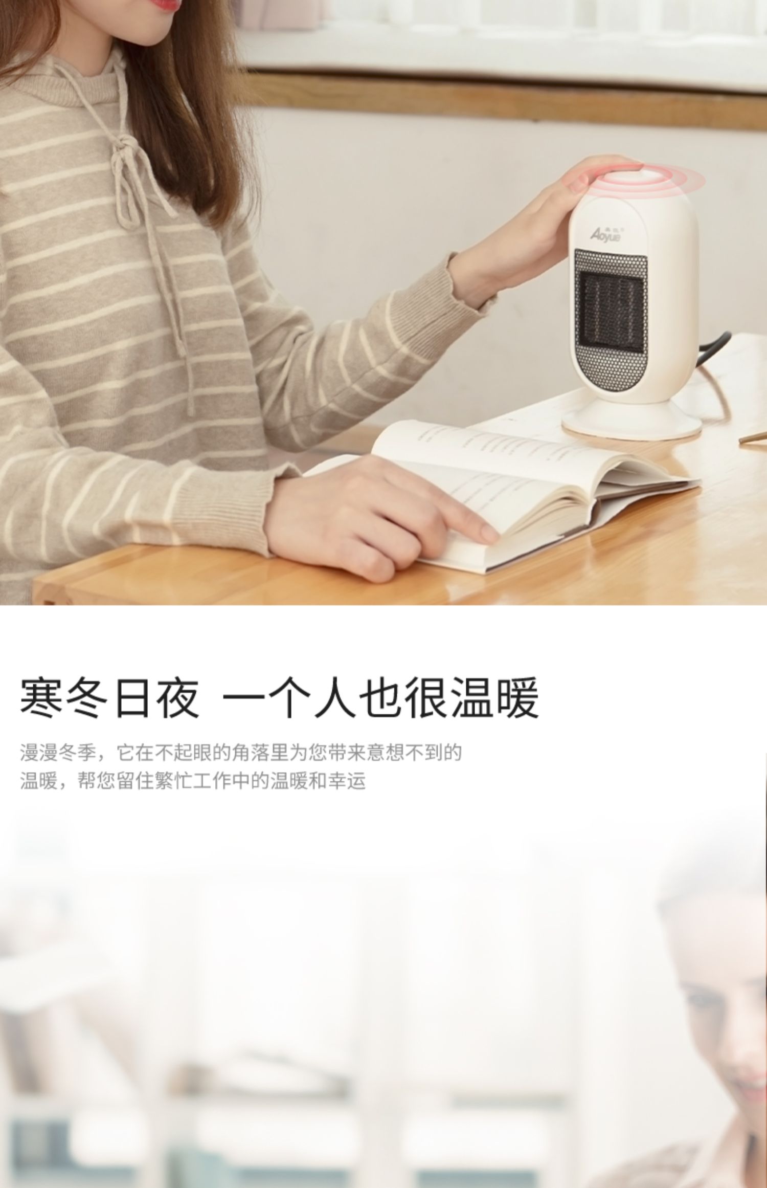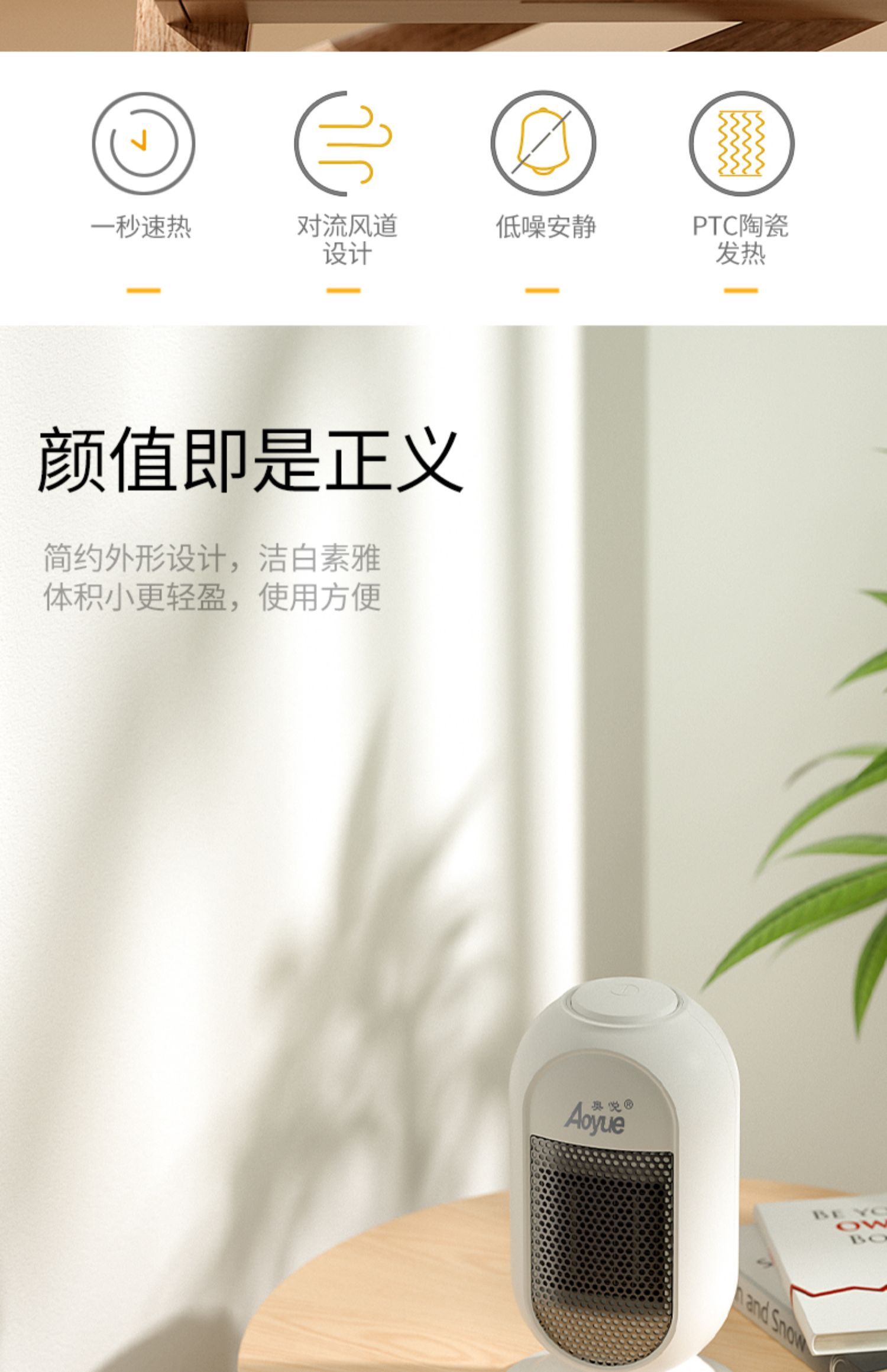 品质保障;奥悦家用暖风机;超可爱的造型;即开即热,暖手暖脚温暖全身,PTC陶瓷发热;超方便!静音设计,夜晚免打扰;过热保护,办公学习的好助手,用起来安全又可靠!冬天有了它,随时随地享受温暖。
