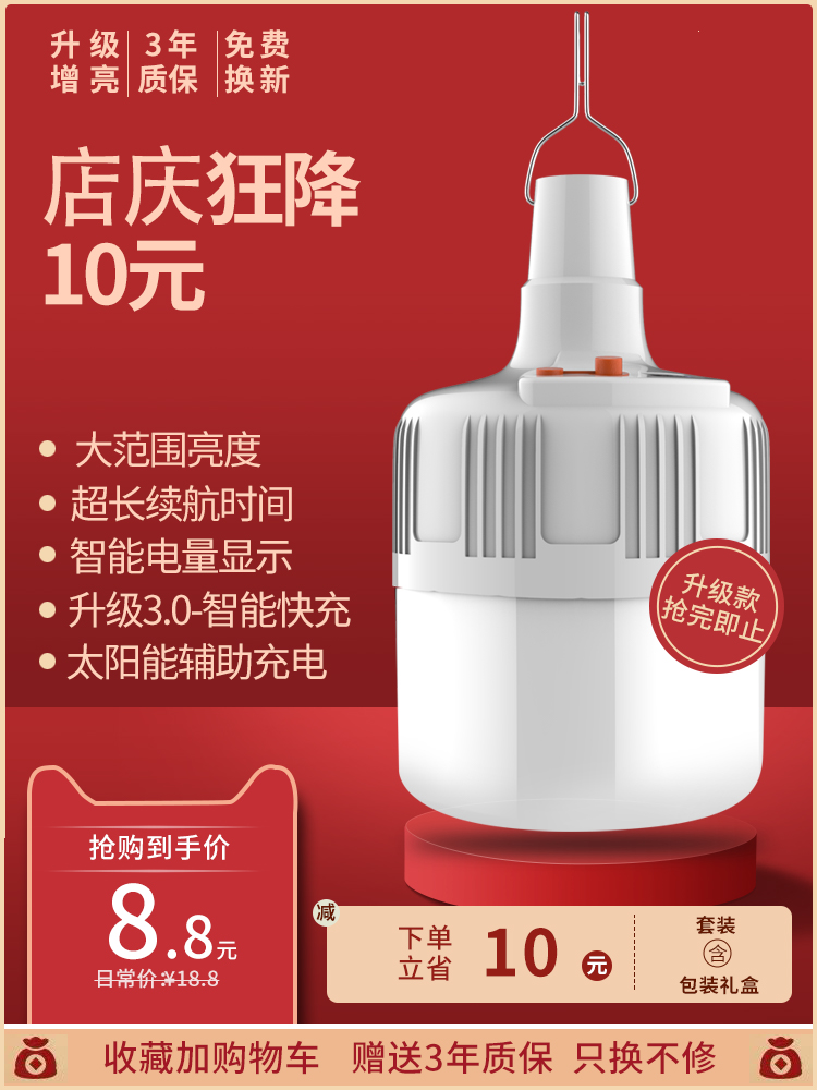 秒杀!【送USB充电器】LED高亮灯芯,亮度高达400w,透光性强,光照面广,五档调光,特有挂钩设计,内置大容量锂电池,48小时持续续航!安全,防水,耐用!无需拉线布线,解决没电的一切的烦恼!抢!