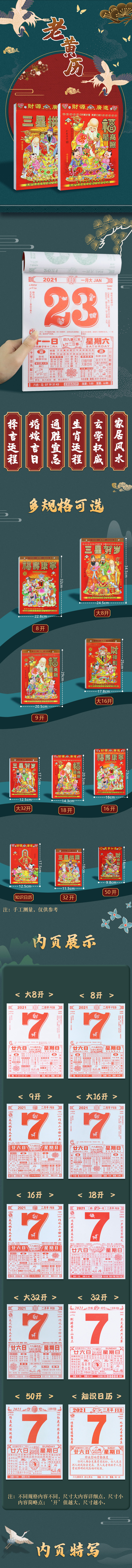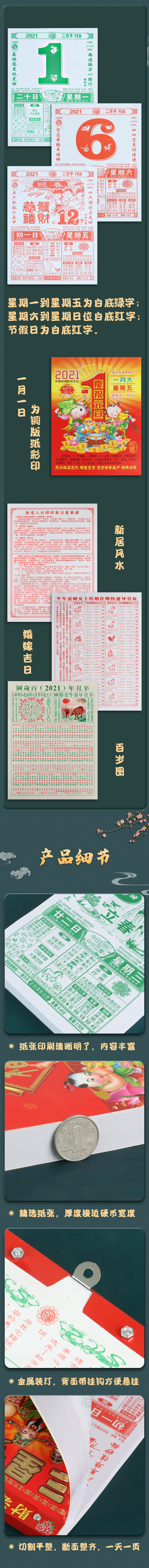 2021年新日期,牛年黄道吉日,就看老黄历!经典中国红风格,厚实纸张,字迹清晰,切割平整,一天一张,内容丰富,金属包边,随用随撕~多尺寸可选,适合不同年龄!
