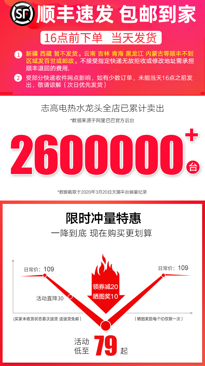 【晒照到手价39】顺丰包邮+送安装包,志高即热式电热水龙头,3秒速热,冷热两用随时控制,水电分离,安全不漏电,满足日常需要,等到冬天就不怕水冷了~【赠运费险】