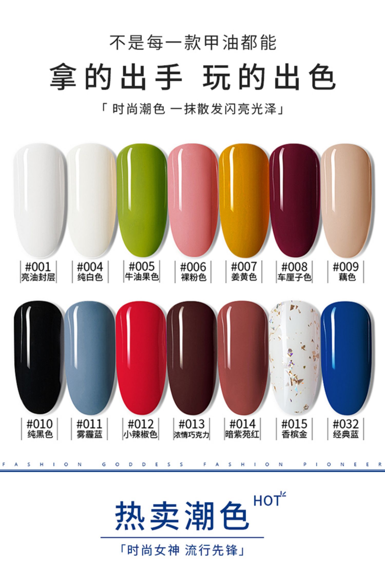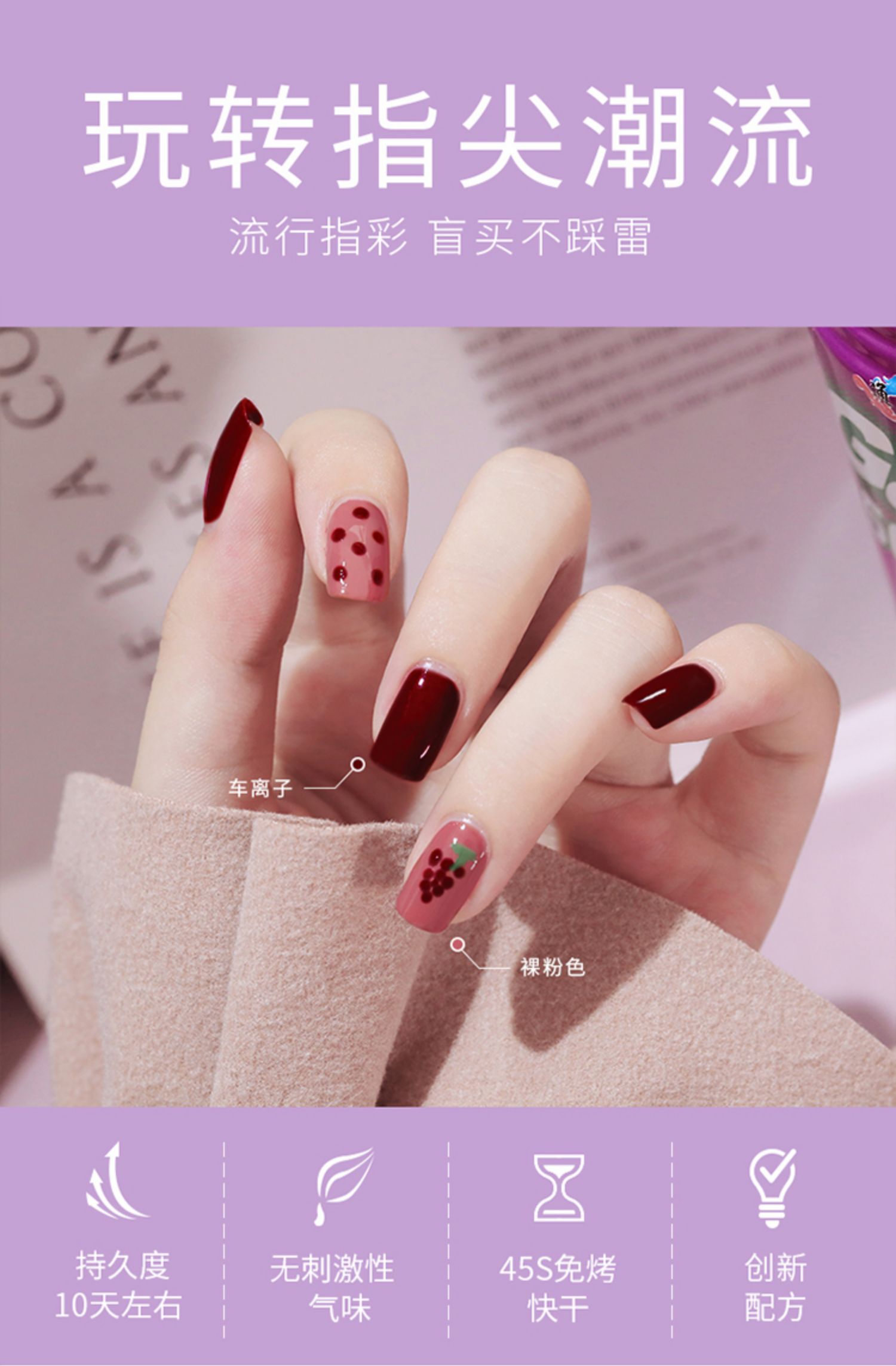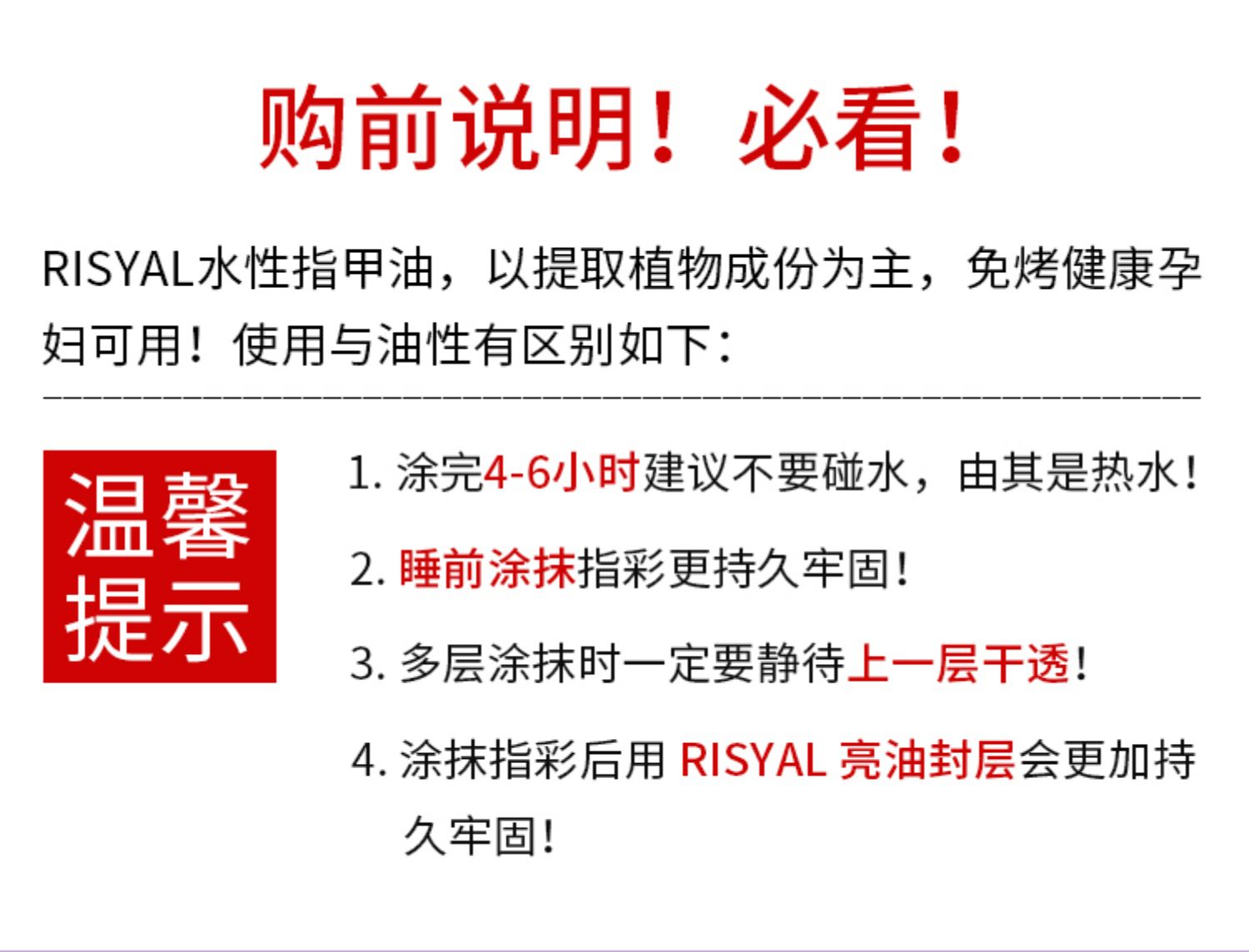 产品以水为主要原料,无刺激性气味,免烤快干,一涂上色,涂抹流畅顺滑,不拉丝不结块.韩国进口基料,创新产品配方。赠送亮油卸甲巾,敲划算~
