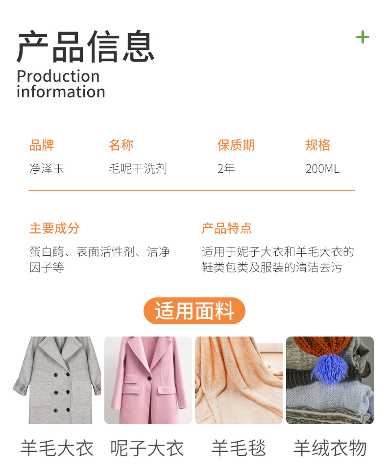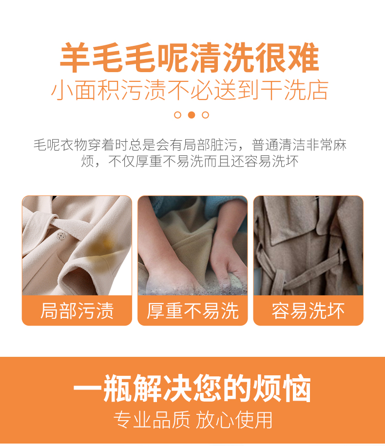 毛呢大衣专用干洗剂,强力去污因子,强效去除各类顽固污渍,一喷一擦,洁净如新,告别干洗店,免水洗的,非常方便,穿大衣皮草的季节,这个一定要备一瓶!