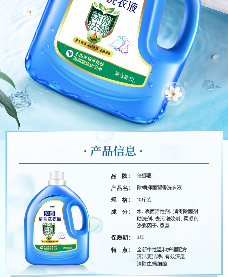 【10斤装】倍娜思除螨洗衣液,除菌、除螨率高达百分之99,五大优势“除菌去螨、深层洁净、低泡易漂、自然清香、洗衣护色”。持久留香,高效除螨,呵护家人健康!