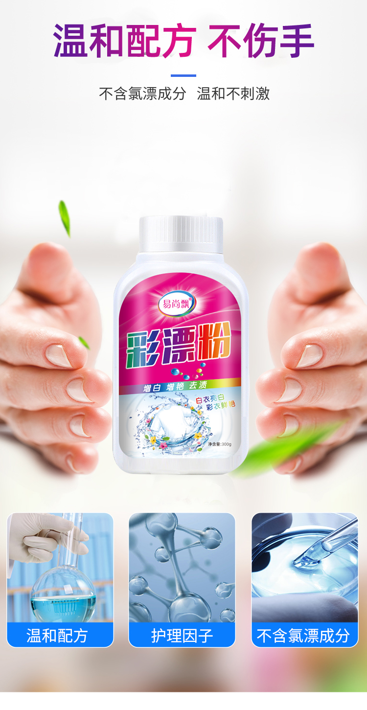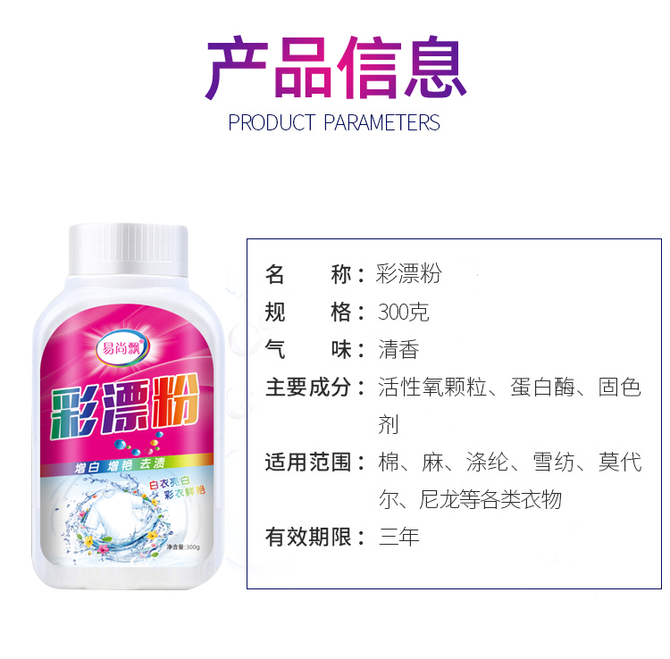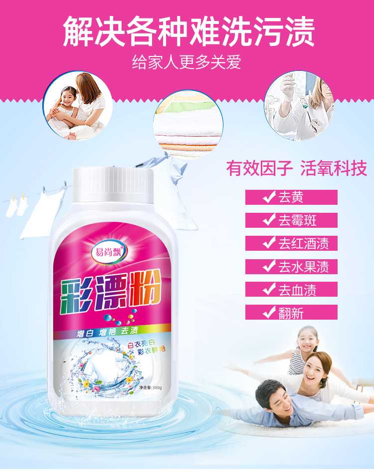 【易尚飘】去污去渍漂白剂彩色漂粉,全新升级活氧去污新技术,内含活性因子,多效清洁,轻松去污,多重去污,省时又省力~温和配方,气味清香不刺鼻,母婴同用不伤手,衣物无残留,给家人更多的关爱!