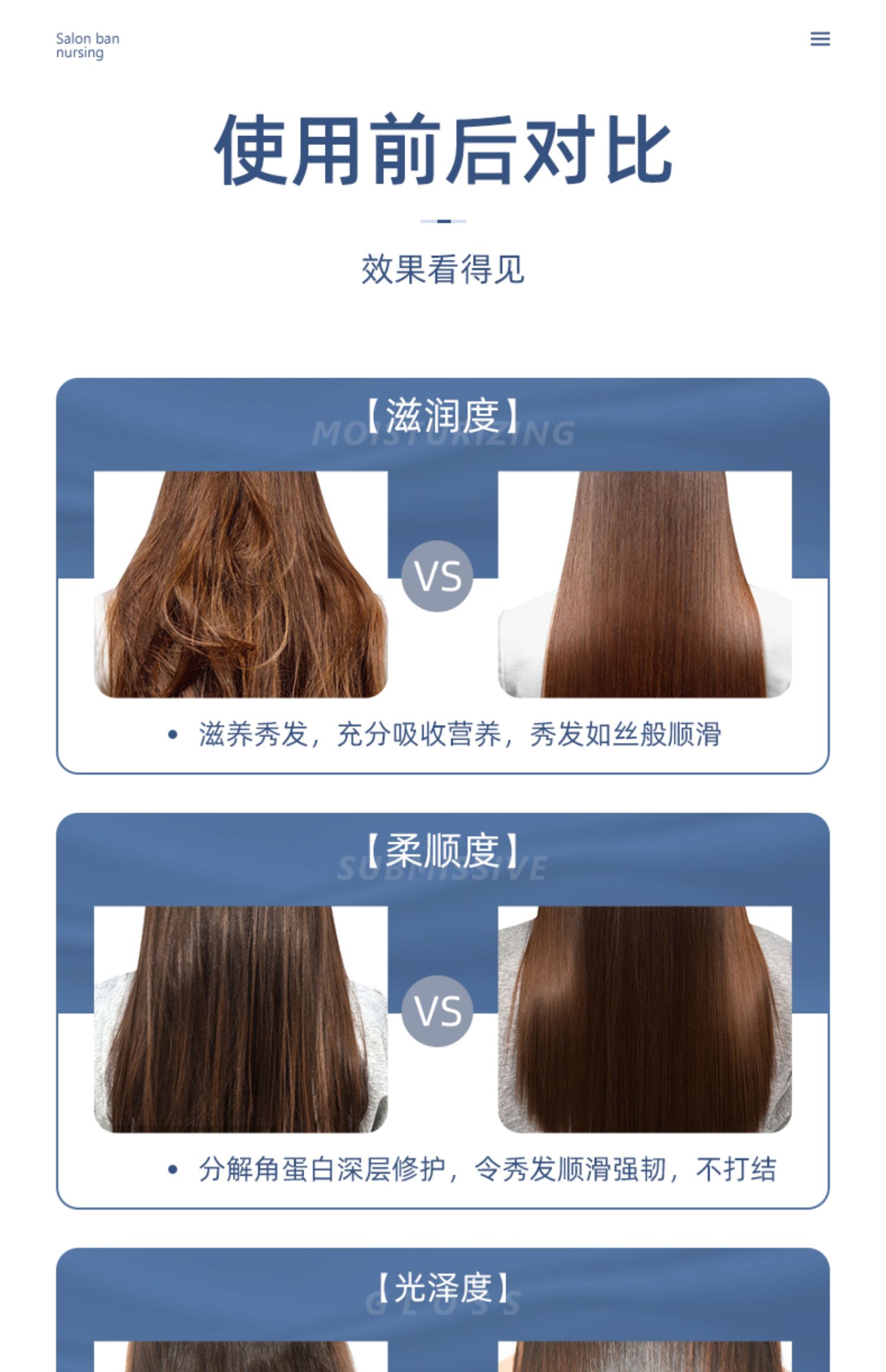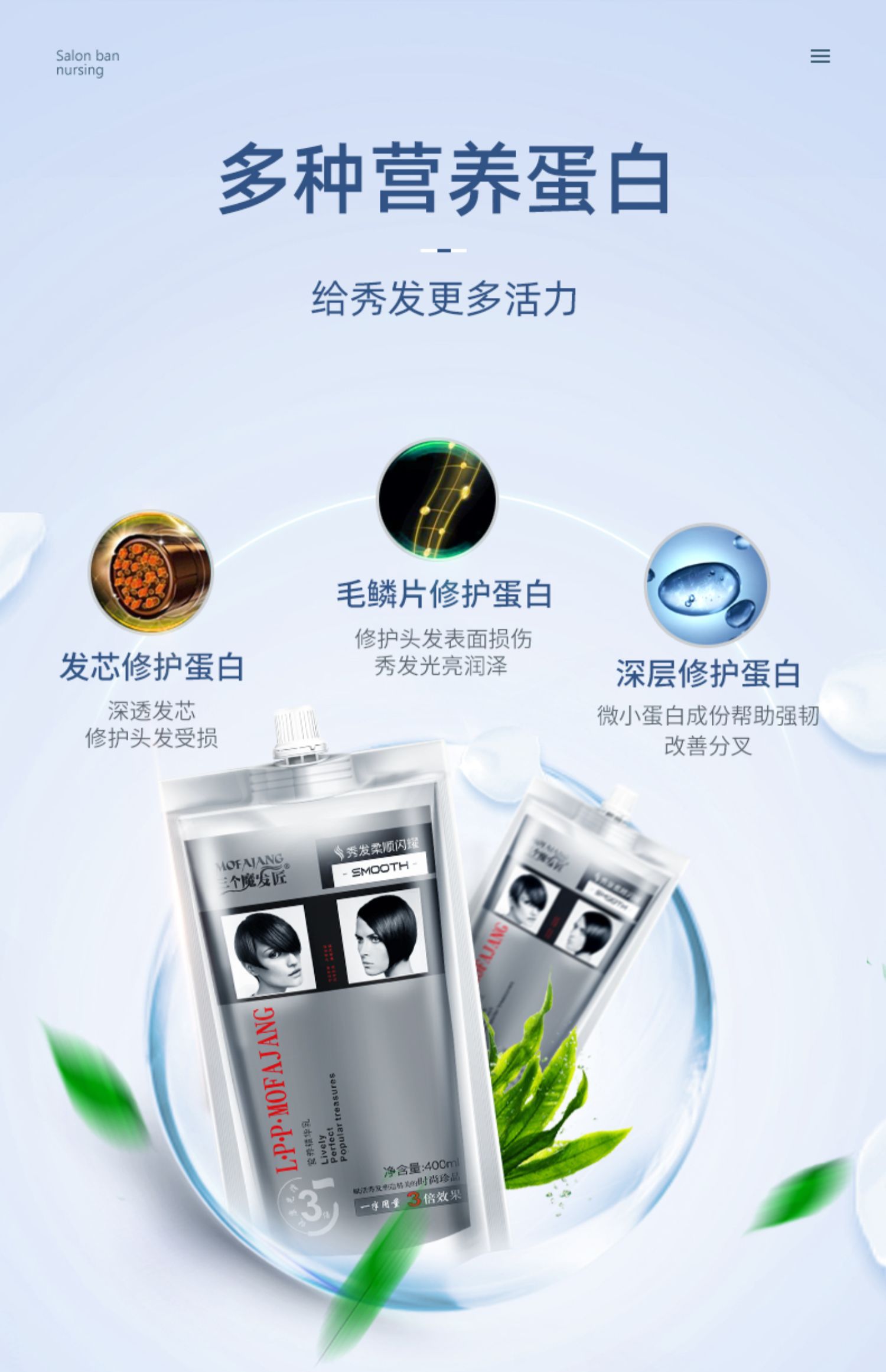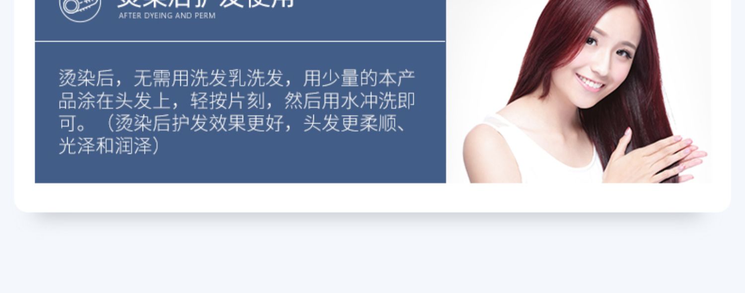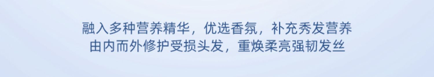 多种植物蛋白精粹,补水渗透发芯,深层滋养修复,多方位细致呵护,改善毛躁,倾现秀发丝丝顺滑。
