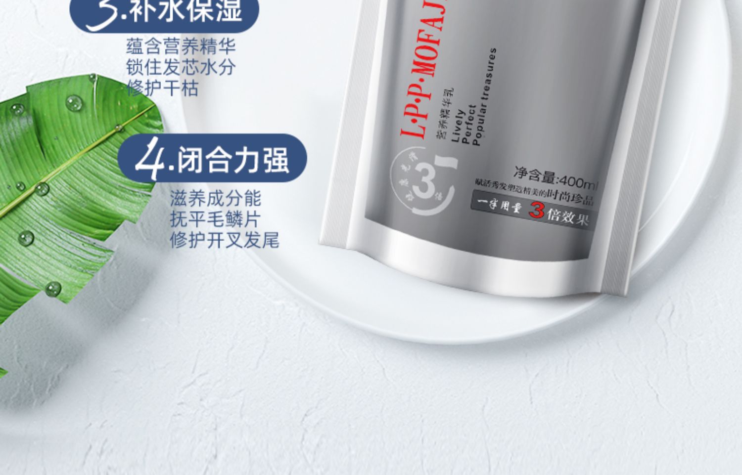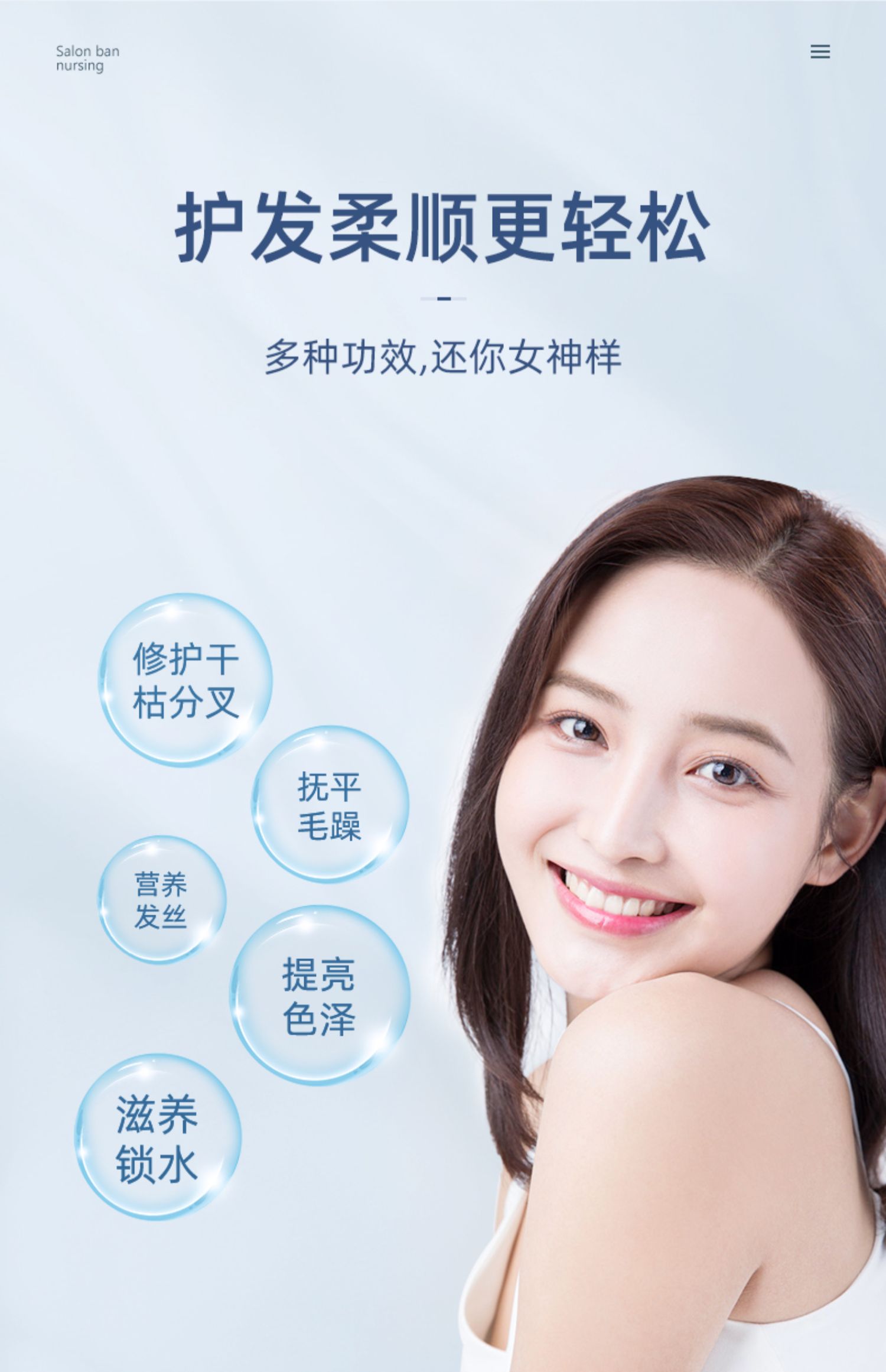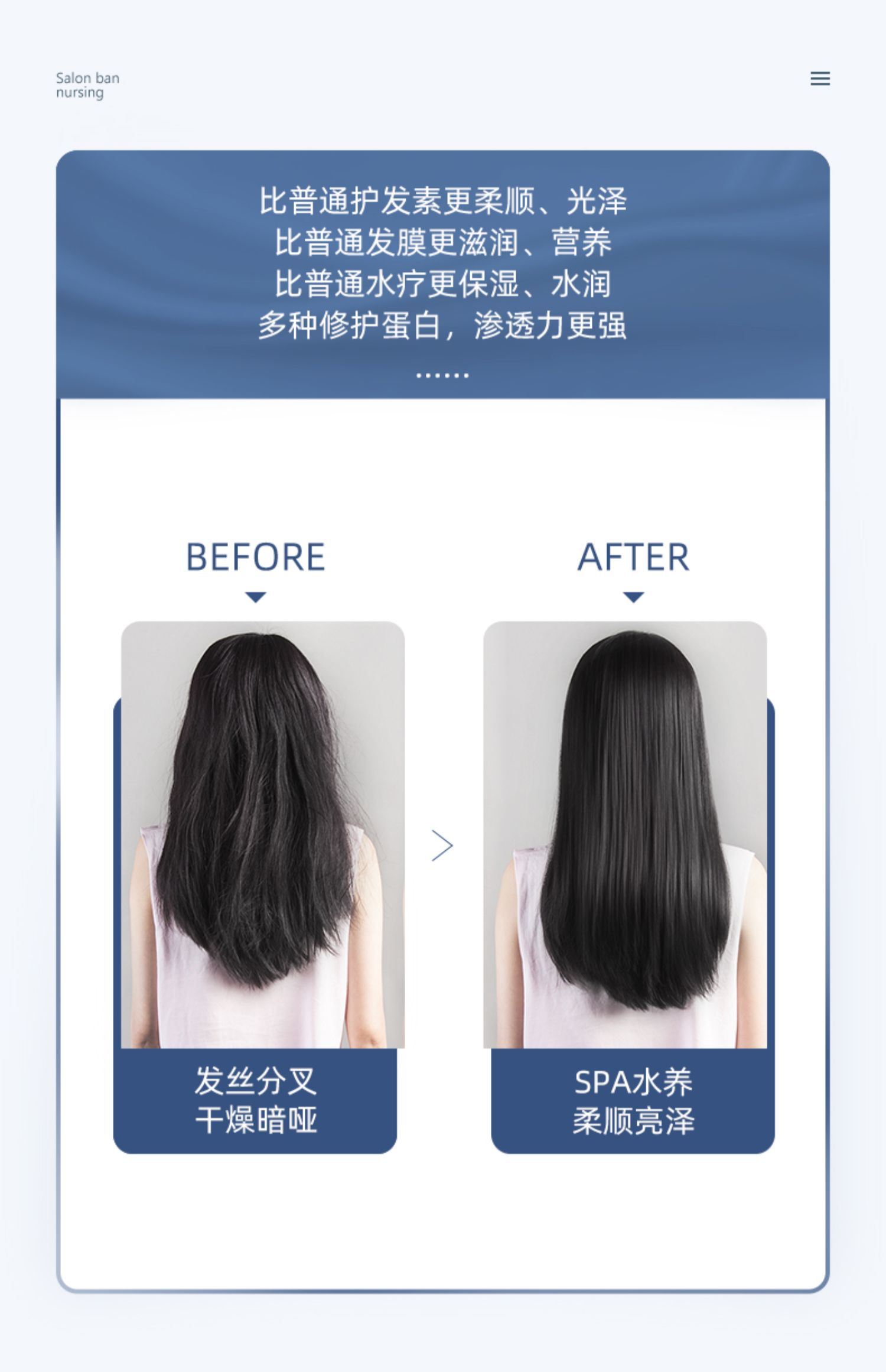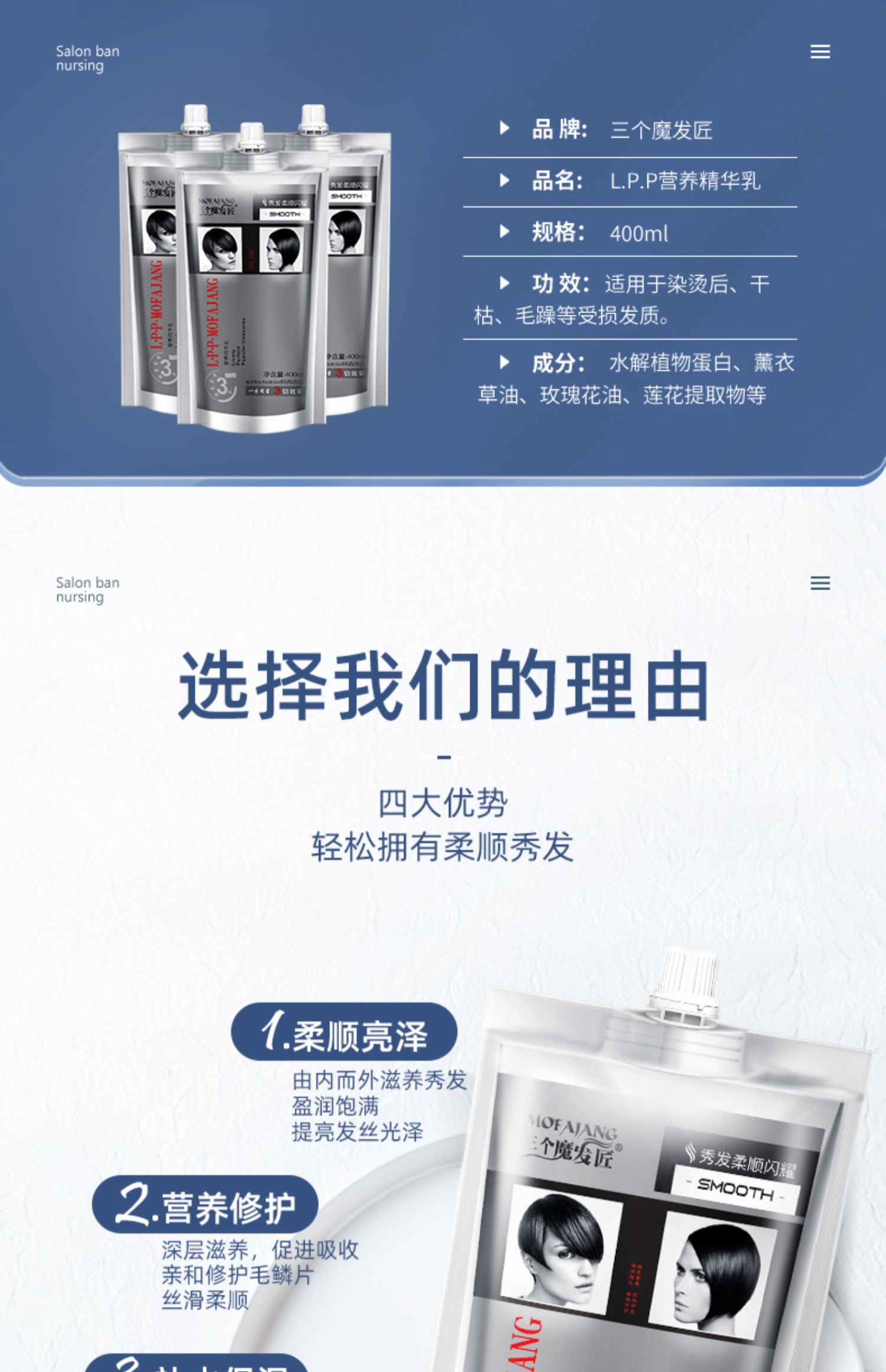 多种植物蛋白精粹,补水渗透发芯,深层滋养修复,多方位细致呵护,改善毛躁,倾现秀发丝丝顺滑。