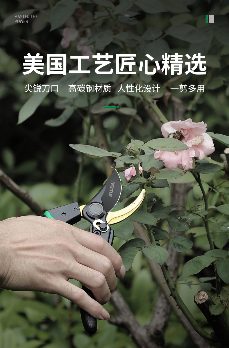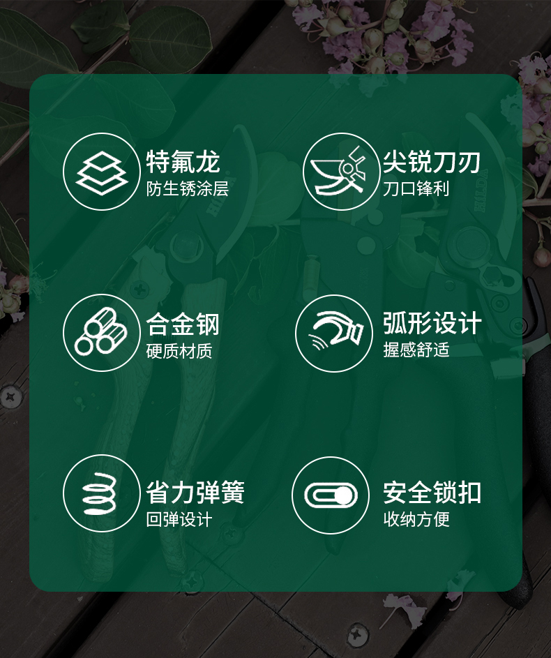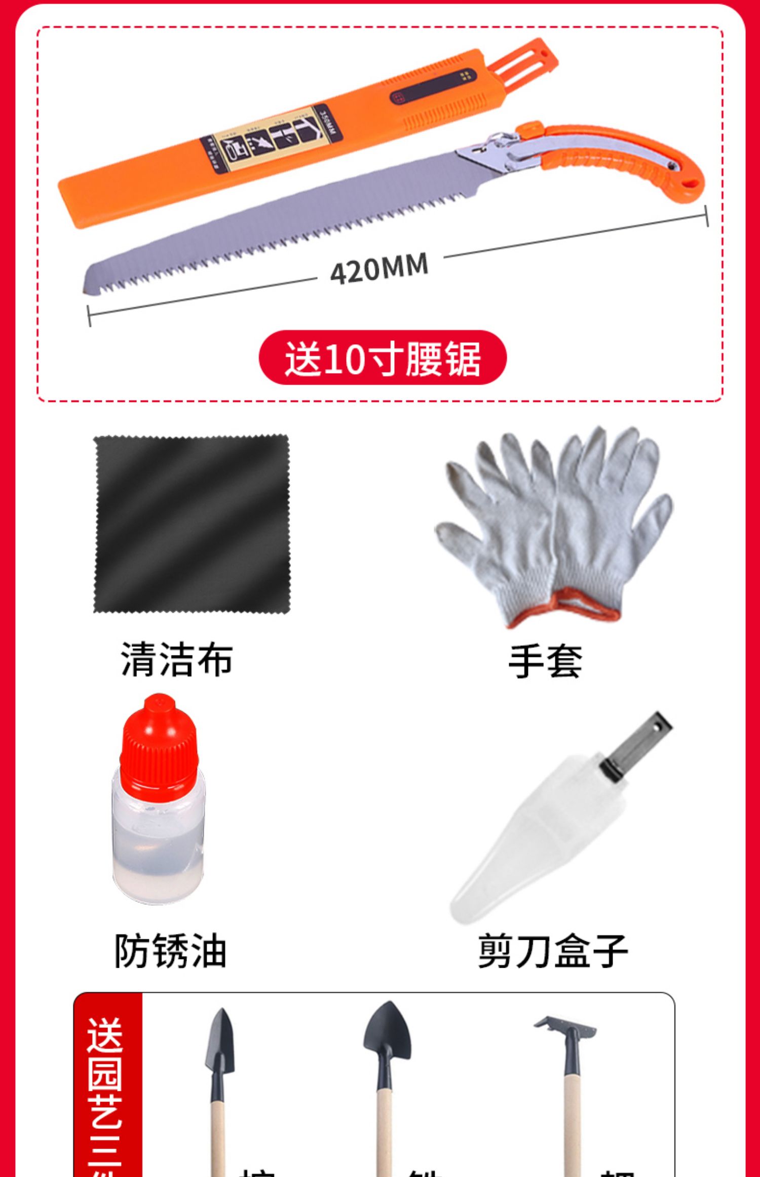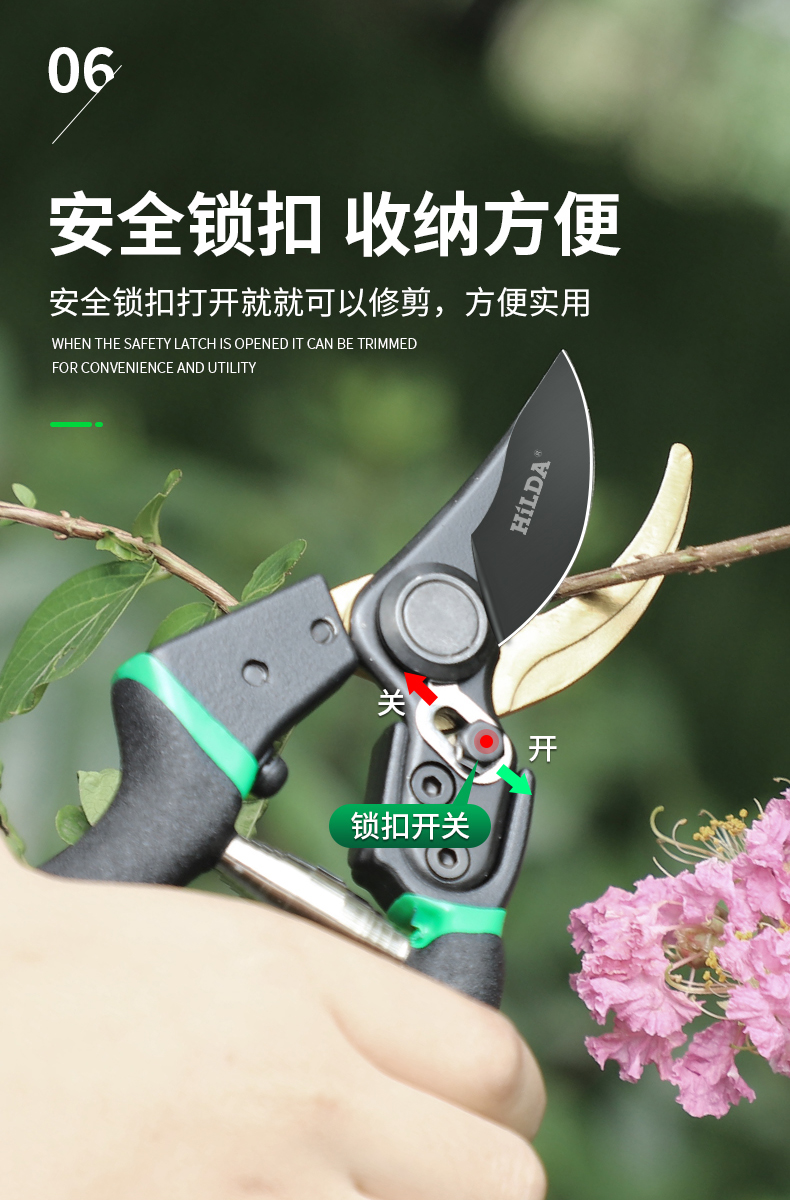 专业园艺修枝剪刀,采用SK5合金钢材制作,刀头表面电镀处理,锋利坚韧轻便,防滑手柄,持久耐用,新设计安全锁扣,轻松体验一剪美快感,修剪园林好帮手~【赠运险费】