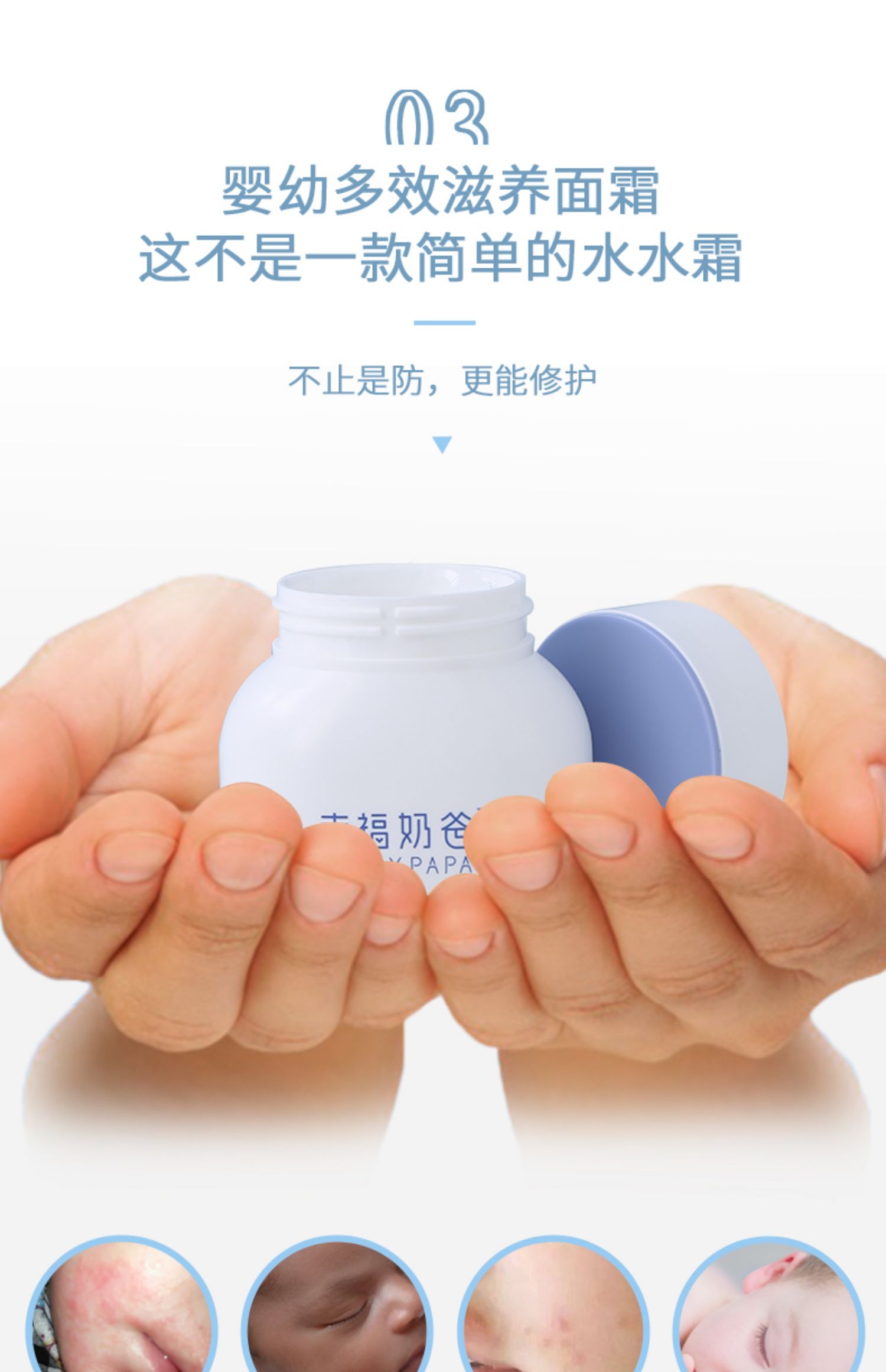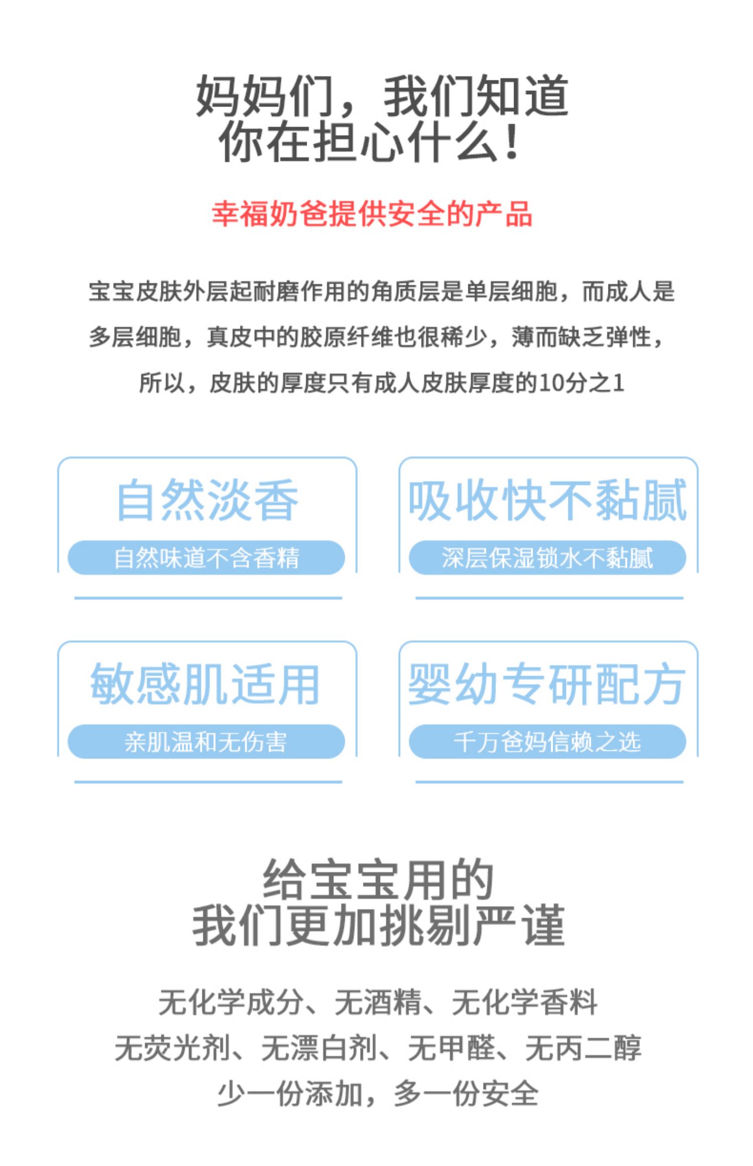 幸福奶爸宝宝山茶油、芦荟油、绵羊油、马油保湿面霜四种规格可选,解决让妈妈头疼的干燥、脱皮红点痕痒湿疹奶癣口水疹、尿布疹、红屁屁、蚊虫叮咬的难题~多效保护,强健宝宝的皮脂膜!