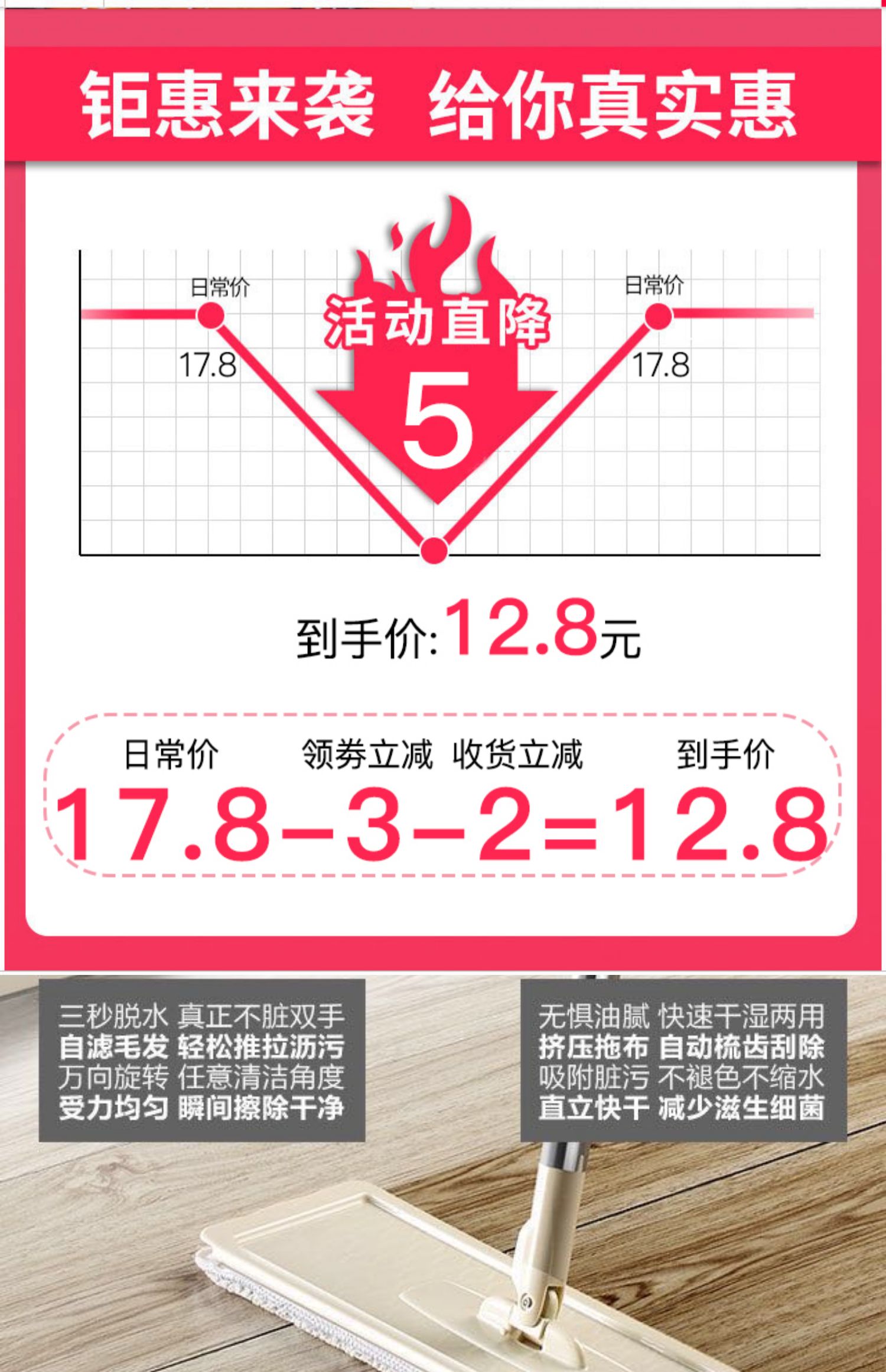 【券后价9.9元,每人限购一个,月销3万件】360°旋转免手洗平板拖把,三秒脱水,自滤不刮手,可立式晾干,省时不费力,超强去污,洗脱合一,省时省力,快点入手吧!