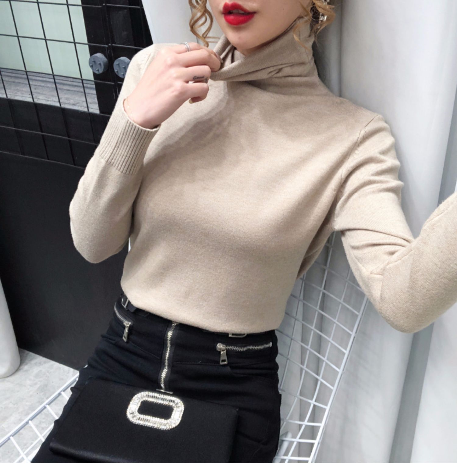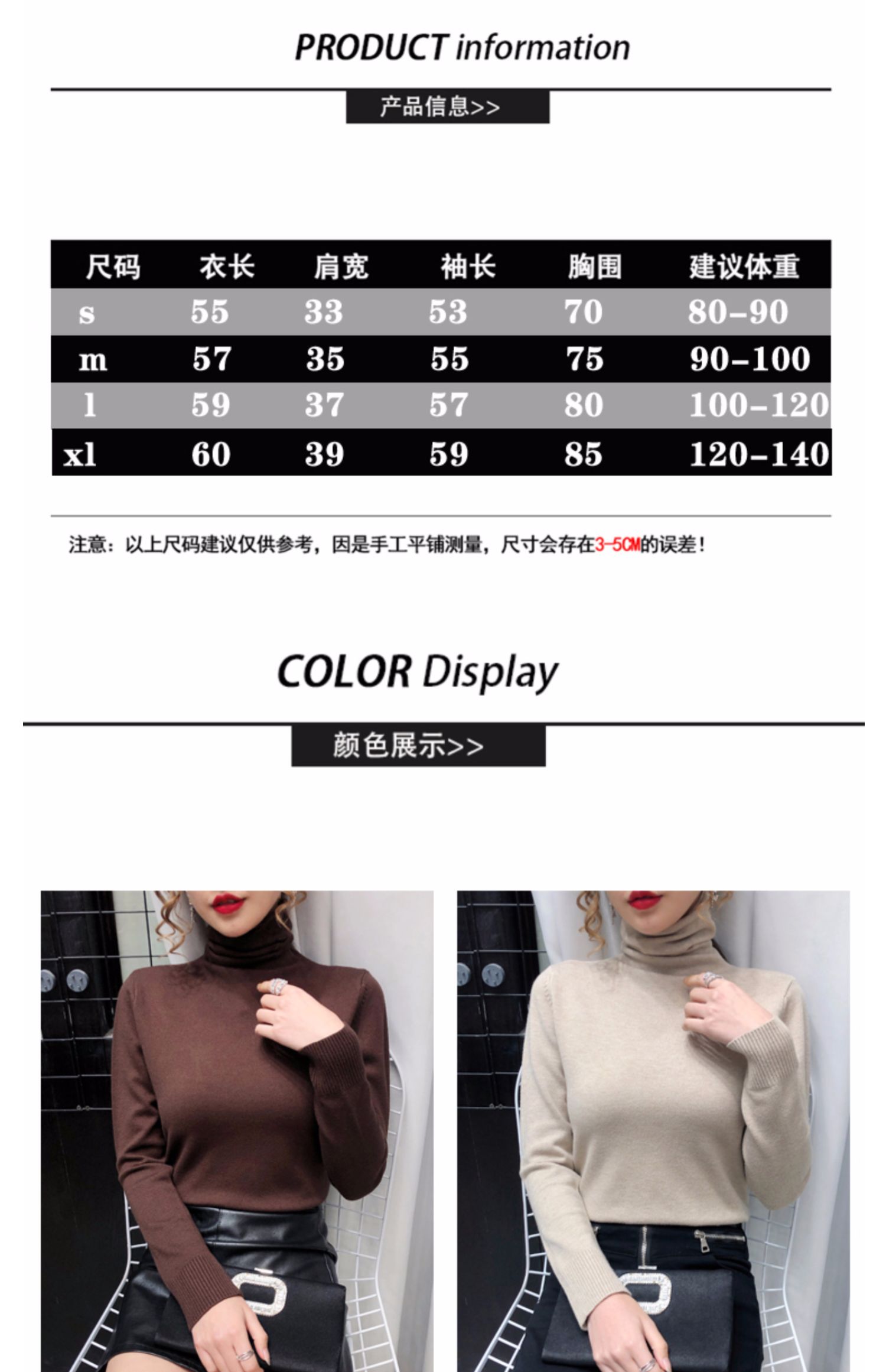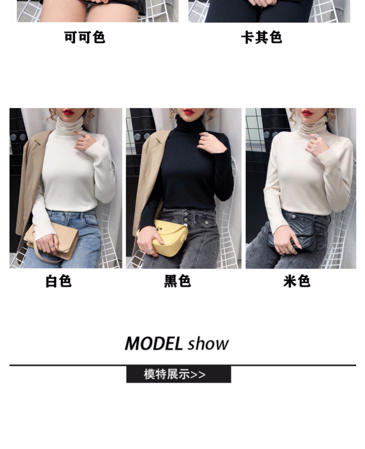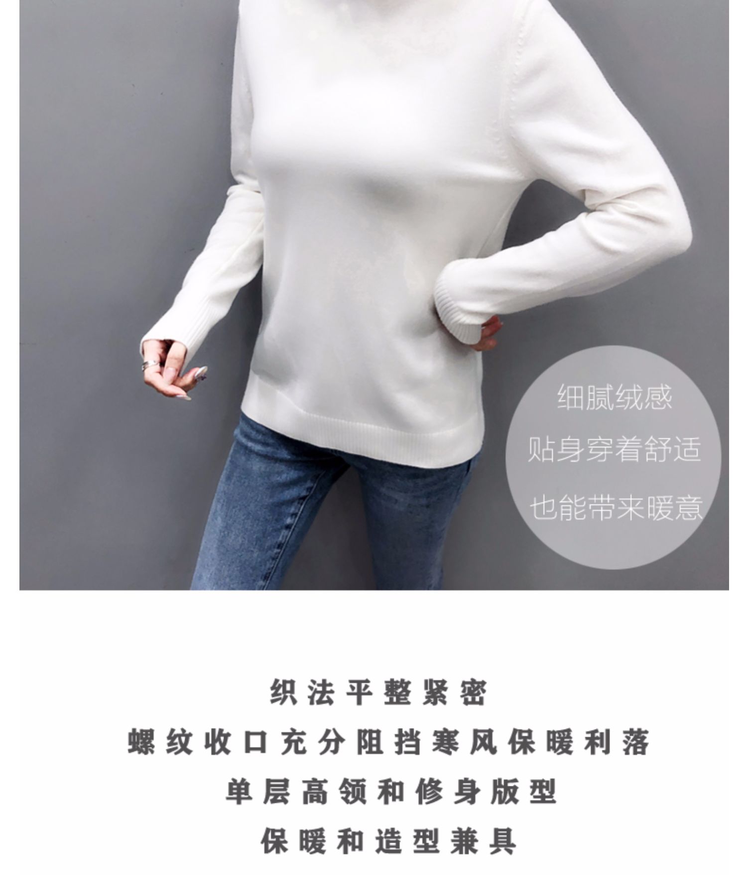 细腻绒感,贴身穿着也舒服,织法平整紧密,螺纹收口充分阻挡寒风,保暖利落,修身版型,加厚高领阳离子面料,毛衣重0.4kg,比普通打底衣保暖2倍,五款颜色都是秋冬的百搭色!