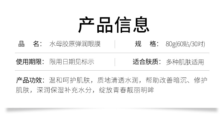 【拍3件180片只需29.9元】一贴水润,紧致亮眸,水母贵妇眼膜贴,精选成分,明眸靓肌,根源改善眼部问题,深度修护,修护成分层层穿透眼部真皮层,营养吸收看得见,水溶性胶原膜遇水融化。