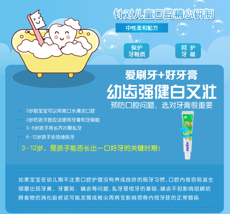 【超值装!牙膏4支牙刷2支】不怕宝宝误吞,无氟可吞咽。清洁抗菌、防蛀固齿、减少牙垢、清新口气,四种水果味,让宝宝爱上刷牙!