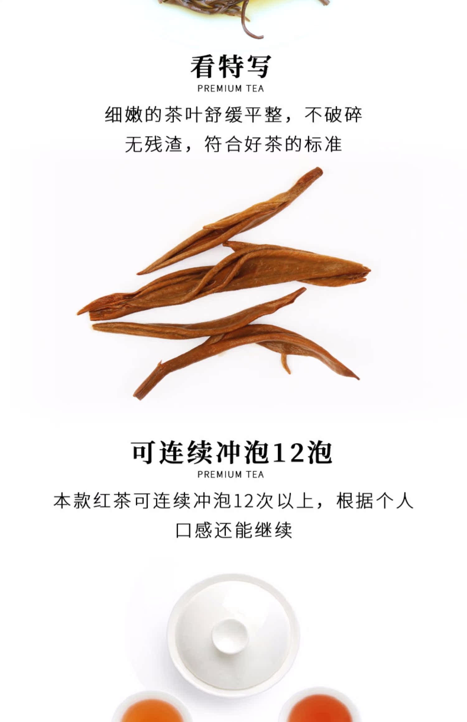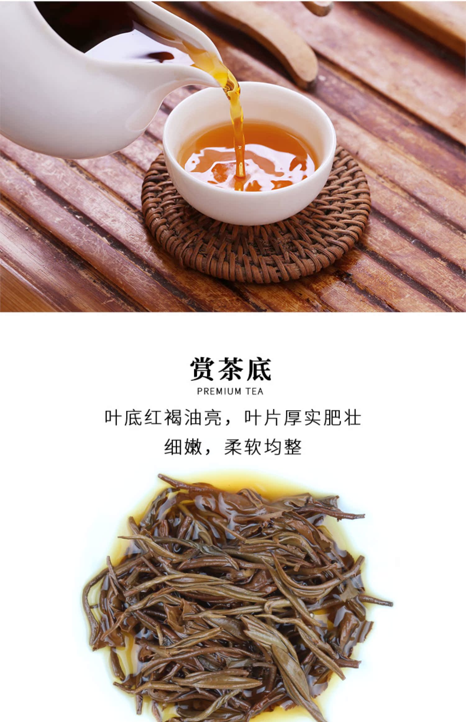 条索肥壮紧结,油润有光泽,金毫显露,无杂质,茶汤红艳明亮,滋味鲜爽浓厚甜润,香气浓郁,叶底红褐油亮,叶片厚实肥壮细嫩,柔软均整,可连续冲泡12泡,老茶客钟爱。