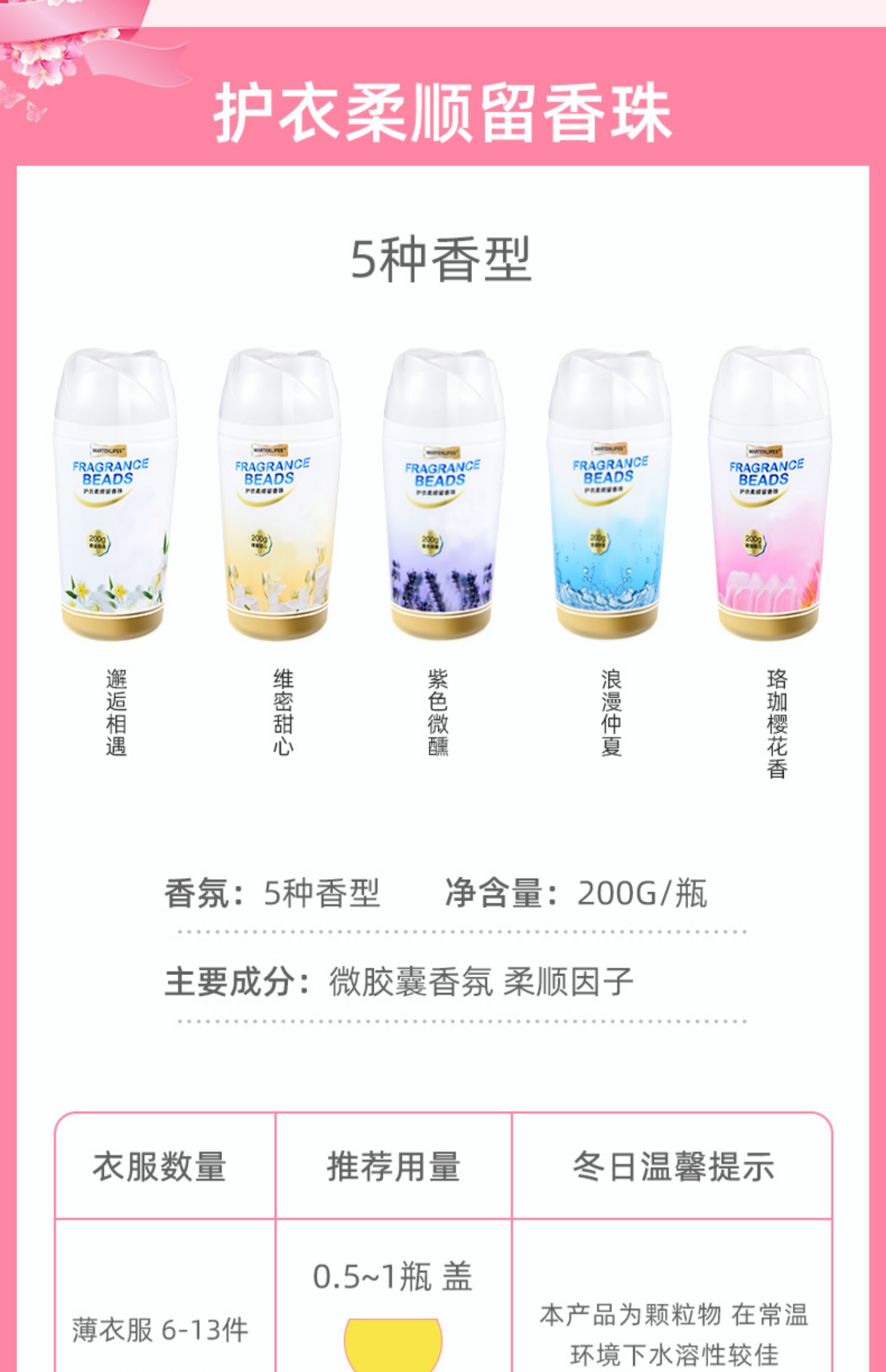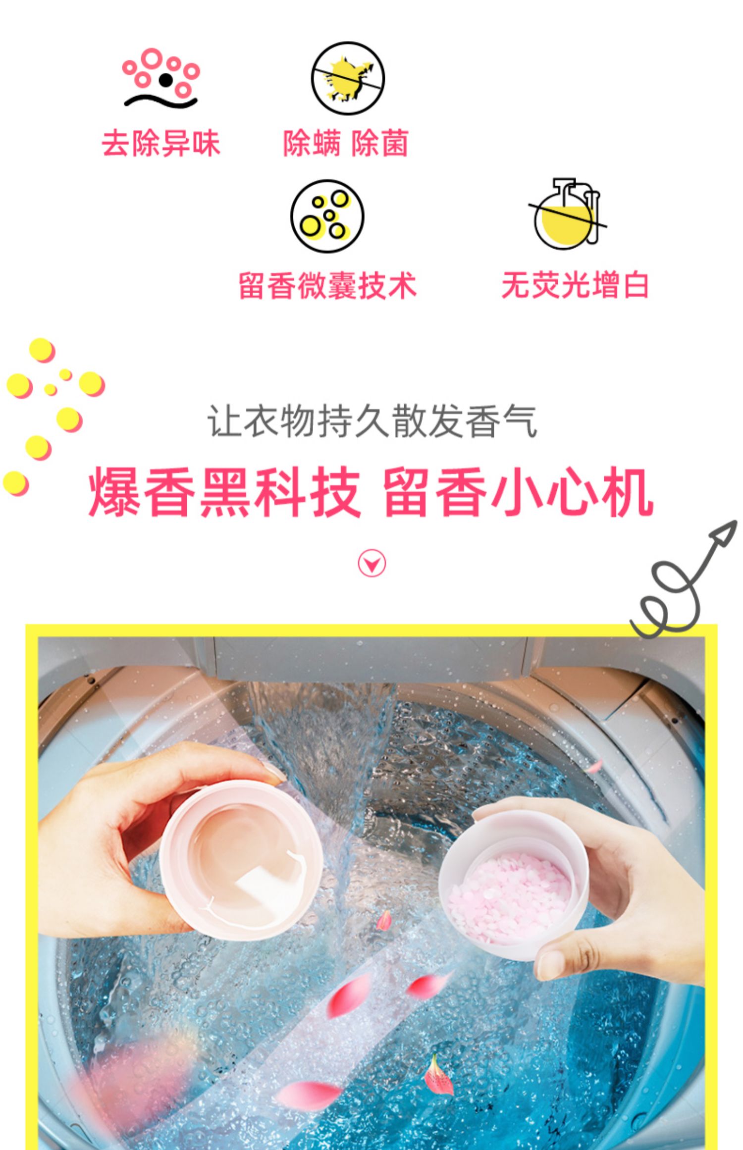 香水级洗衣伴侣;护衣留香珠超值便捷装8袋,爆香黑科技,留香更除螨。纳米微胶囊,柔顺增亮,摩擦生香,味道更持久。