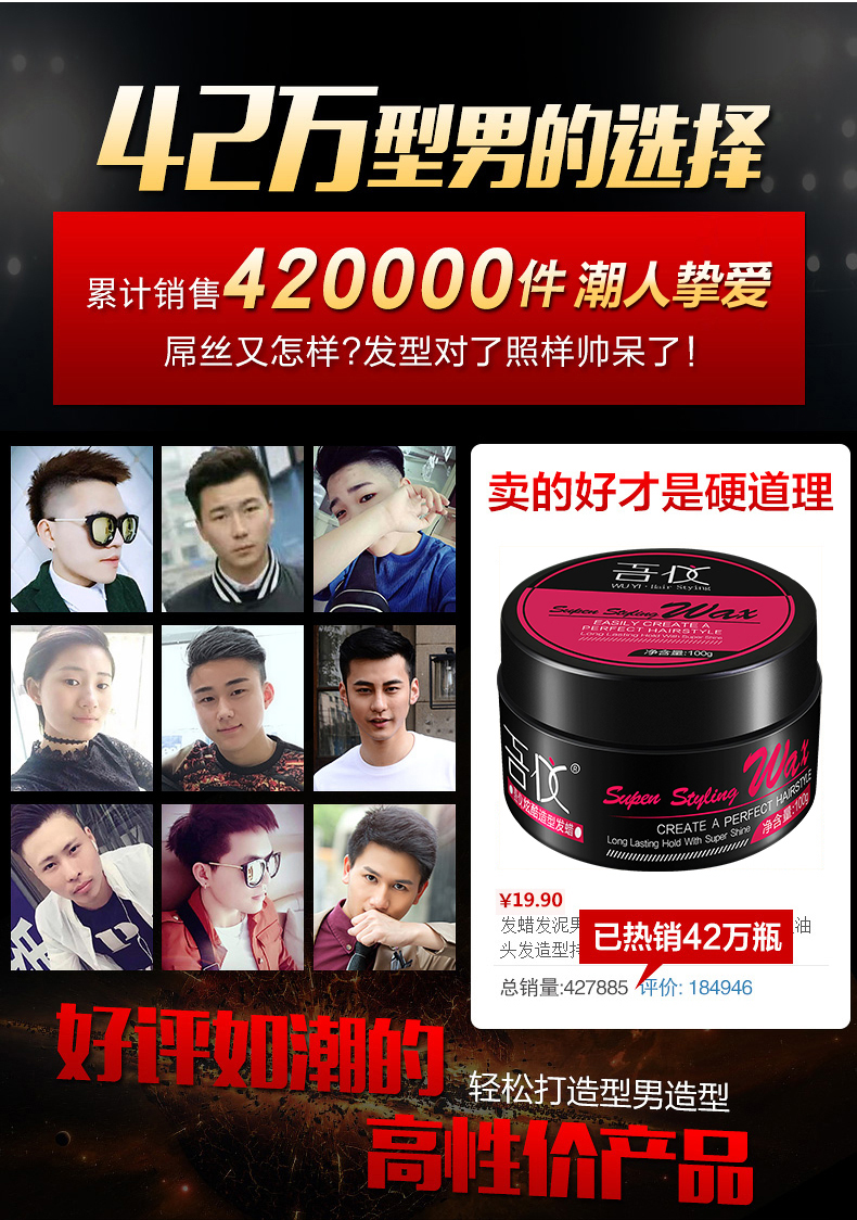 男士坚挺发蜡发泥,品质保障,加强定型,速干速定,不起白屑,持久定型,自然干爽,易于清洗,爆款热卖爆款,33万型男之选,随心变换随便换。
