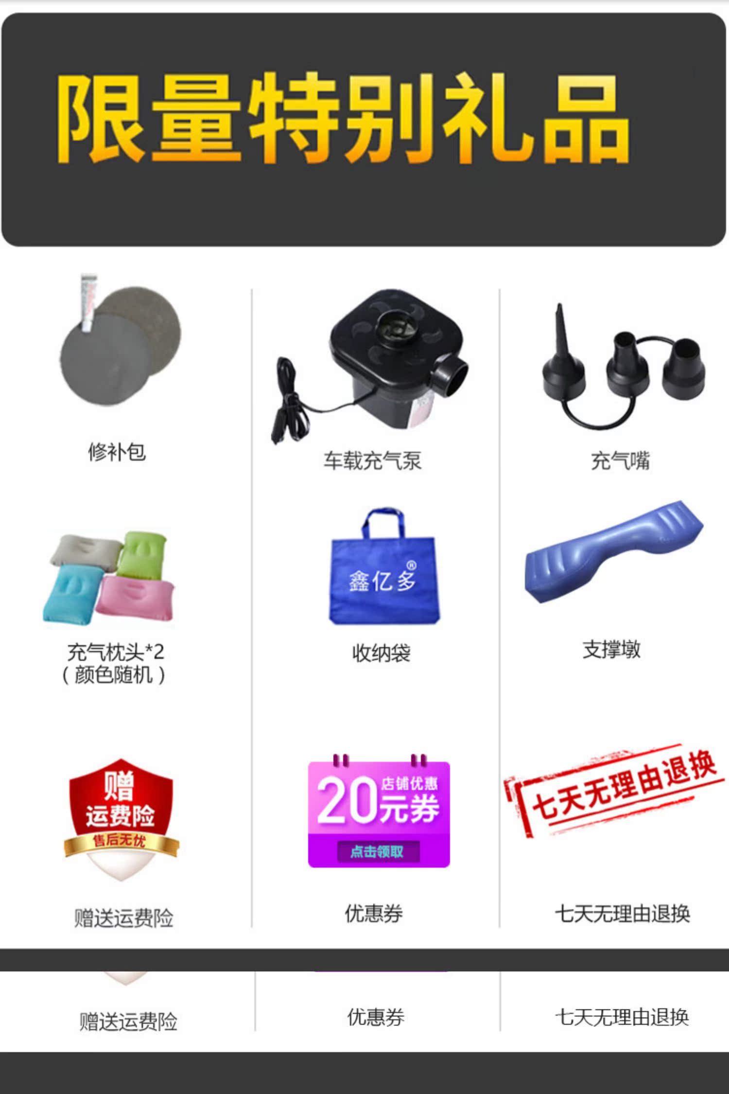 【送8件套大礼包】不易漏气,称重力强,轻松适配,柔软舒适,双档保护,适用各种车型,防水防潮,精密接缝,持久耐用,易折叠,收耐携带,贴布面料,易清洗。