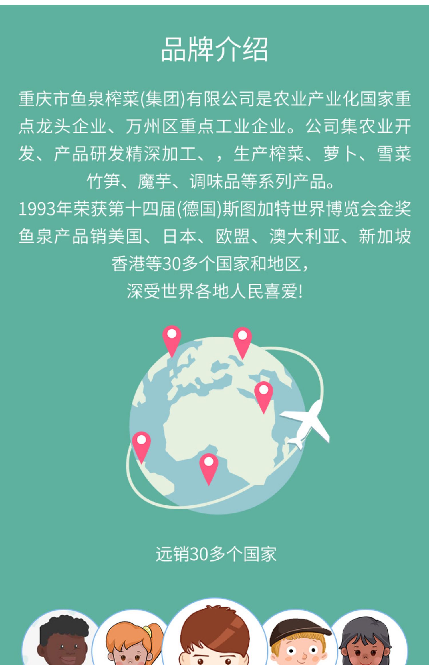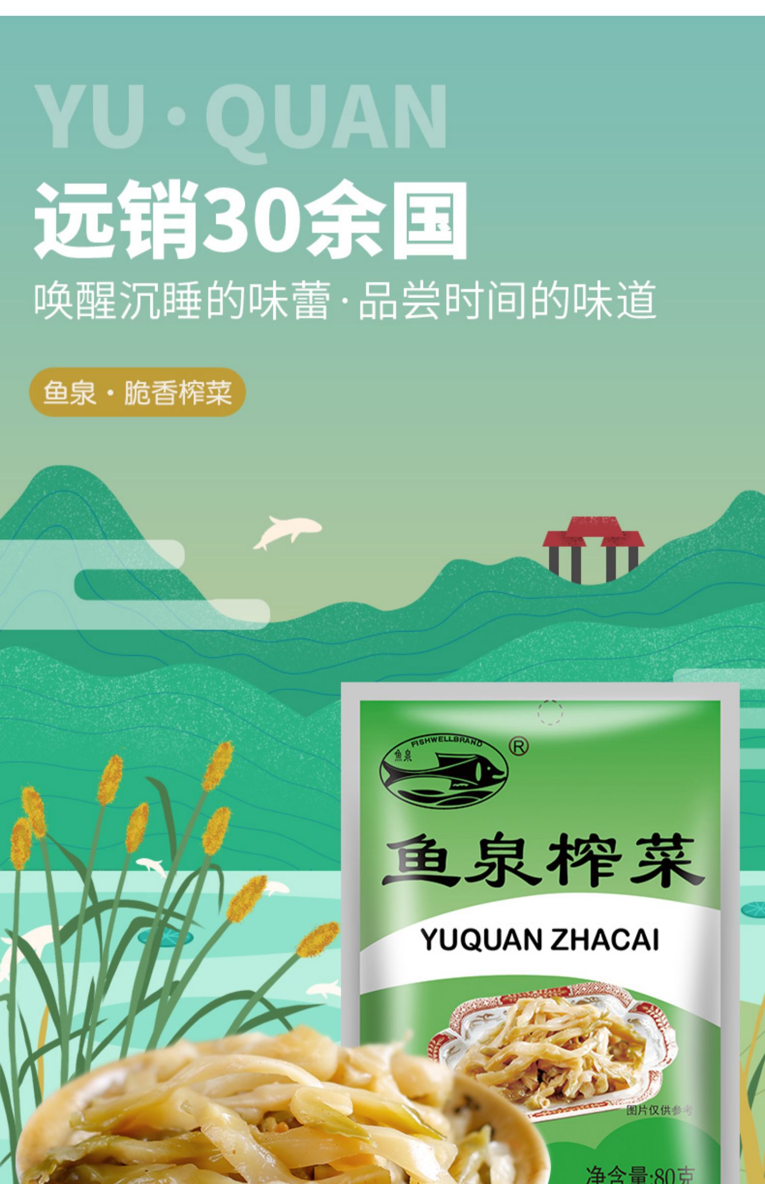 【推荐理由】家中有粮,心中不慌!鱼泉榨菜,出口级品质!鲜香脆嫩!常年出口国外30余个国家和地区。疫情在家不便出门,80gx20袋量贩家庭装,相当适合一家人食用。炒肉丝、下饭、拌面…..都妥妥的。