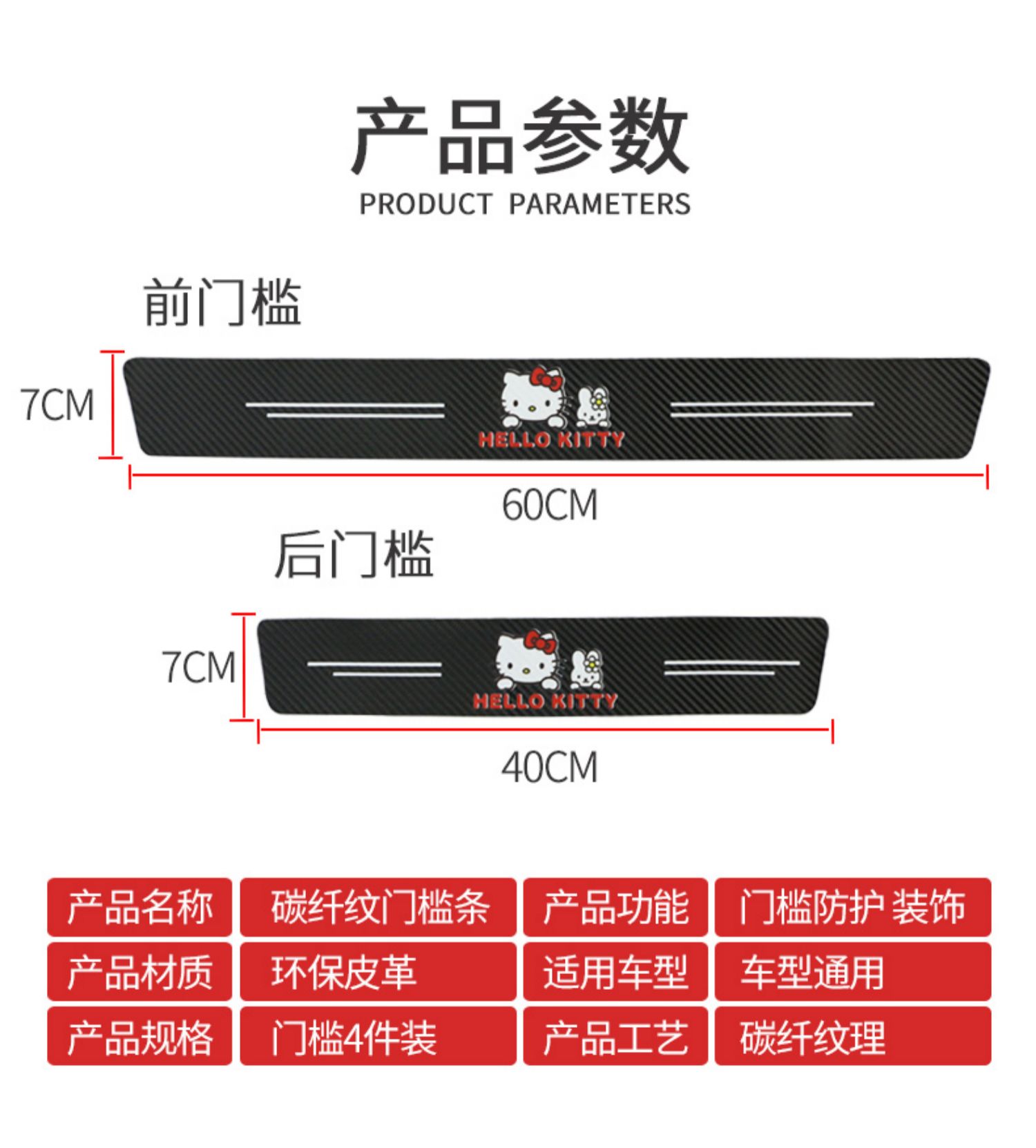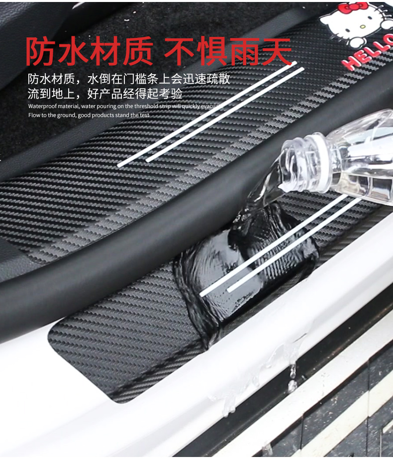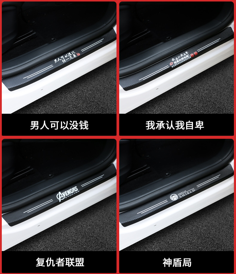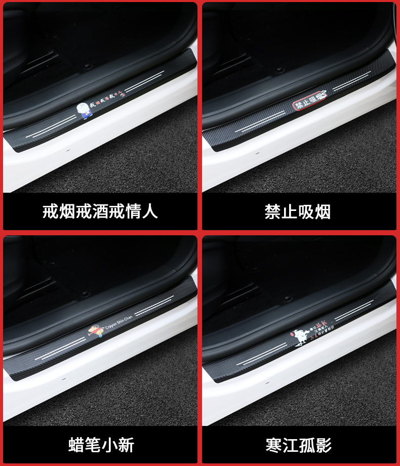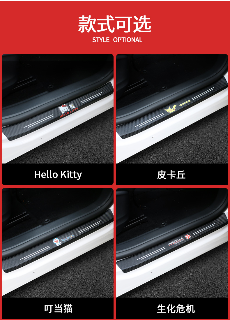 加厚材质,碳纤纹门槛条,保护原车门槛处,提升外观视觉,自带粘胶,不留胶,防水耐脏,防刮耐磨,多种图标可选,个性创意,可爱动漫,美观时尚,满足您的需求!