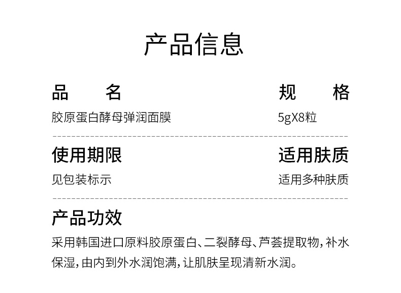 英珂胶原蛋白二裂酵母睡眠面膜,Q弹质地,轻松吸收,一敷就成膜!提取酵母精粹,紧致修复,补水保湿,美白提亮于一身!轻松敷出蛋蛋肌,让好皮肤脱壳而出!