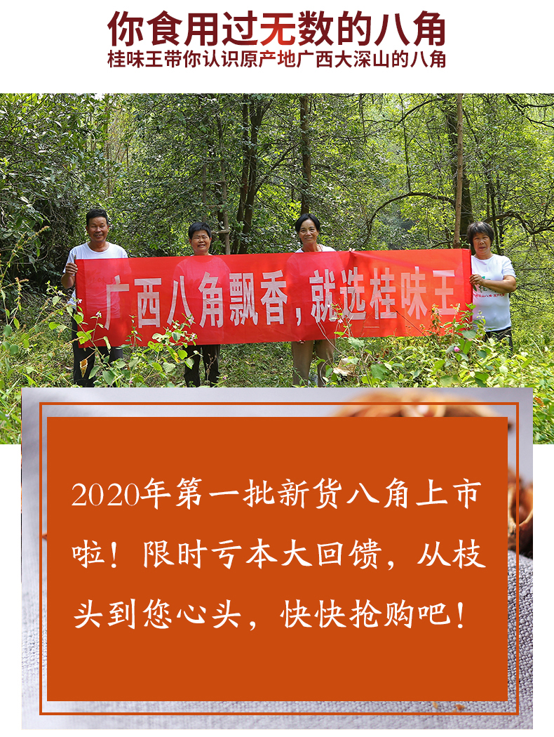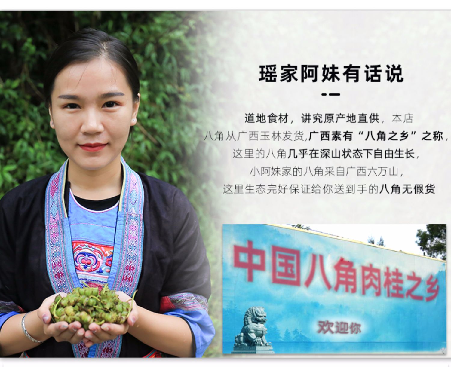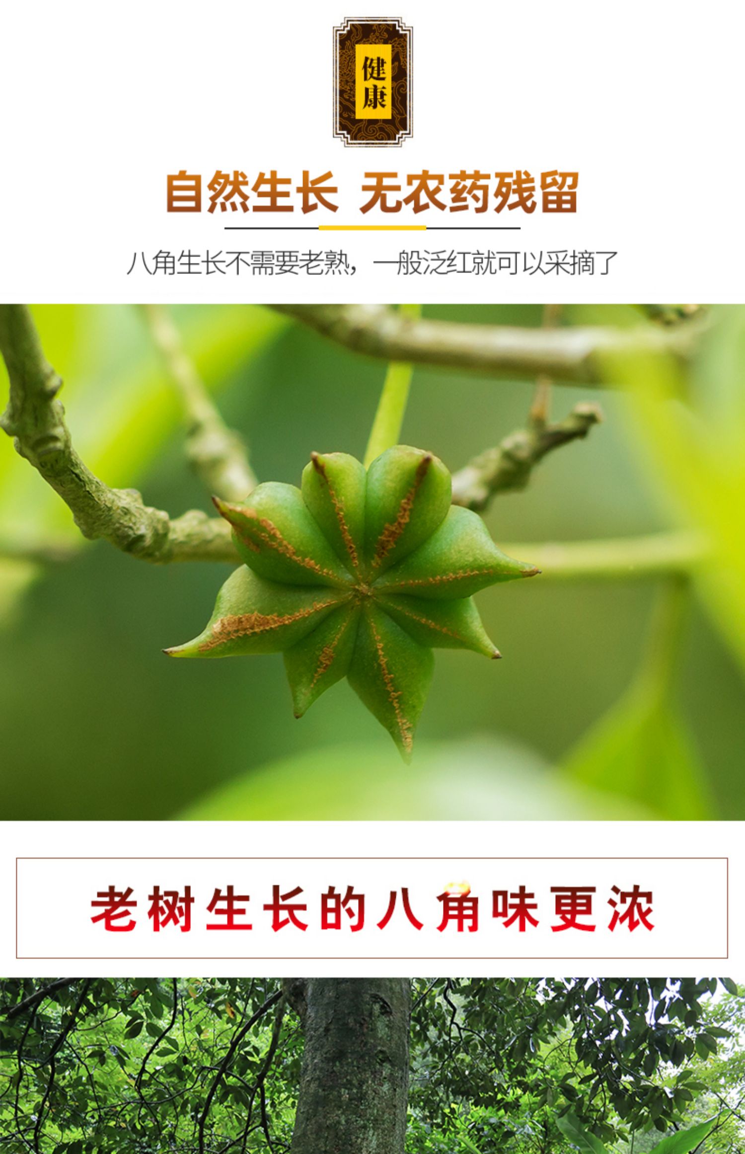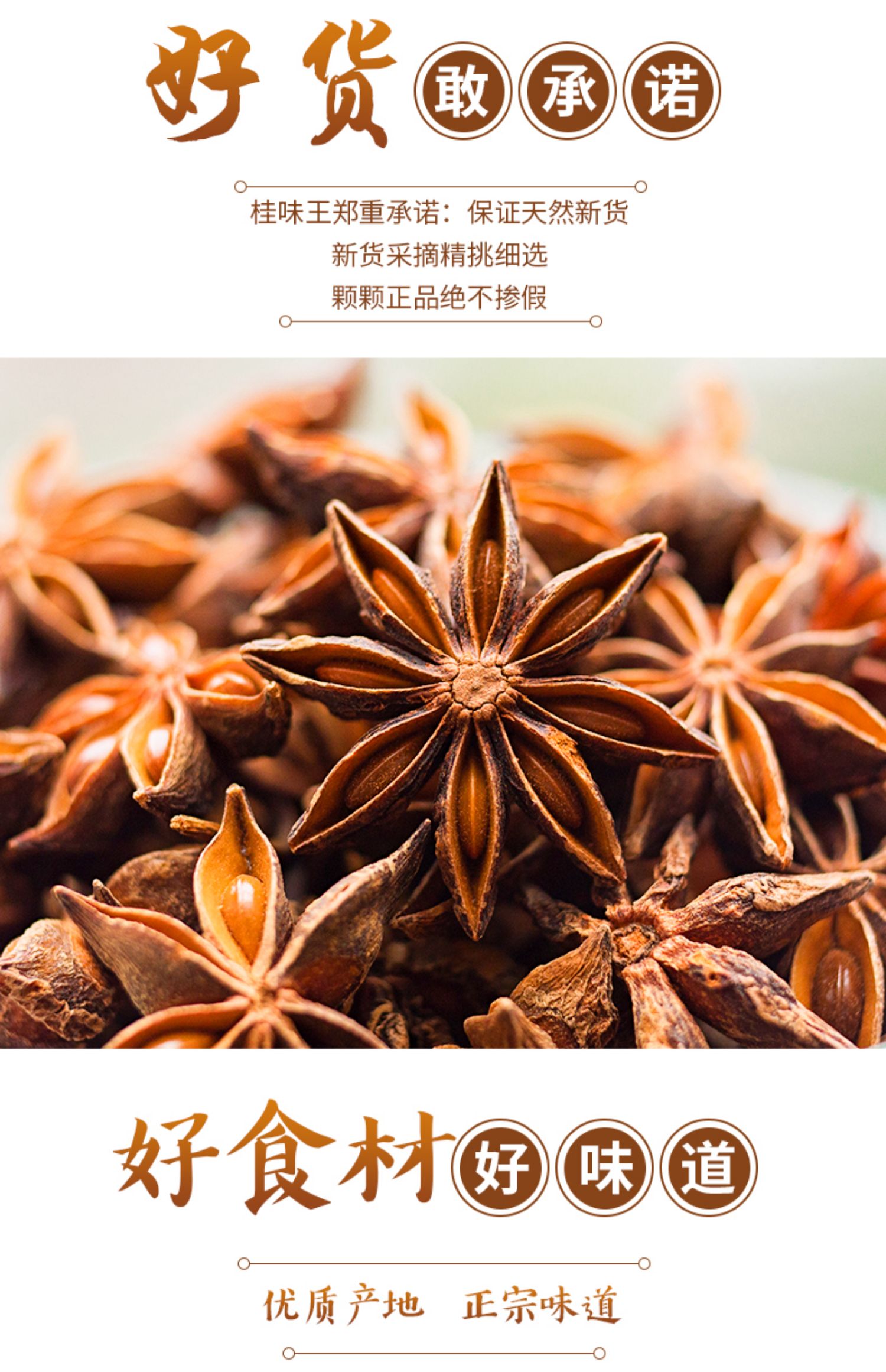 八角为著名的调味香料,味香甜。在日常调味中可直接使用,如炖、煮、腌、卤、泡等,也可直接加工成五香调味粉。通常用于肉类制品、调味品、烘烤.家里常备,自己动手做美味佳肴!