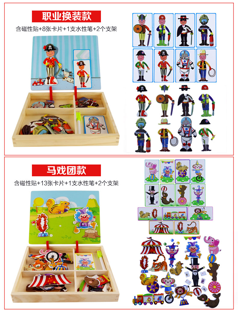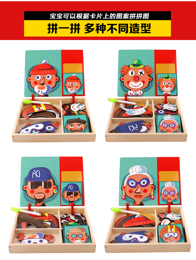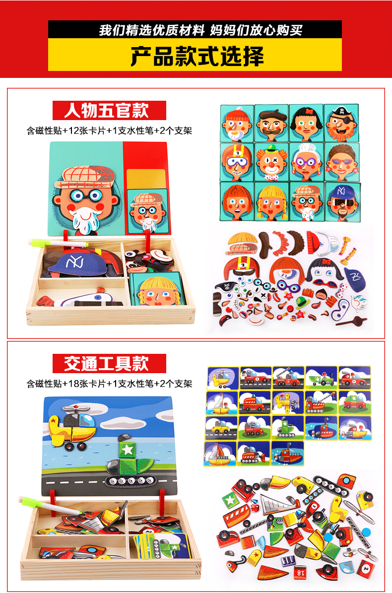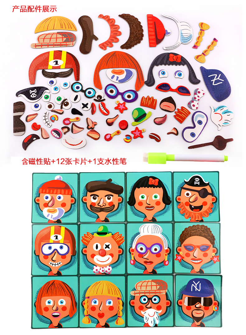 儿童早教拼图磁铁书拼拼乐玩具,内含磁性贴、卡片、水性笔和支架!精选优质材料,安全无毒,背面带磁铁,随意摆放多种造型。多种玩法,激发孩子想象力、锻炼孩子专注力逻辑力!