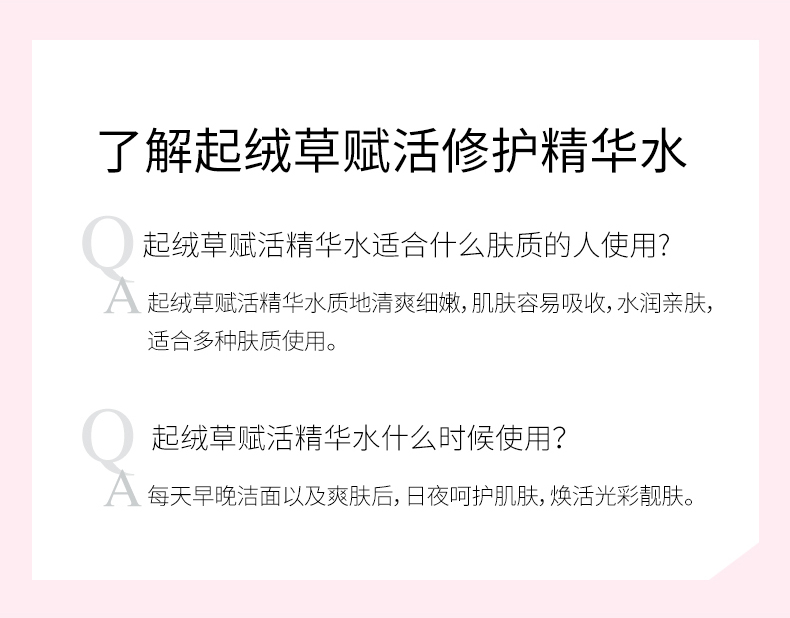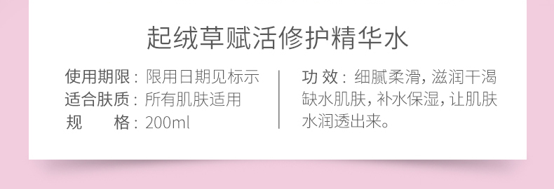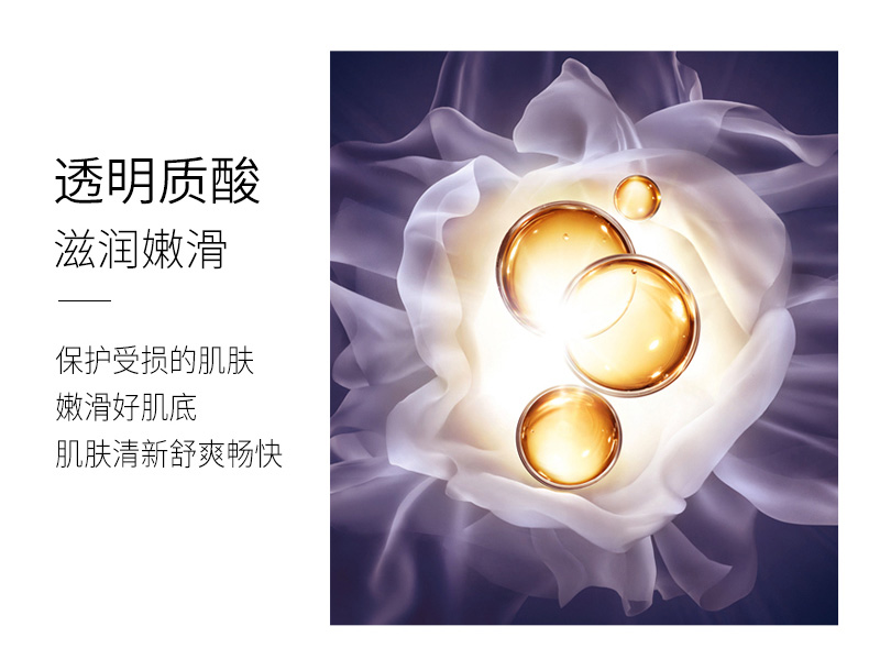 修护皮肤,提靓肤色,补水保湿,细致毛孔,改变暗沉发黄,透明质酸,滋润嫩滑,促进护肤品的吸收,共同守护青春美肌!