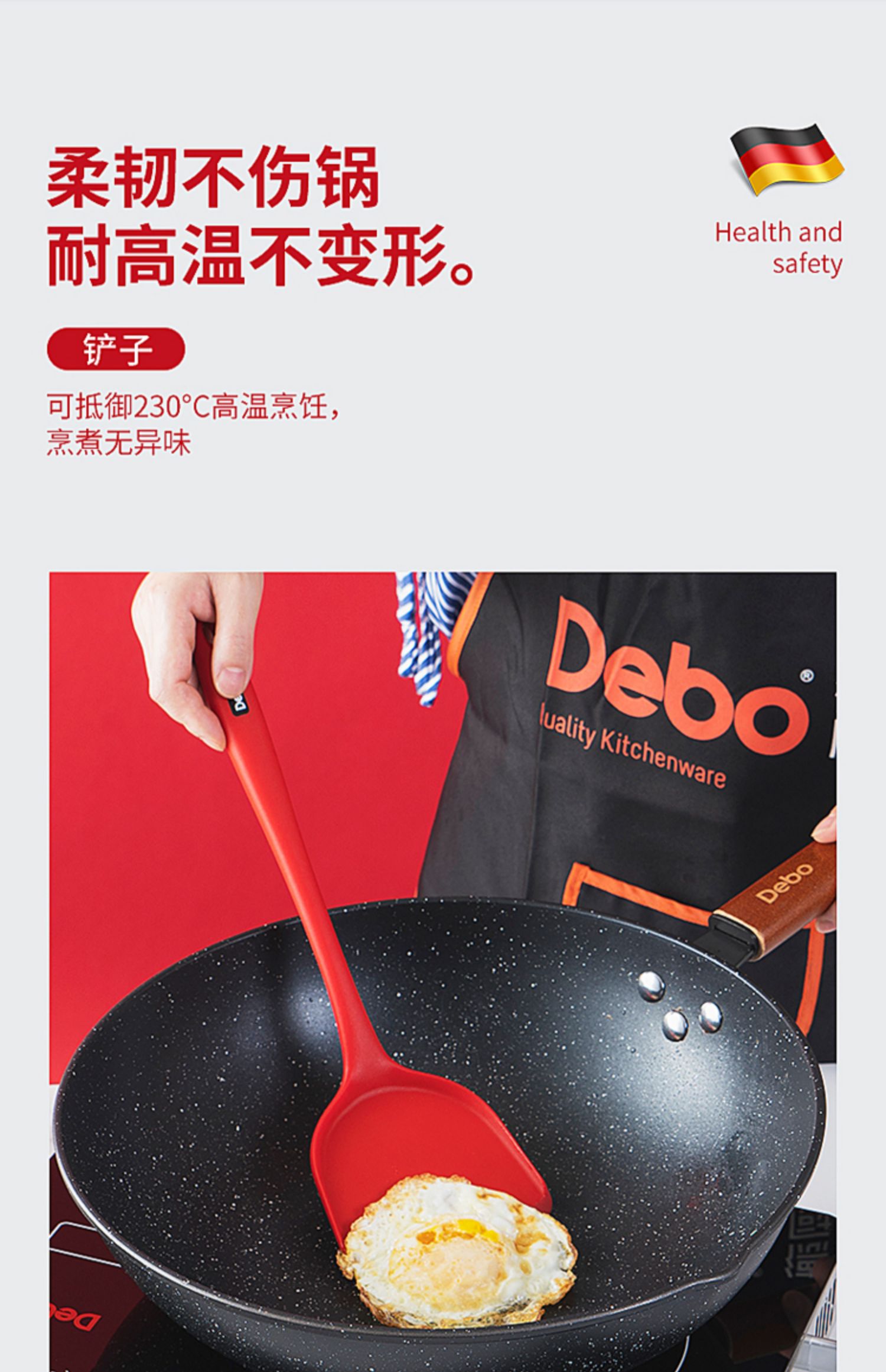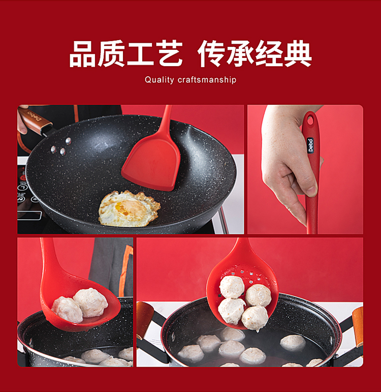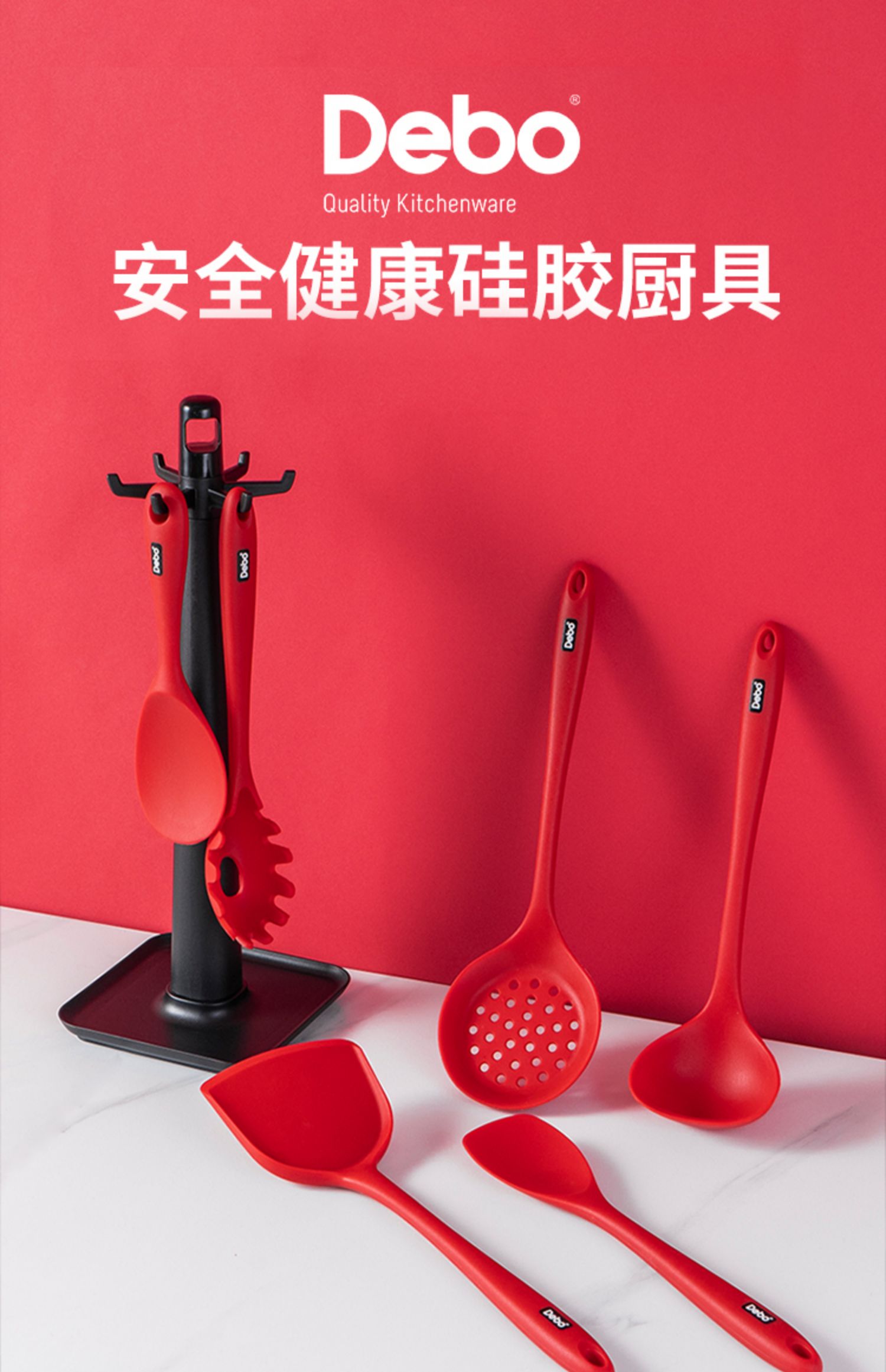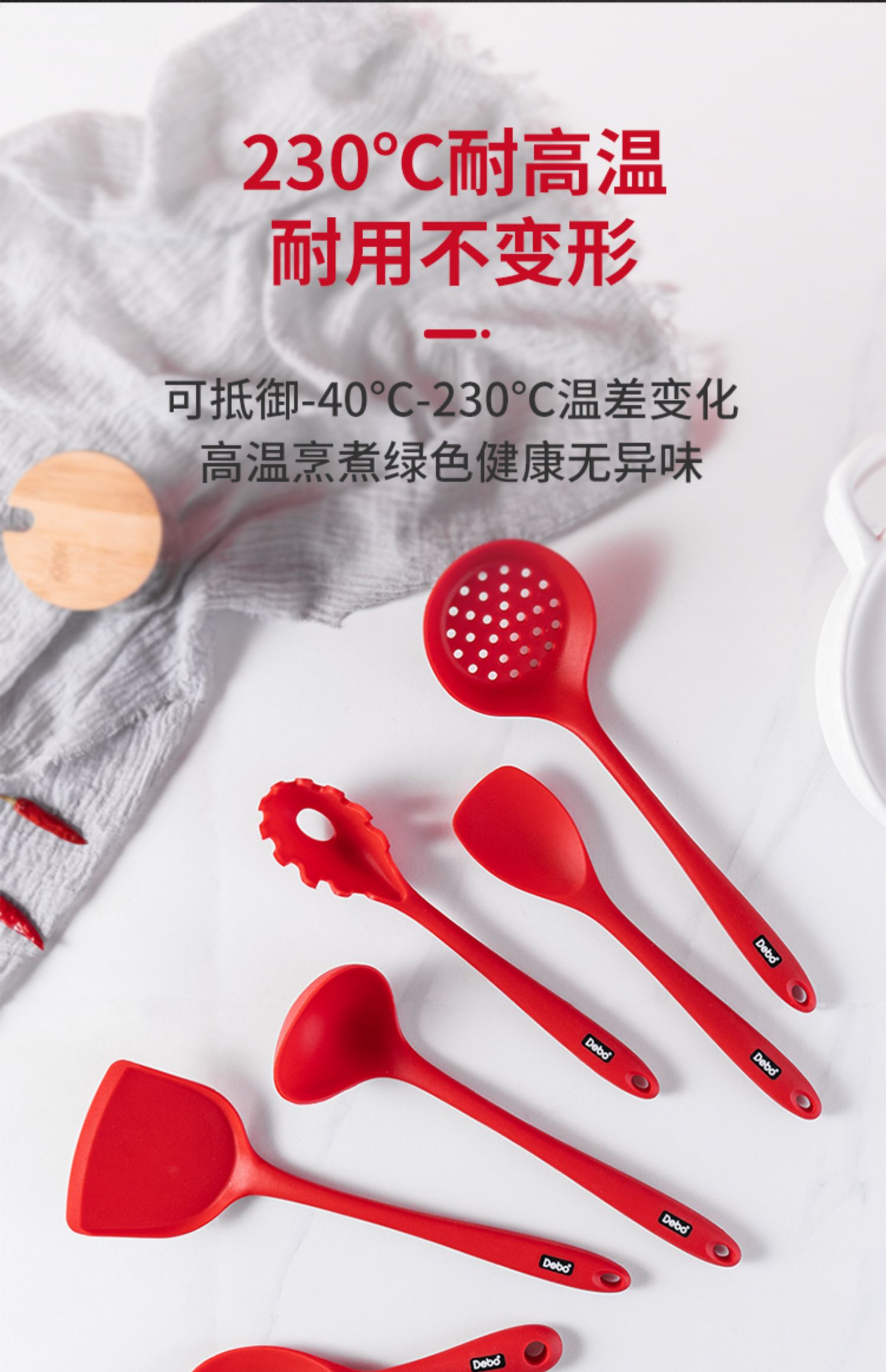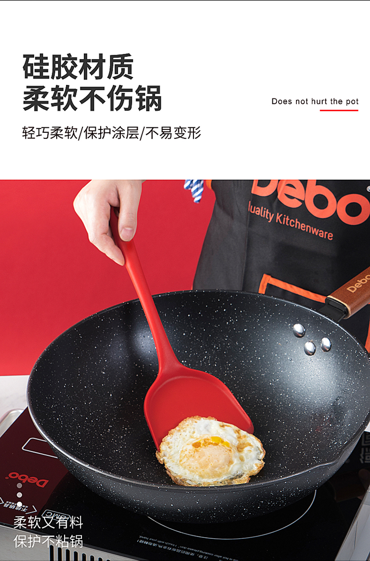 【DEBO】安全健康硅胶厨具,易清洗、无异味、不易变形、高温耐热、不伤锅皿,硅胶材质,柔软不伤锅,轻巧柔软,保护涂层,不易变形。食品接触用硅胶,婴儿般呵护。