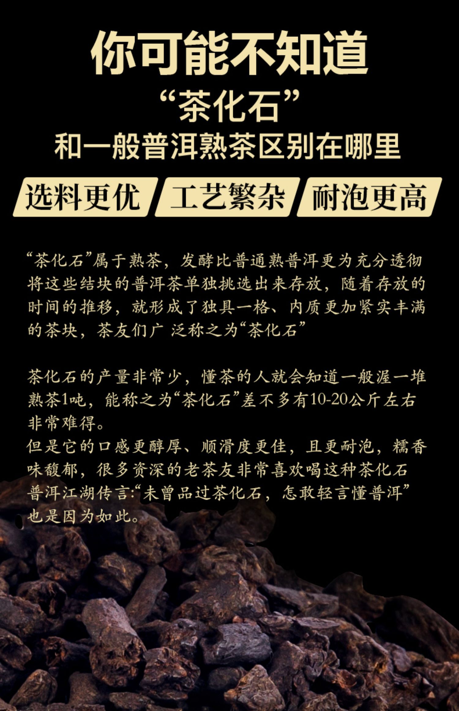 百年古树,乌润透金,精华浓缩,精心甄选云南原产好原料,内质丰富,汤质饱满香高,口感绵滑。茶化石性温和,对胃是有好处的,也是养身之选,自饮送礼都是不错的选择!