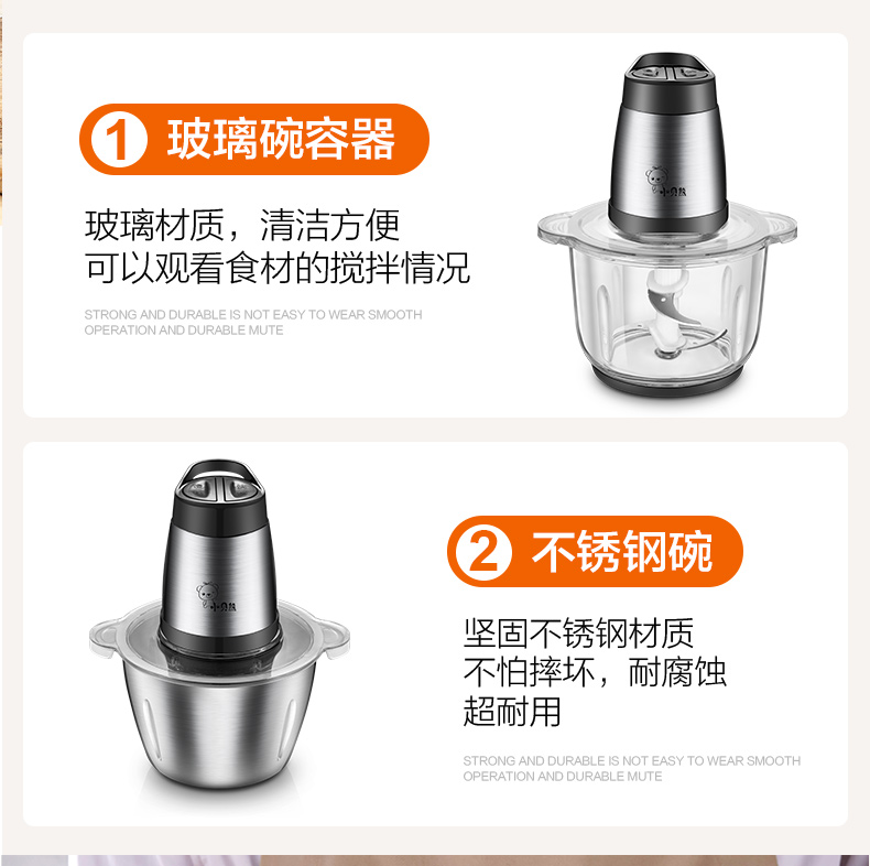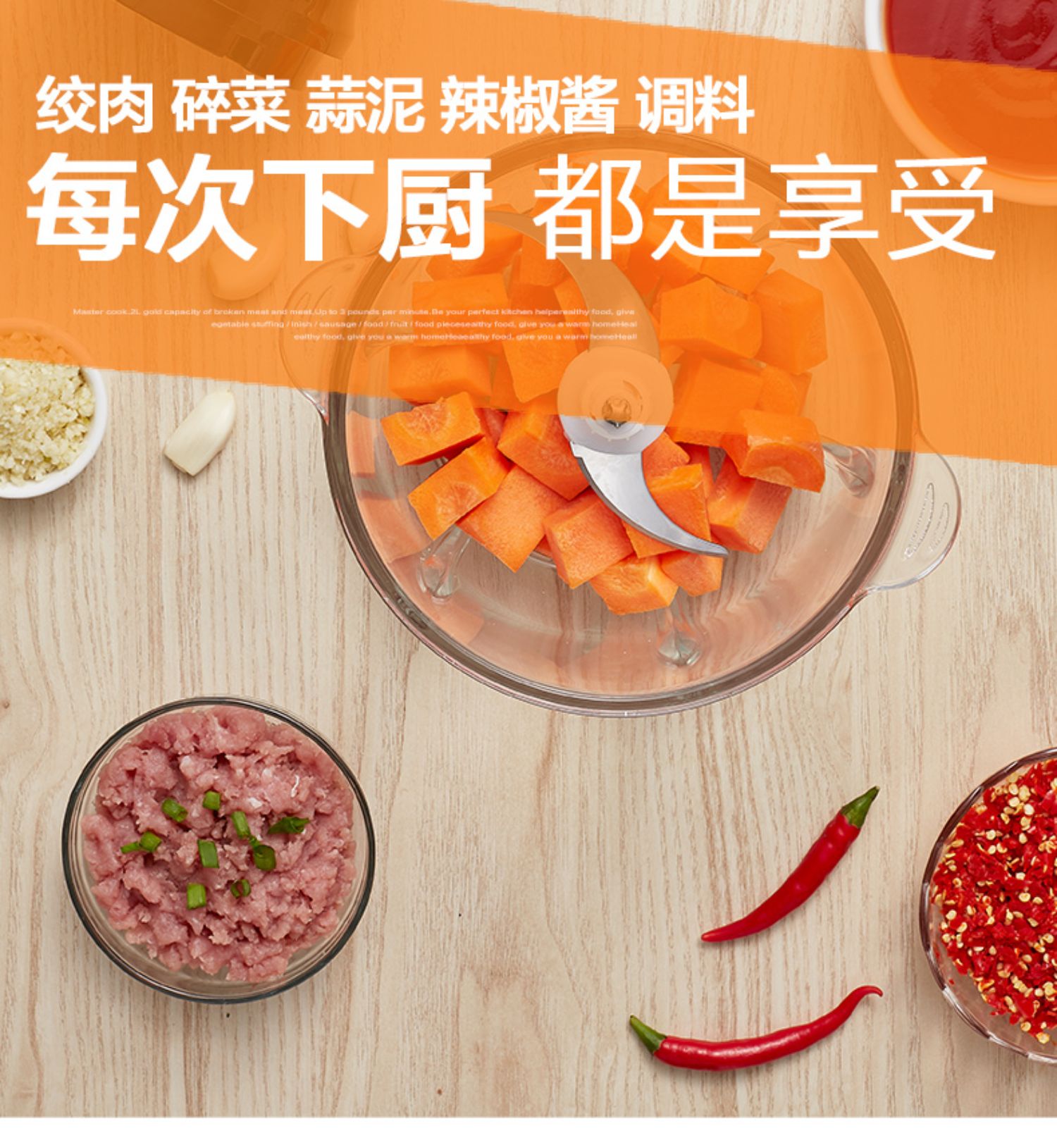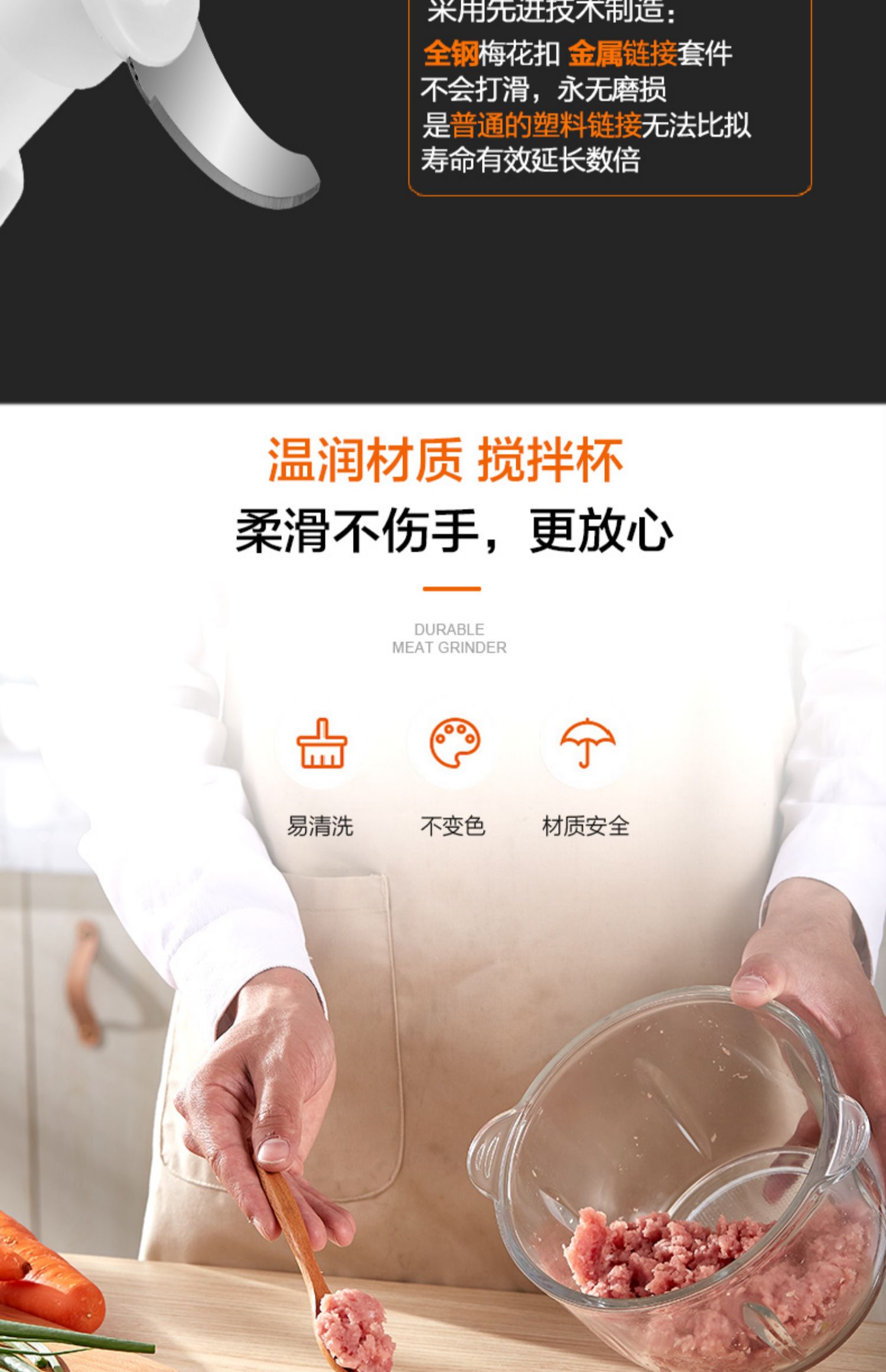 2升大容量,一次绞肉800克,不锈钢刀片,锋利切碎不易钝,两档切碎,300瓦铜质电机,松手即停保护,可拆卸设计,隐藏式童锁。安全好用又放心,快快抢购吧!!