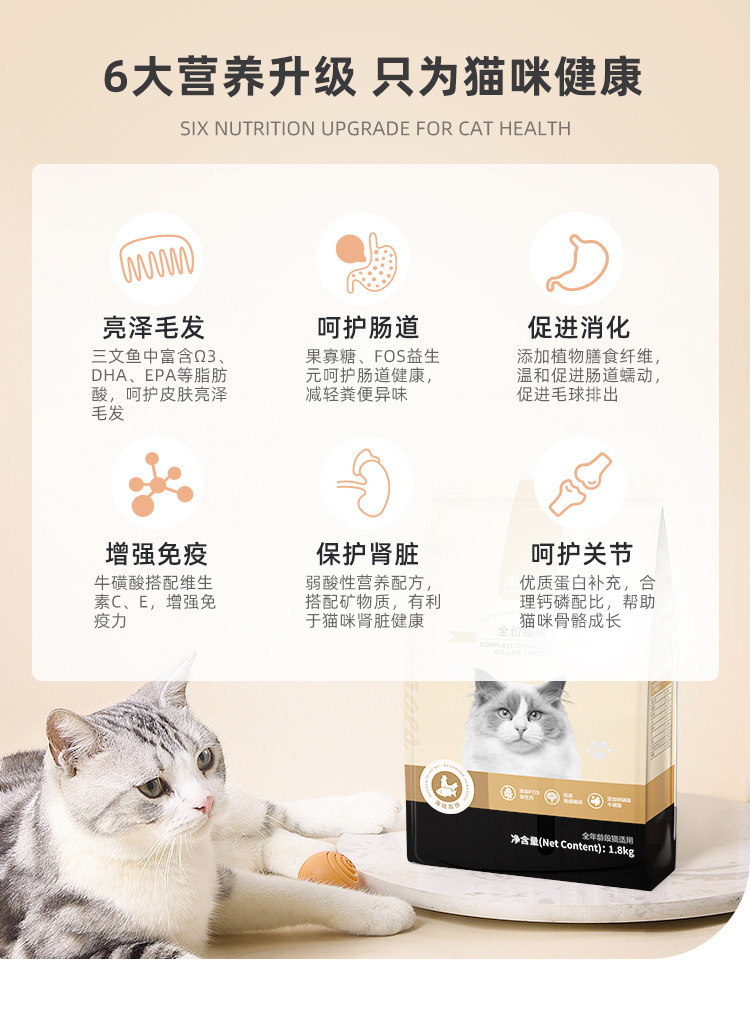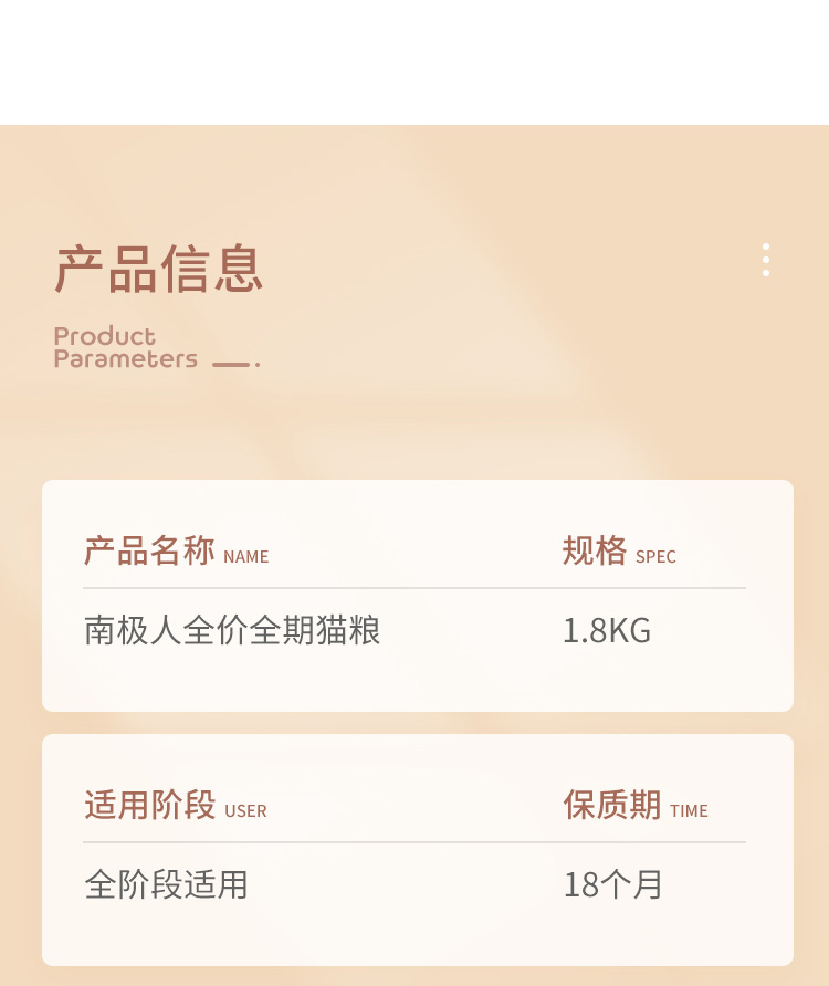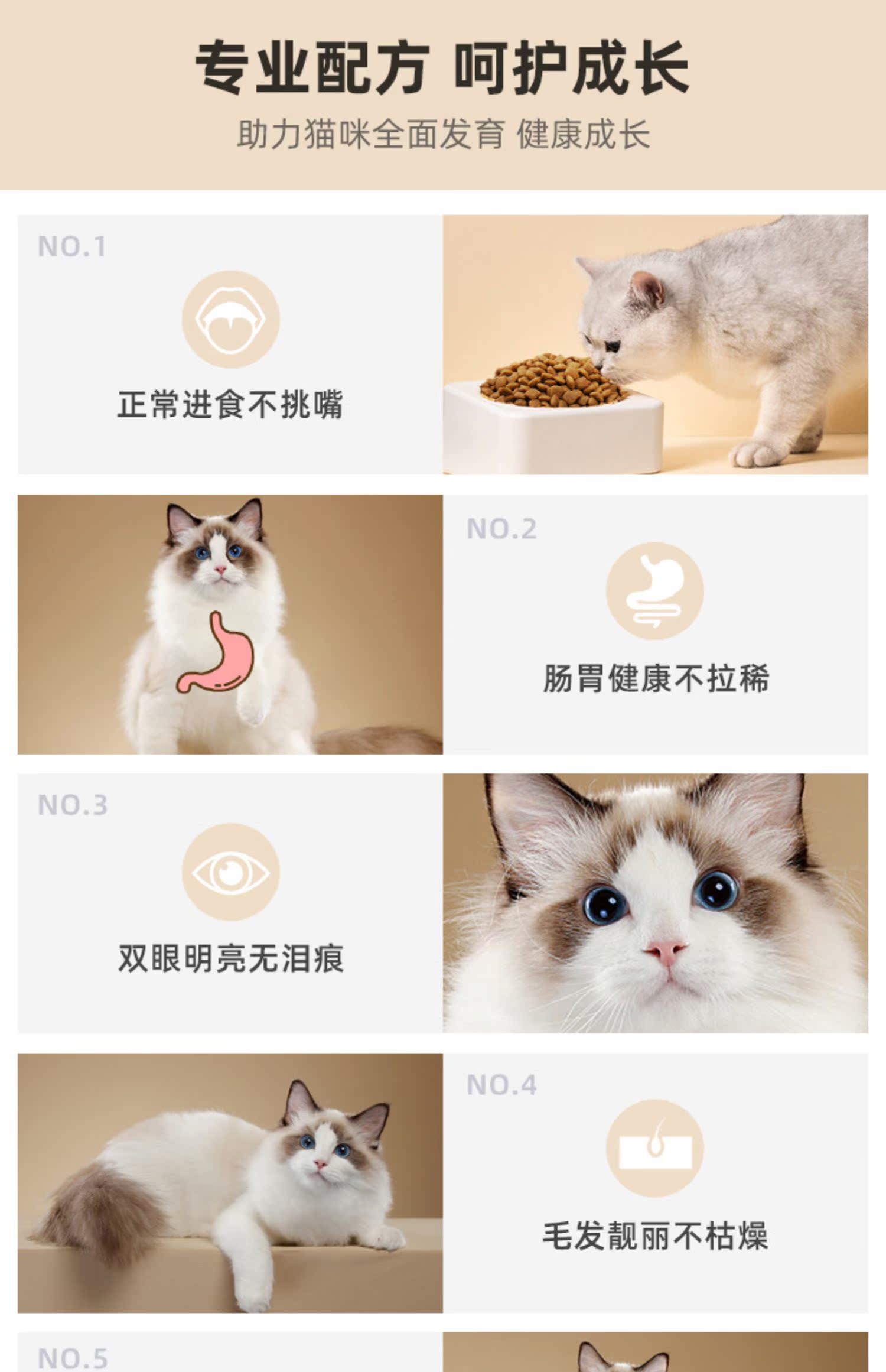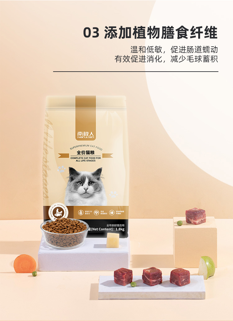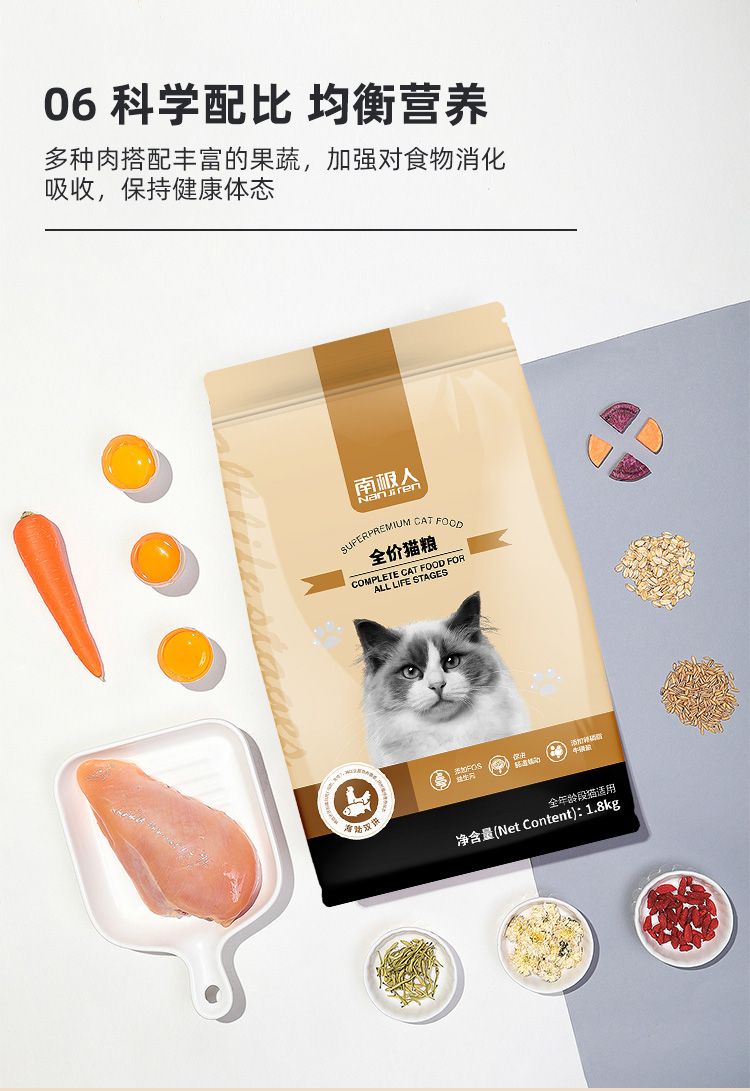 22°/。新鲜走地鸡+13°/。深海金枪鱼,添加FOS益生菌,科学配比,改善皮肤健康,促进肠胃消化,均衡营养~