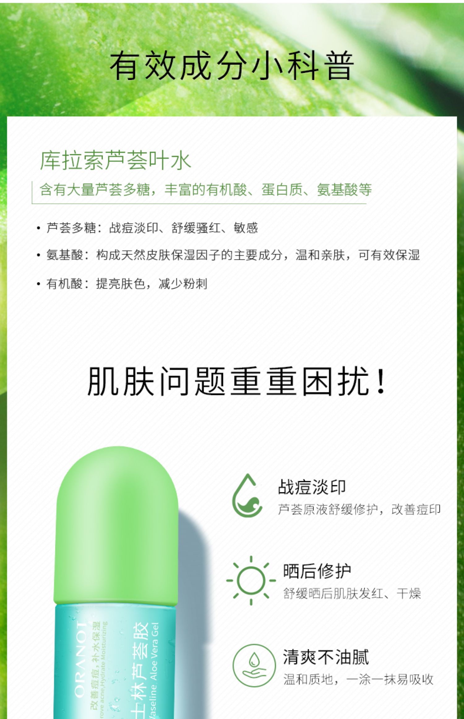 满脸痘的“救场药丸”,奥兰诺祛痘芦荟凝胶!库拉索芦荟提取物,温和舒缓敏感肌肤,清爽不油腻,补水嫩肤,从此赶走痘印,粉刺等问题,让你大胆秀出素颜美!