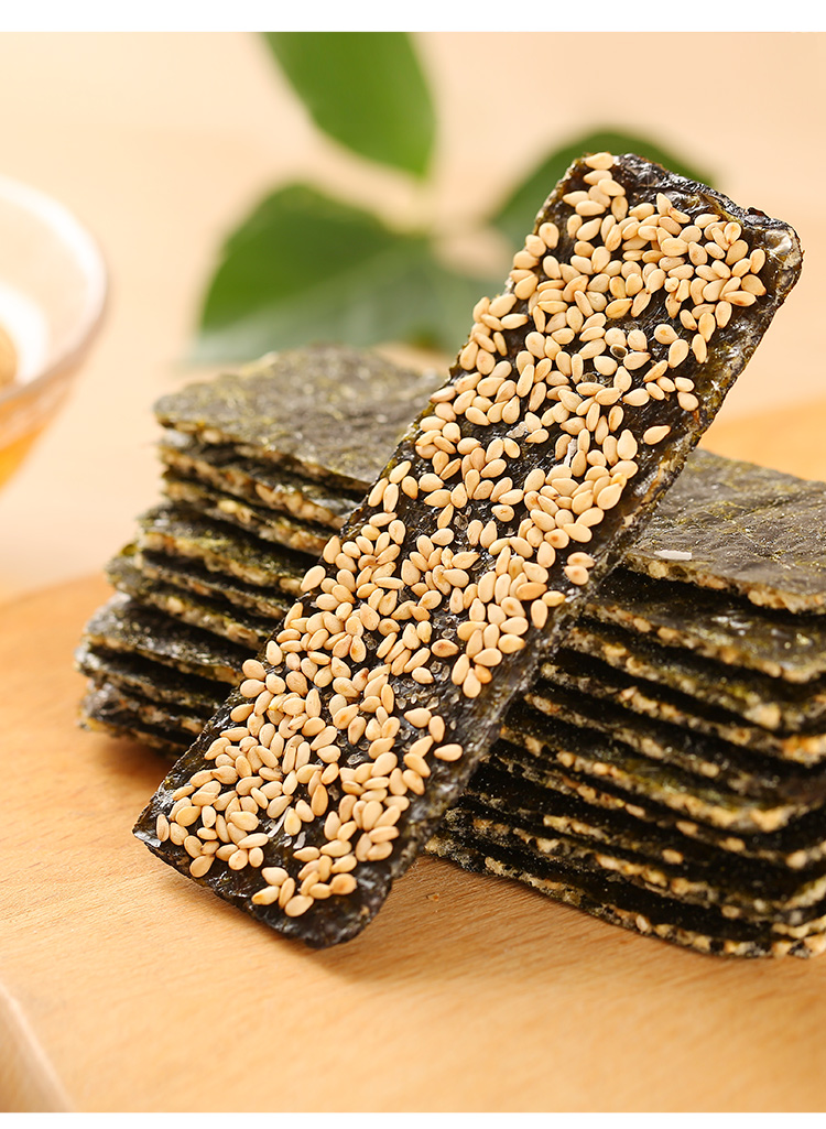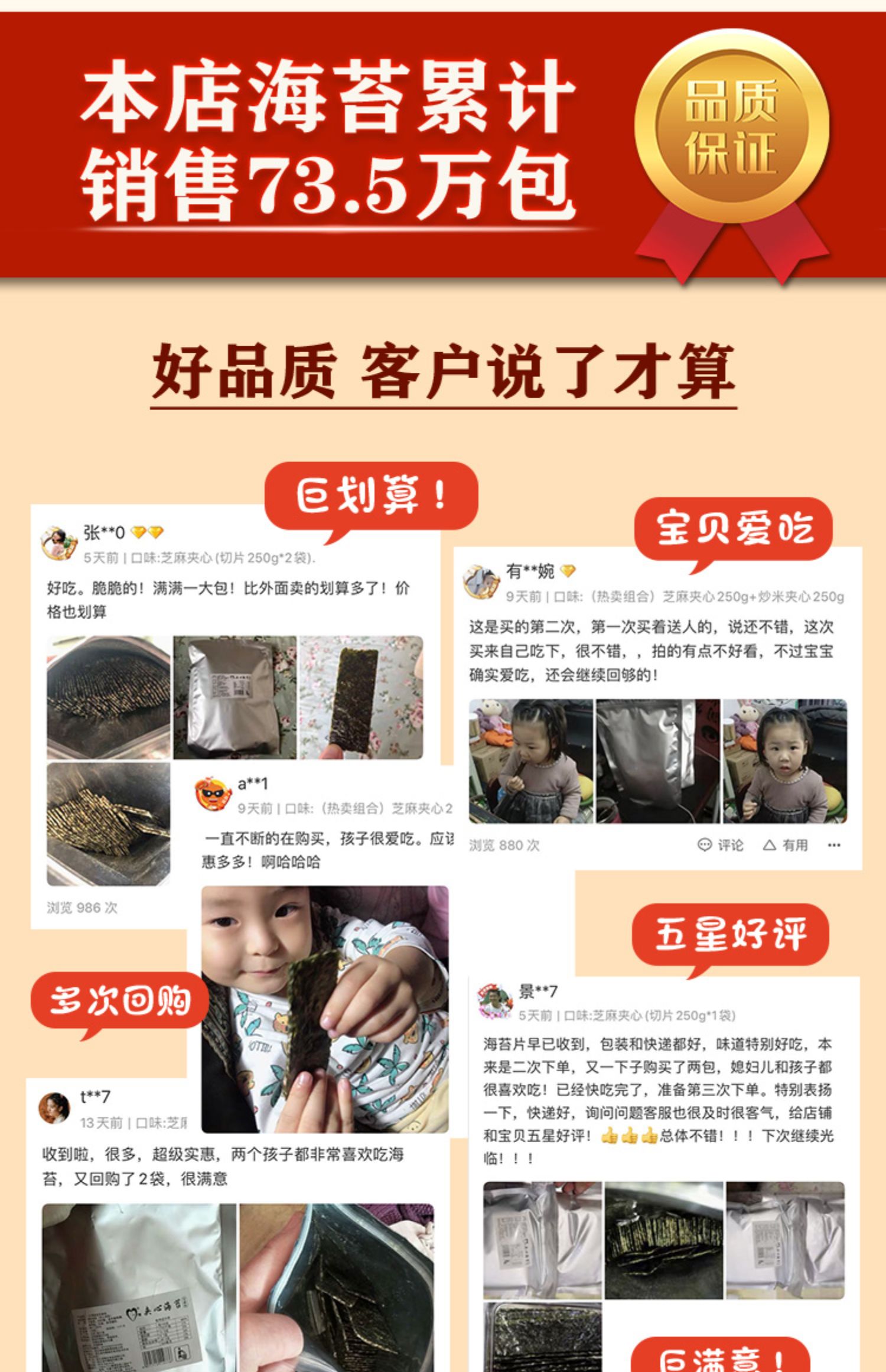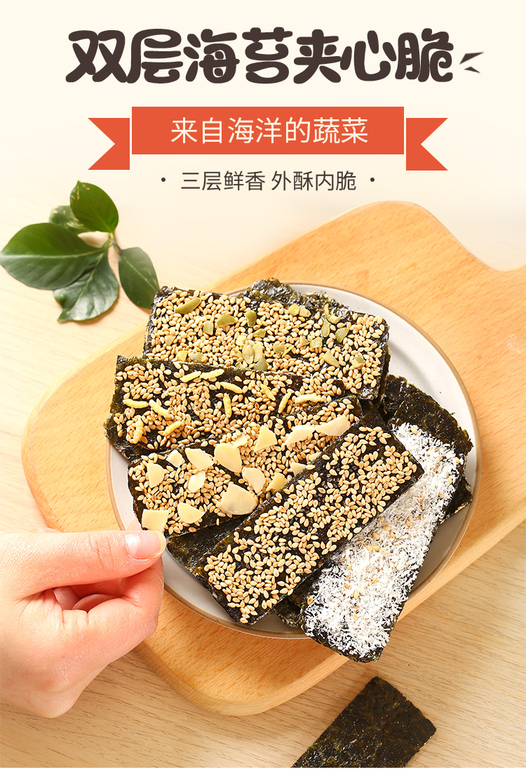海苔的味道很重要,是我喜欢的,比超市便宜太多!芝麻海苔夹心脆大包装125g,富含多种维生素,钙,铁,锌,营养丰富,大人小孩都爱吃!【赠运费险】