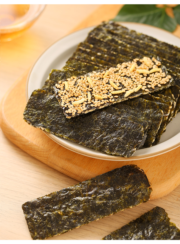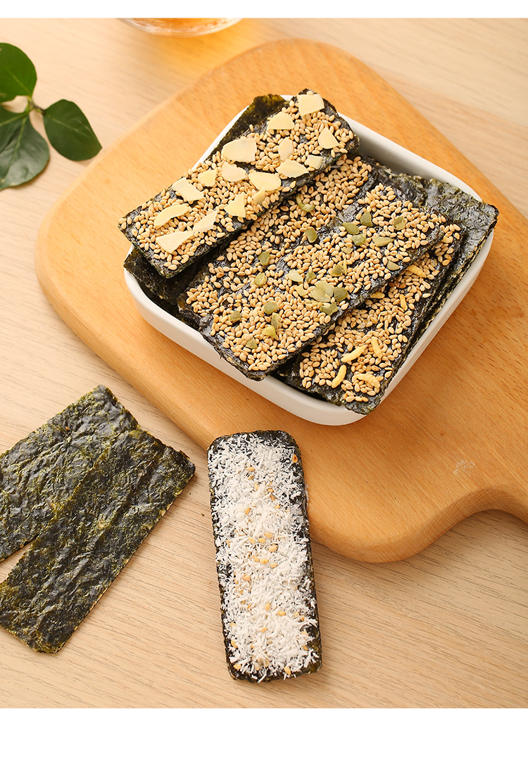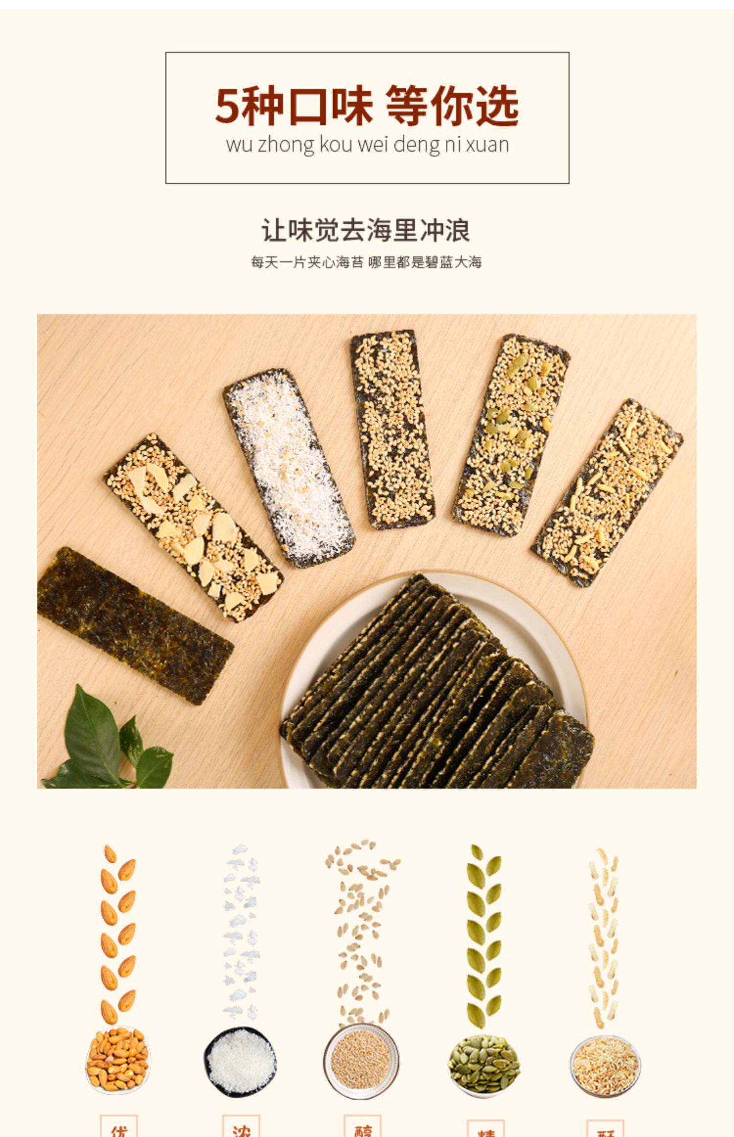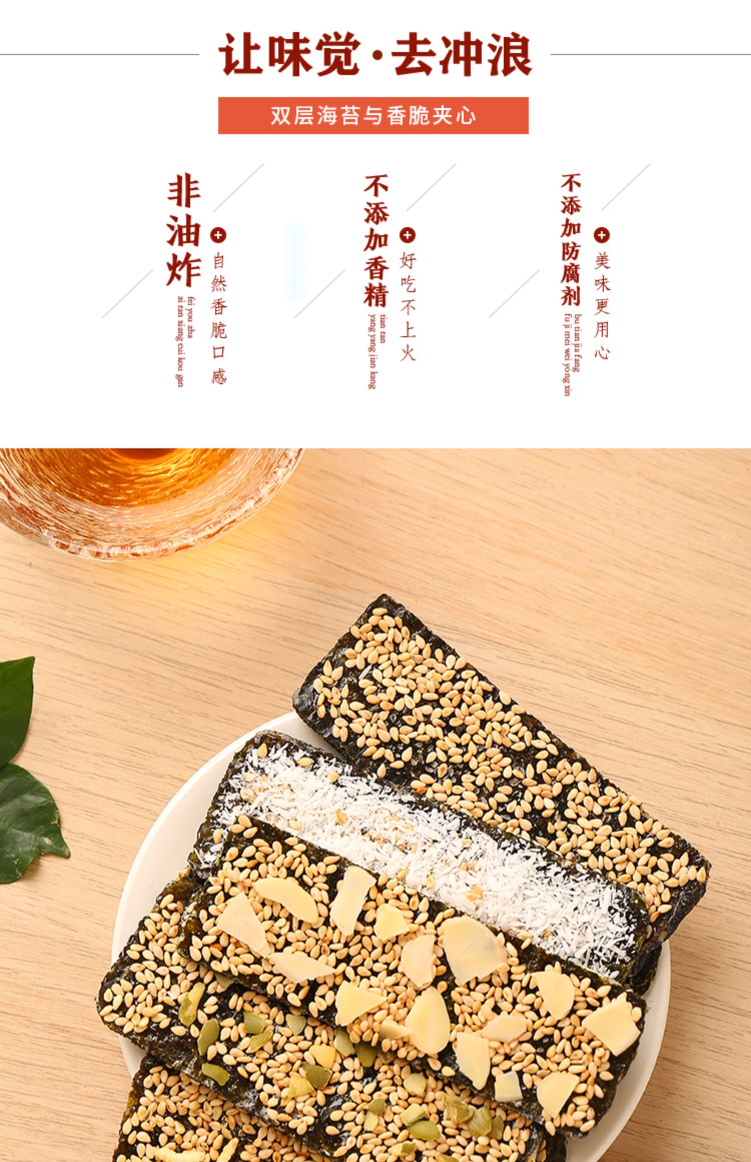 海苔的味道很重要,是我喜欢的,比超市便宜太多!芝麻海苔夹心脆大包装125g,富含多种维生素,钙,铁,锌,营养丰富,大人小孩都爱吃!【赠运费险】