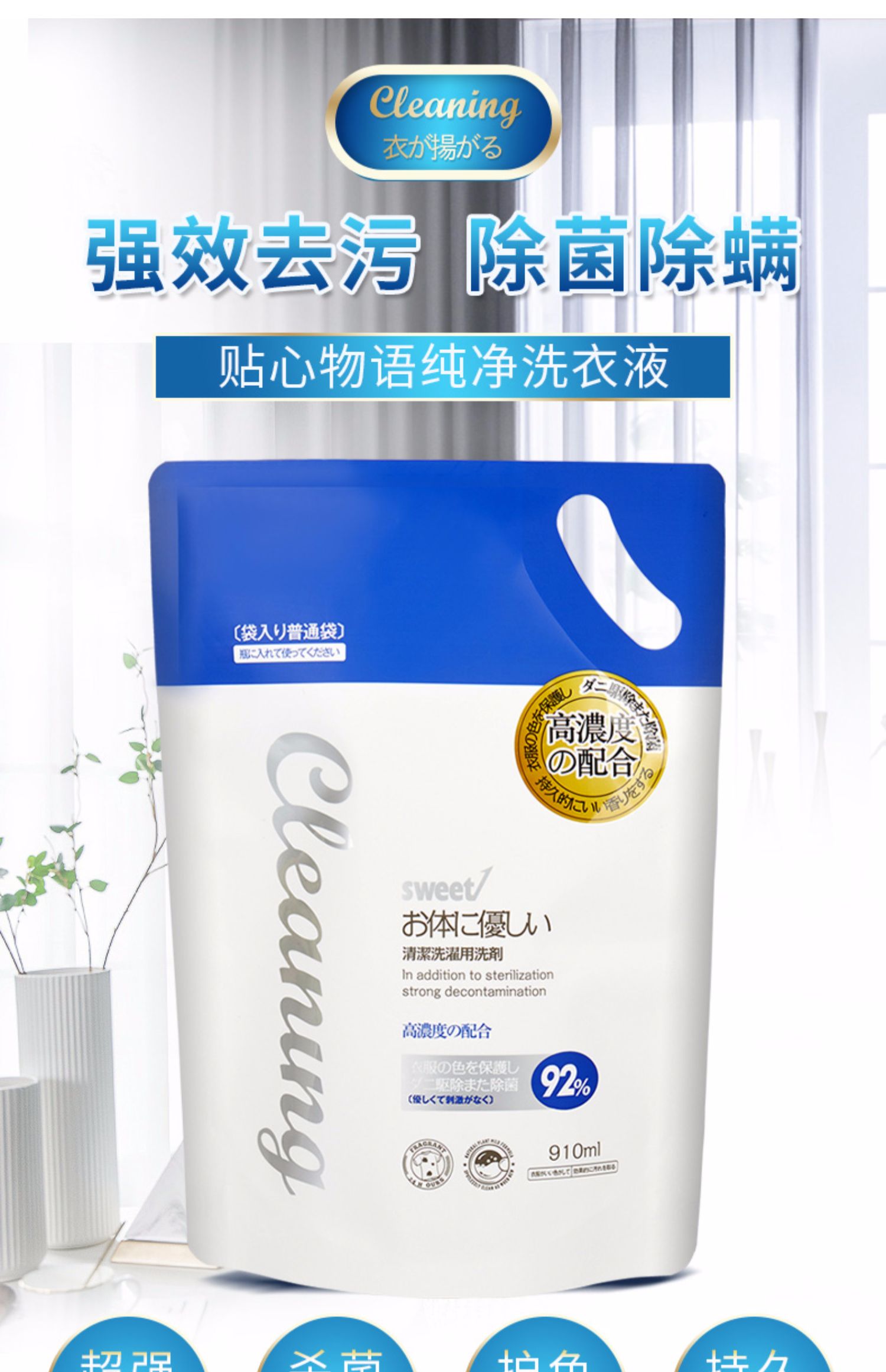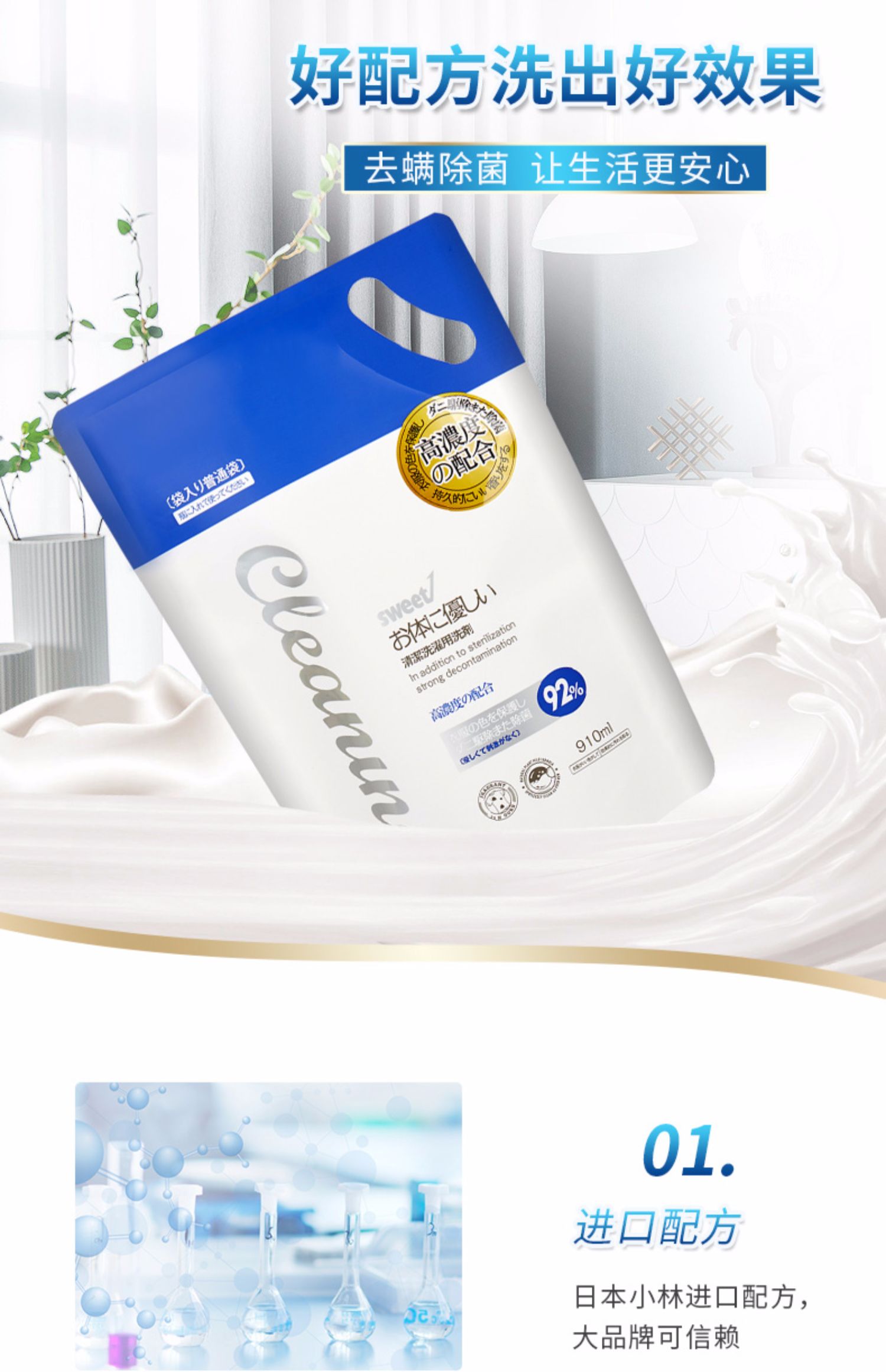 日本进口洗衣液,超级除螨,天然植物萃取精华,柔软馨香,超强去污,无磷洗衣不伤手,不含荧光剂,低泡易漂无残留,母婴衣物都可用,易洗易清易过水!