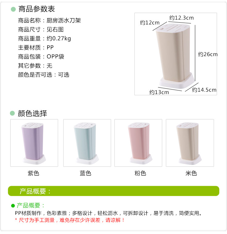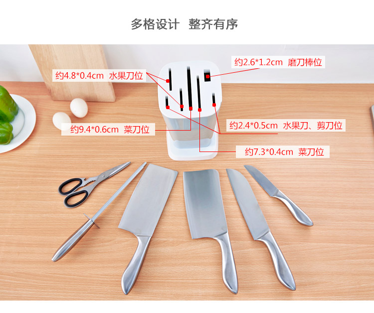 大容量收纳刀座,优质pp材质,健康环保,手感舒适,稳固摆放,承重力强,拿取方便易清洗,一件抵多件,坚固耐用,适合各种刀具,收纳更便捷,美观大方得体。居家必备!